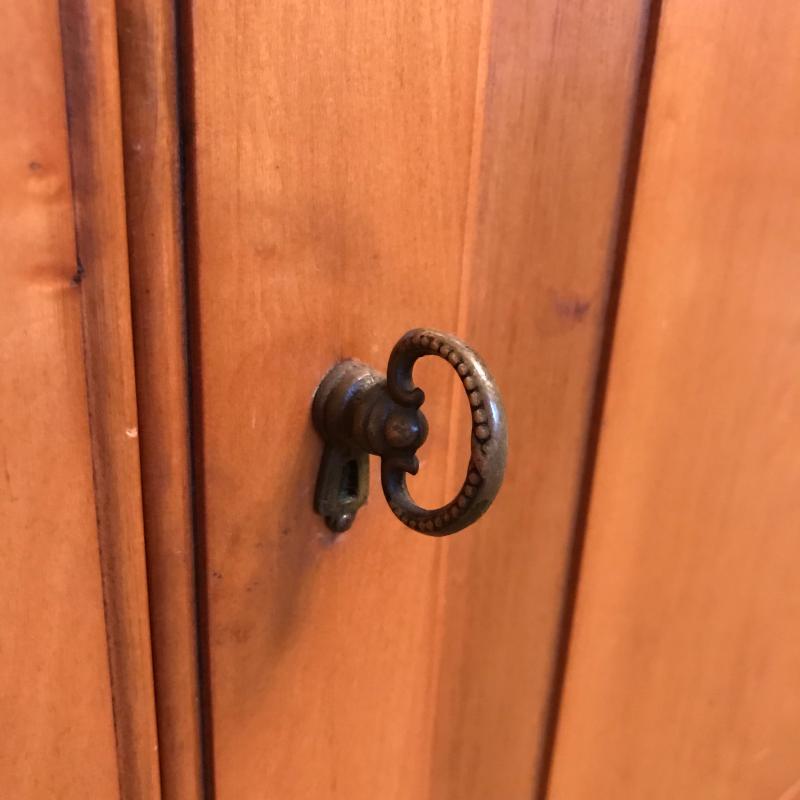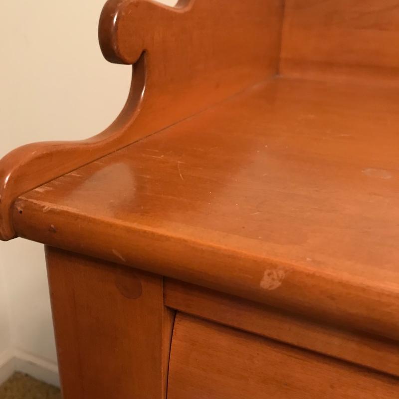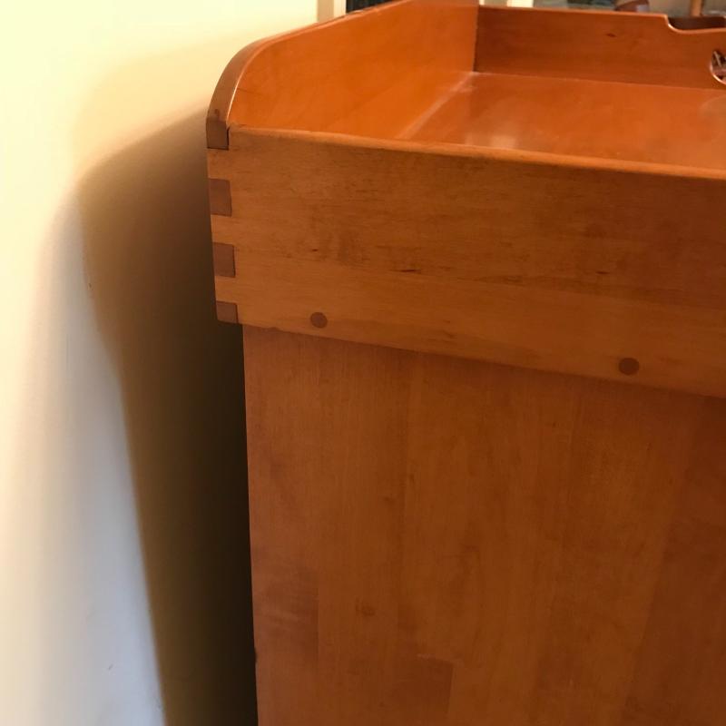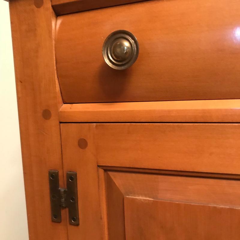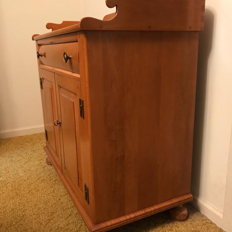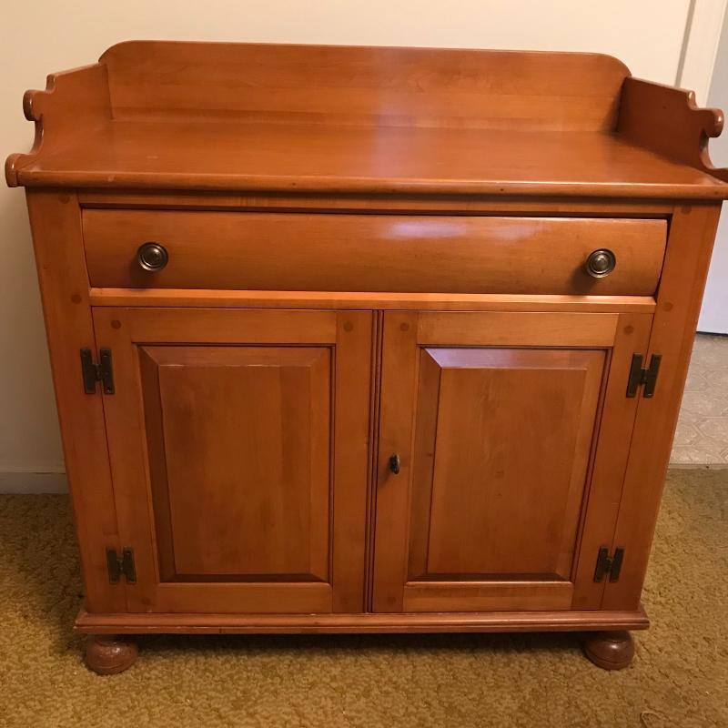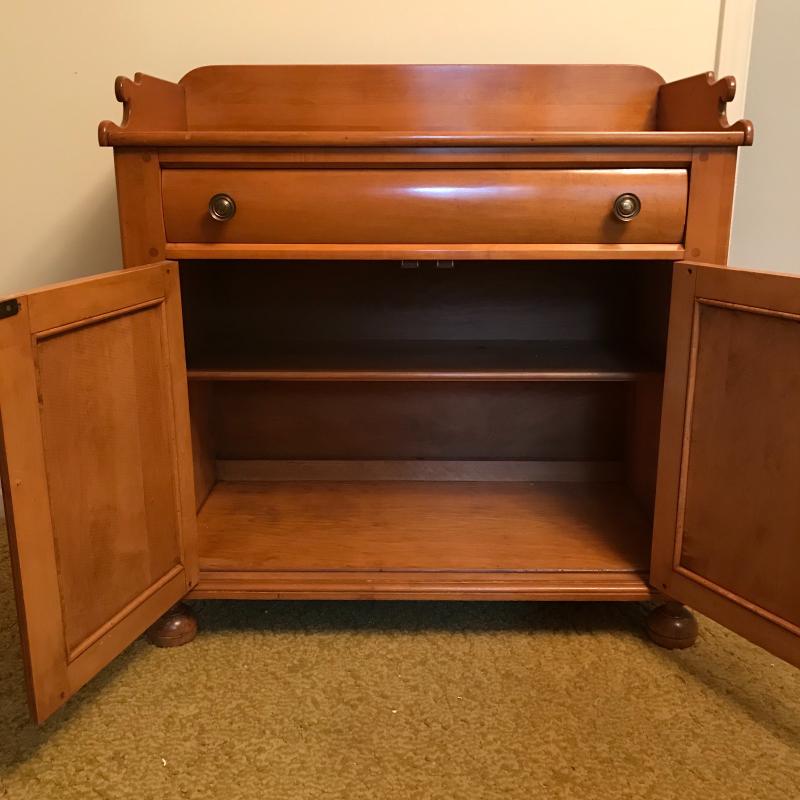 This attractive piece has very little wear, as noted in some pictures. Doors and drawer operate smoothly. Measures approx. 35 x 18 x 36.5”. No shipping.