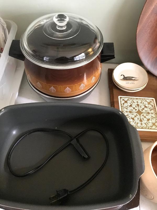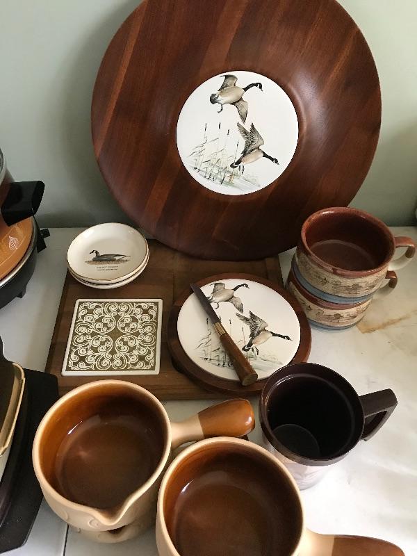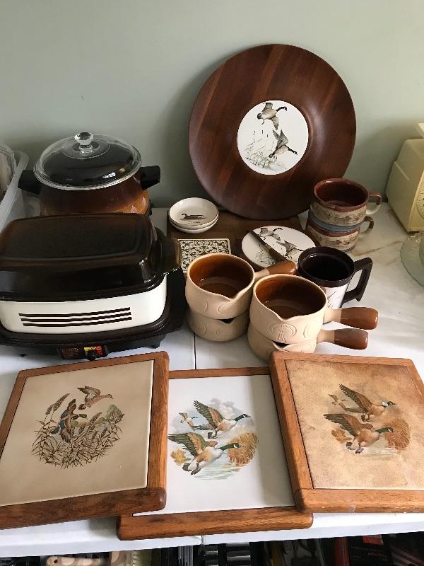 Lot of waterfowl wooden trivets and serving pieces, with vintage slow cookers