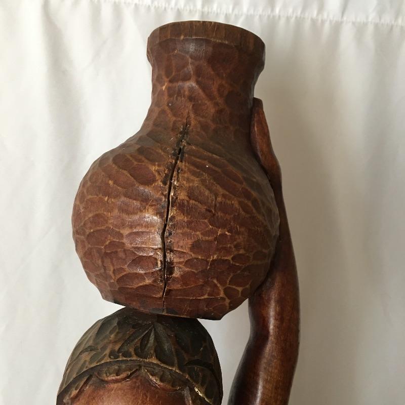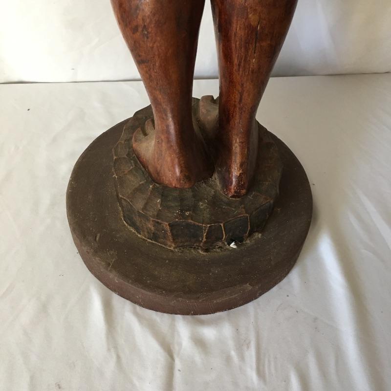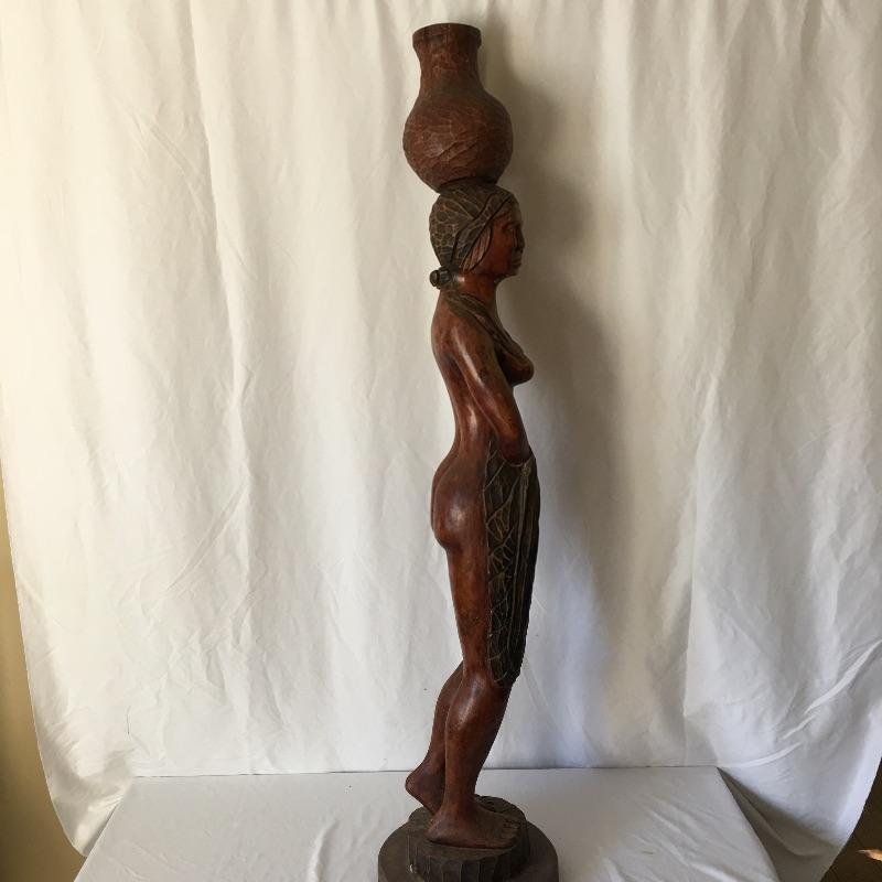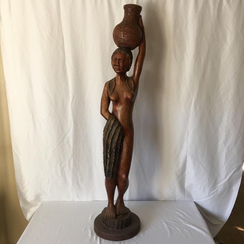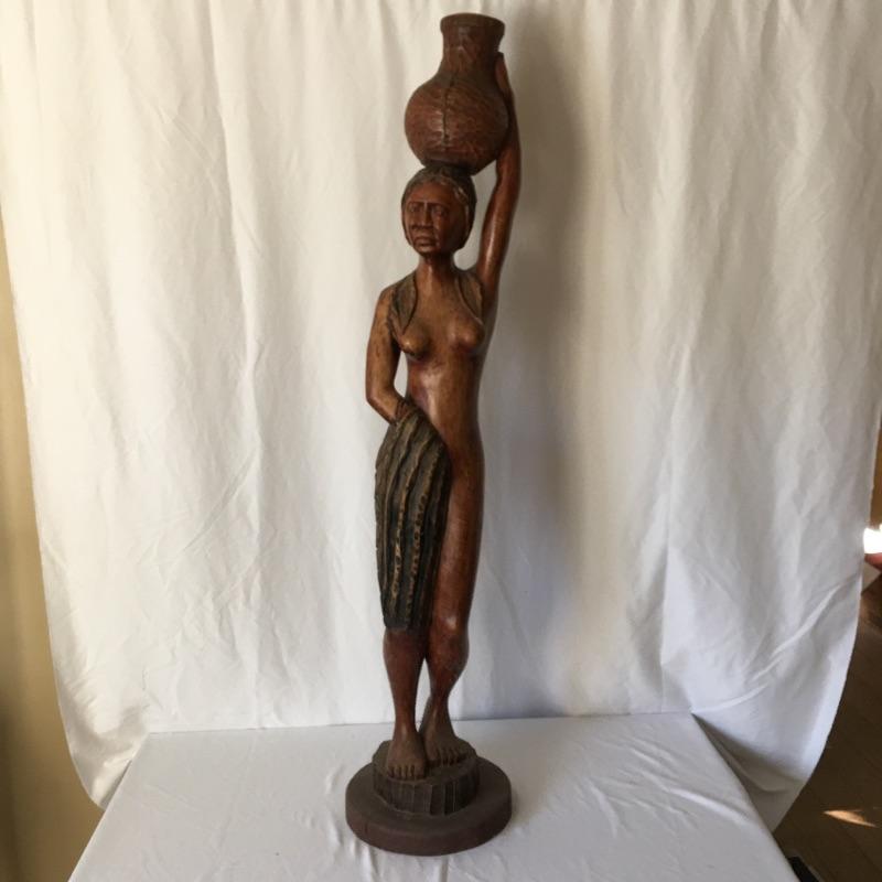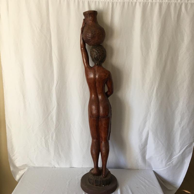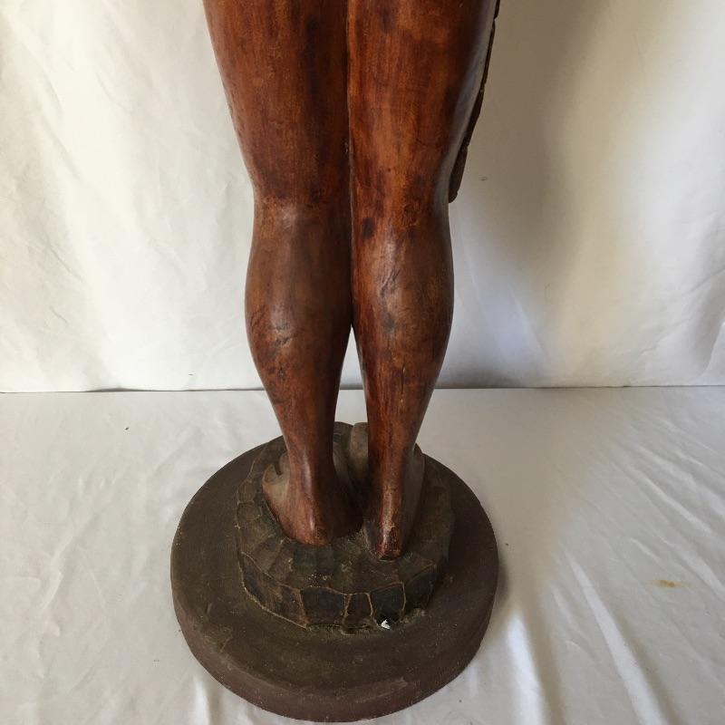 Wooden statue measures 11”D x 48.75” tall. Stunning display of craftsmanship with this beautiful statue. Statue has a split at feet, water jug and back of head, see pictures.
