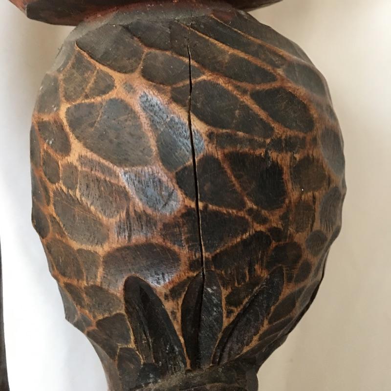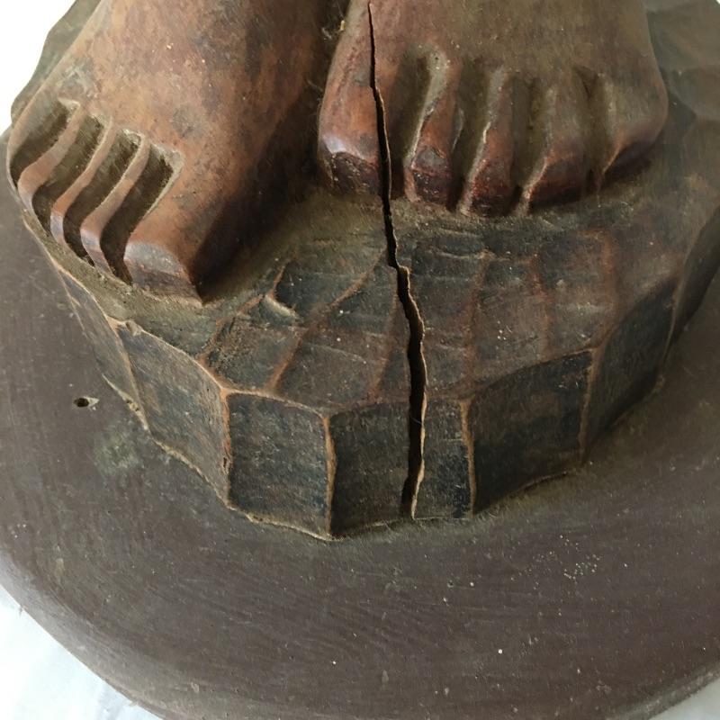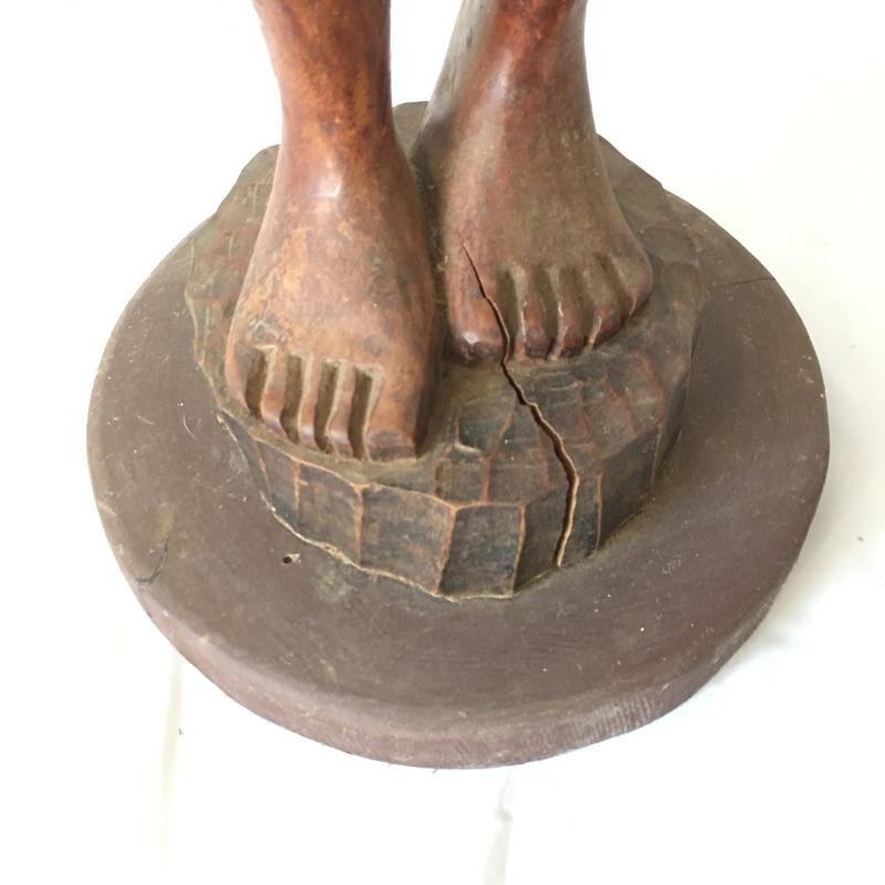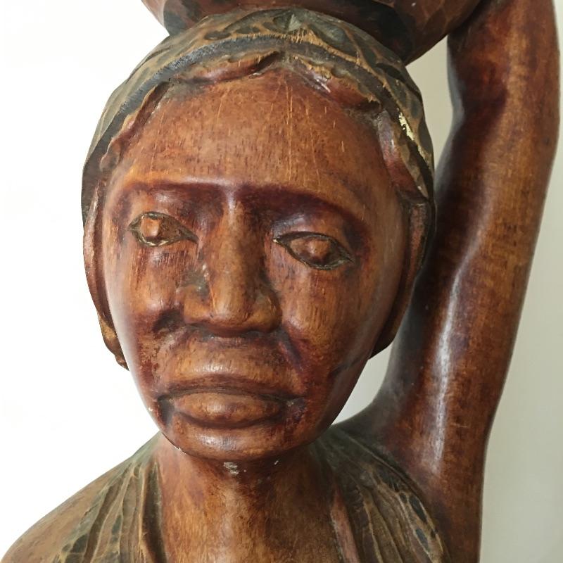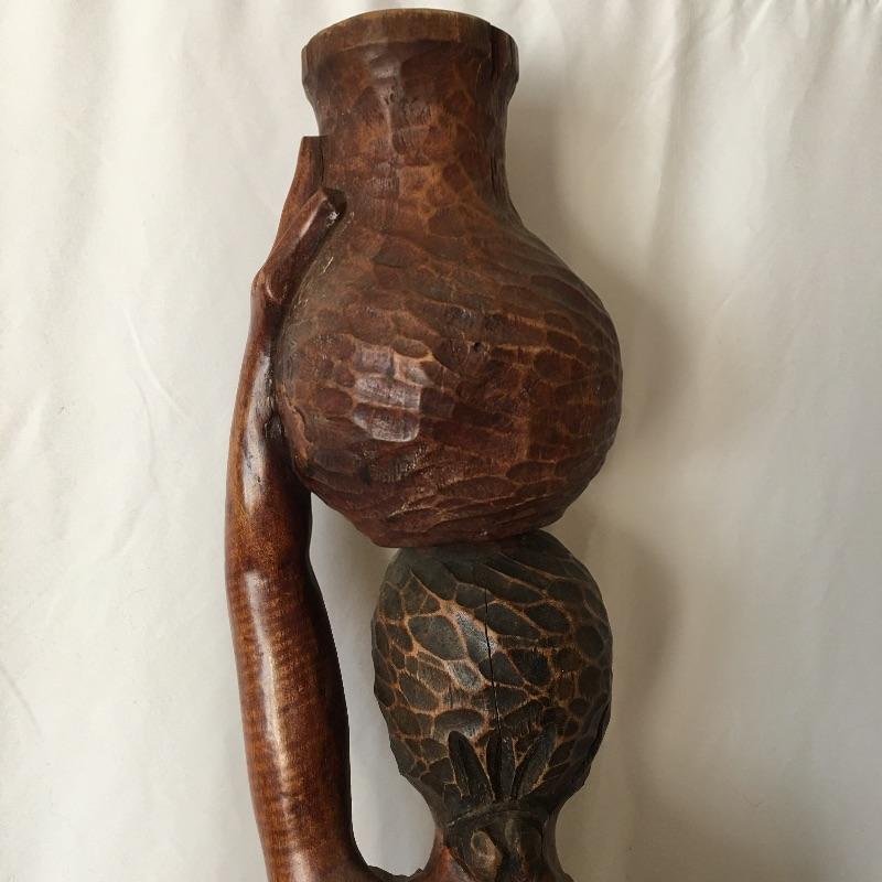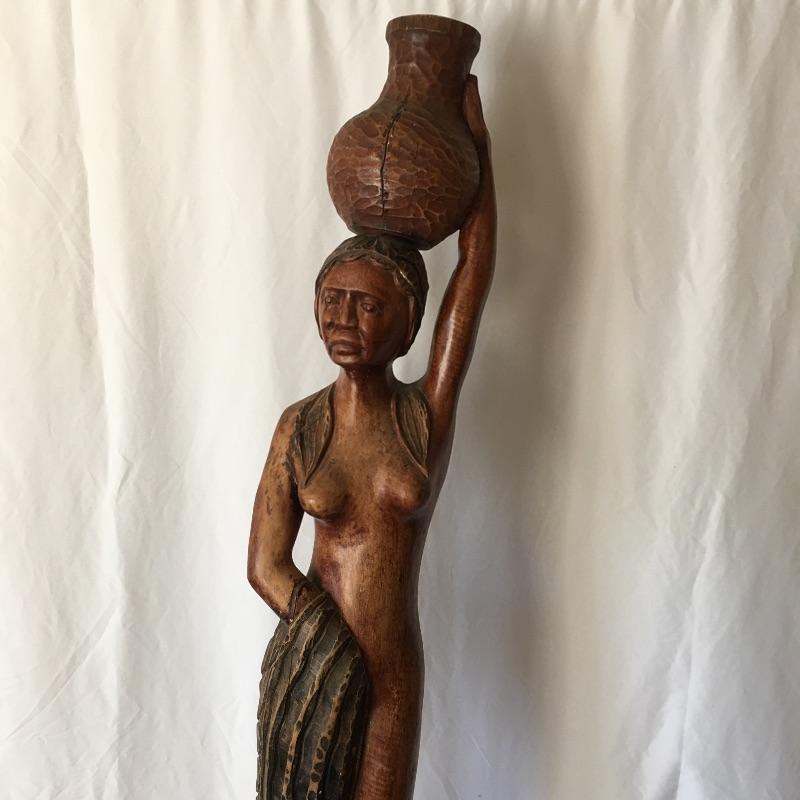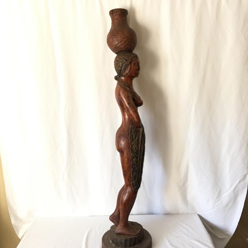 Wooden statue measures 11”D x 48.75” tall. Stunning display of craftsmanship with this beautiful statue. Statue has a split at feet, water jug and back of head, see pictures.