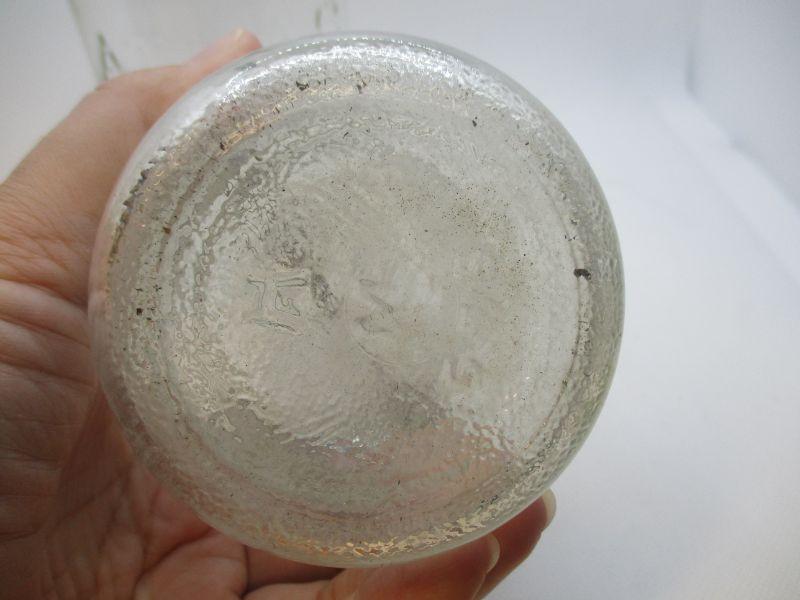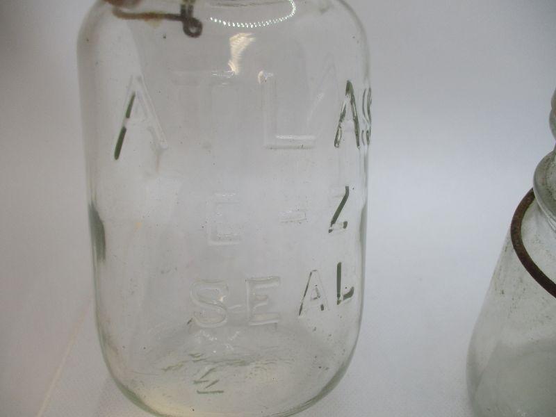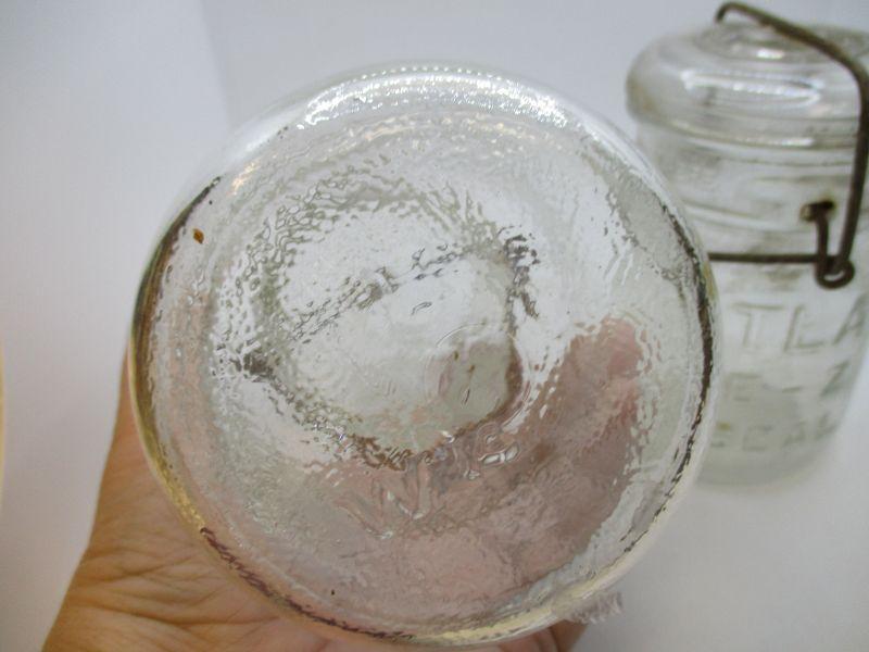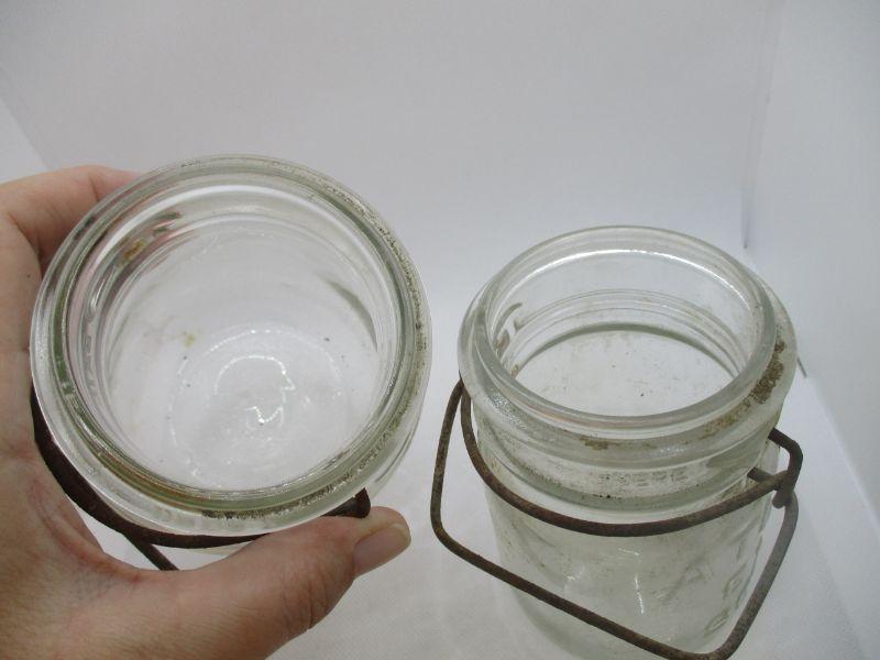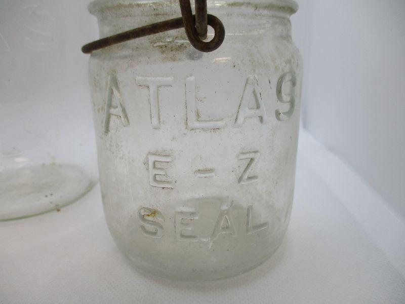 Both of these jars are in very good condition and have the glass lid, the wire bail, and Hazel Atlas trademark on the bottom. I believe that both of these are from 1940s-1960s. The tall one is a quart and the small one is not (I think that it is a pint).