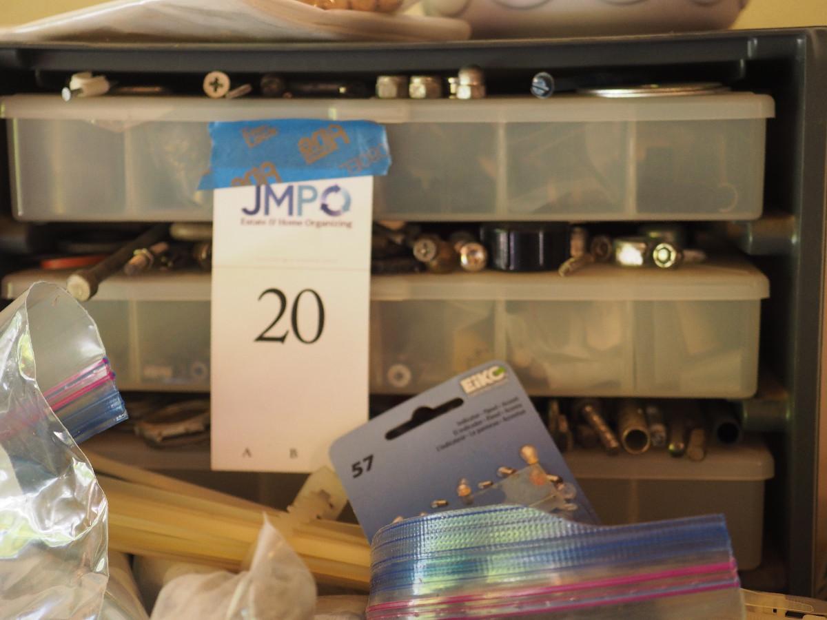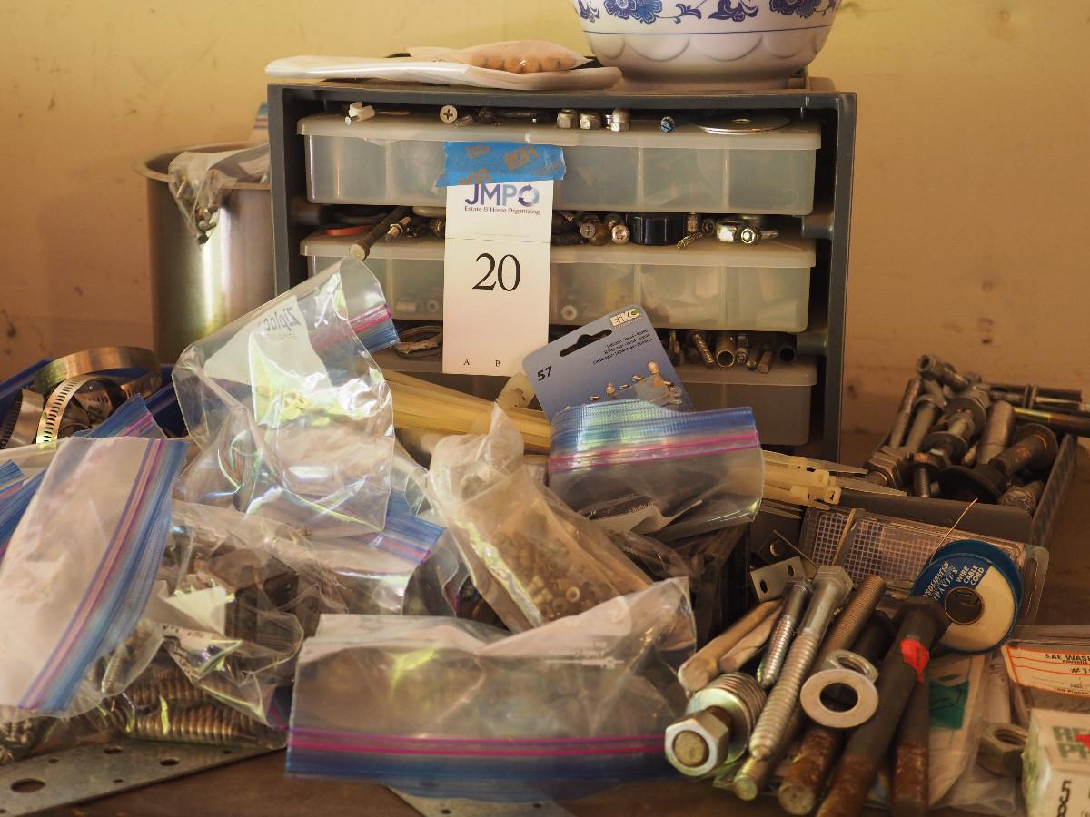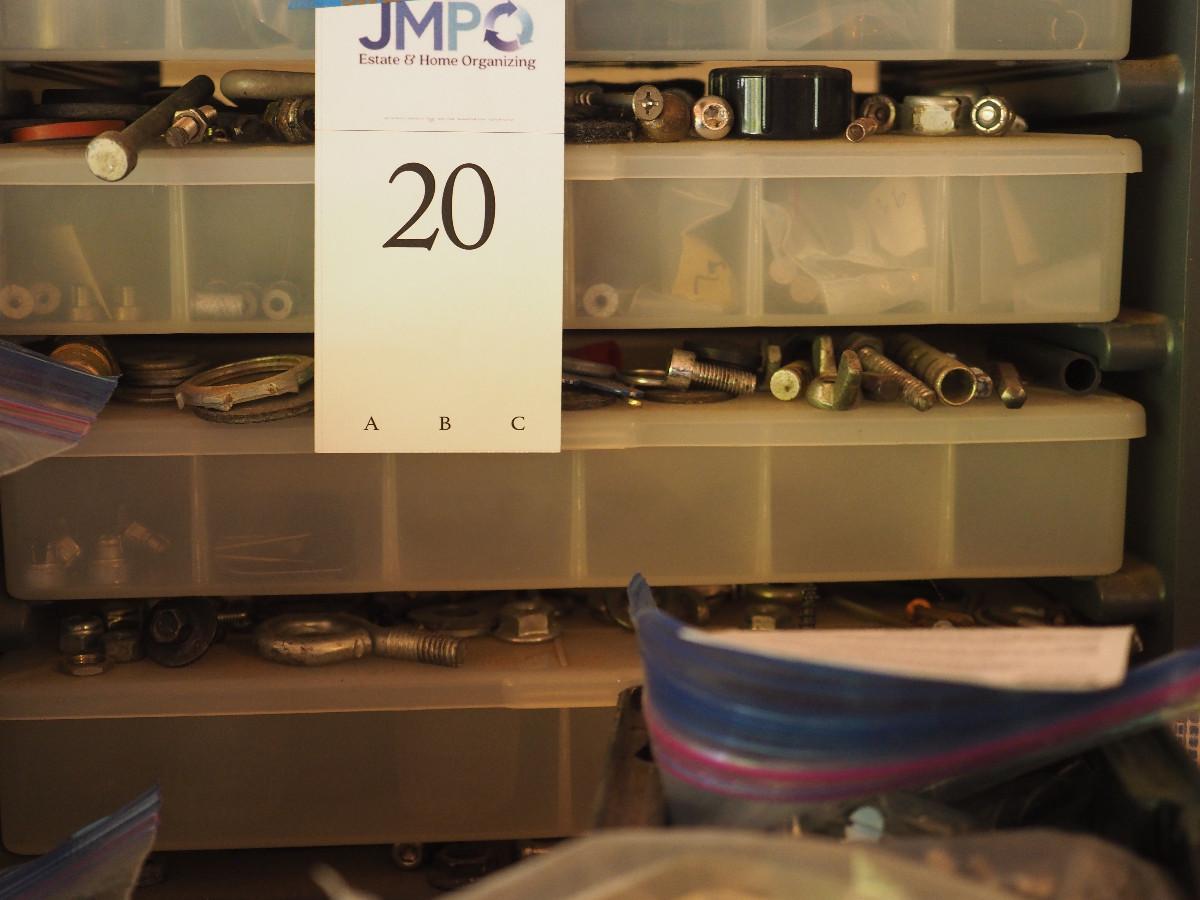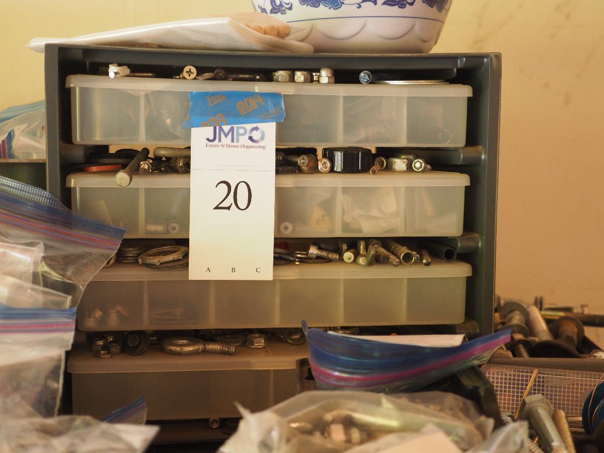 Lot 20 4 drawer plastic storage bin full with many different sizes of bolts and other building hardware. Lot has multiple plastic bags with sorted hardware.