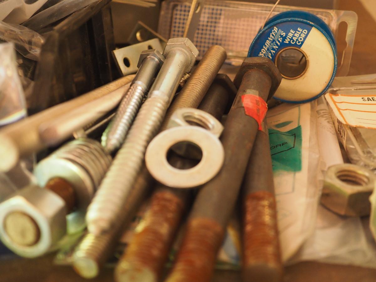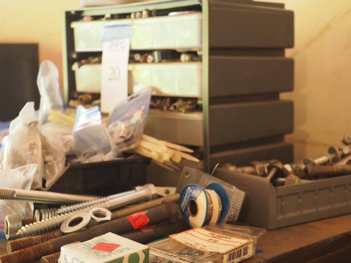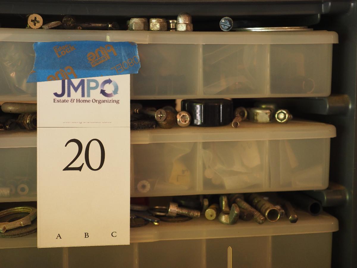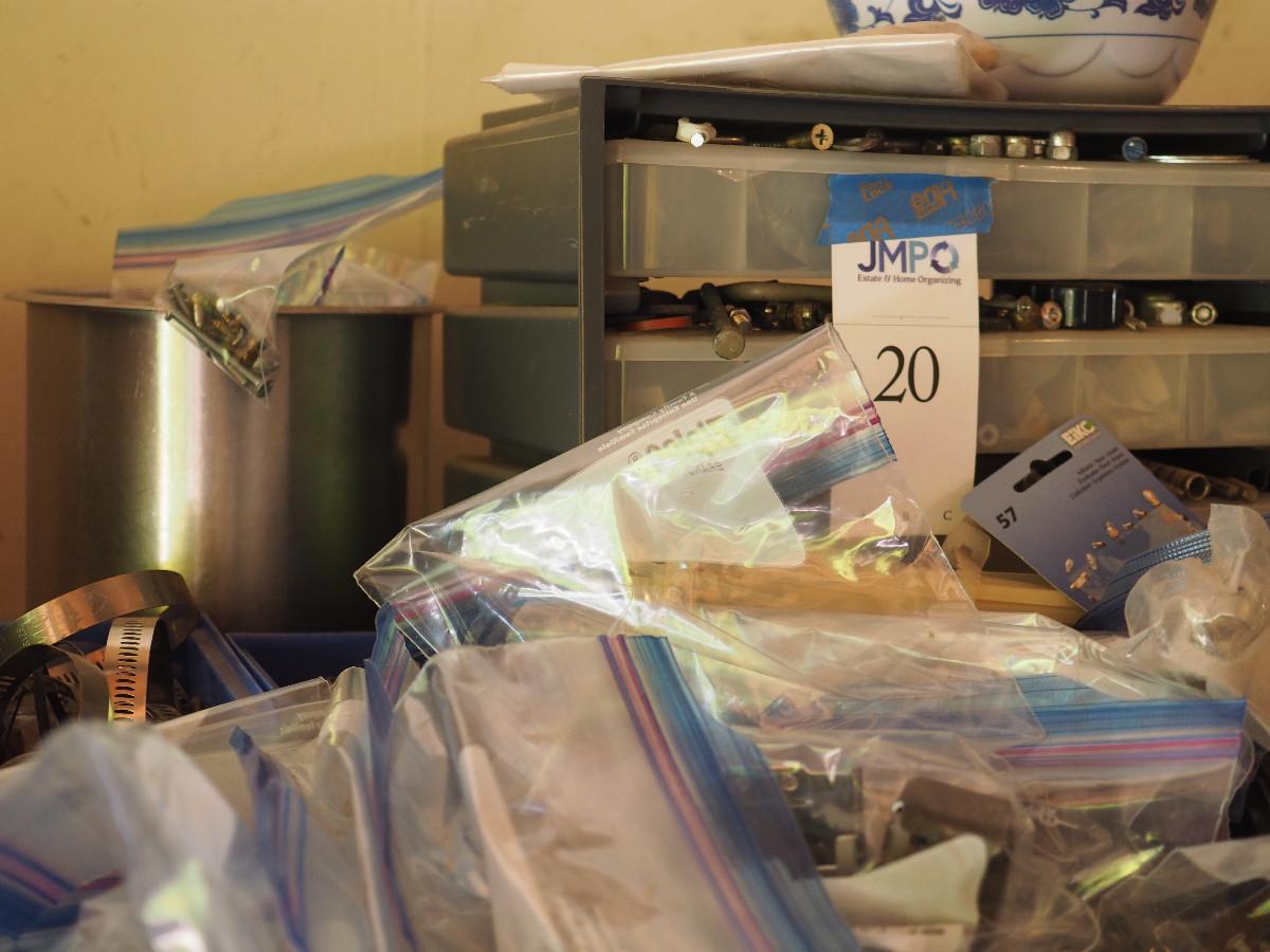 Lot 20 4 drawer plastic storage bin full with many different sizes of bolts and other building hardware. Lot has multiple plastic bags with sorted hardware.