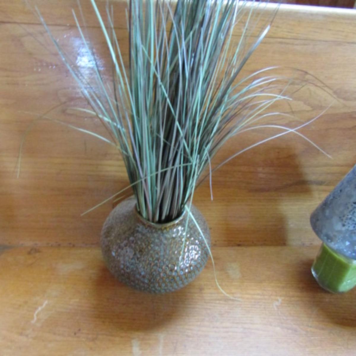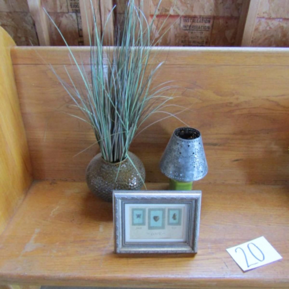 LOT 20  FAUX PLANT IN CLAY POT, JAR CANDLE WITH TIN SHADE AND PICTURE (W)