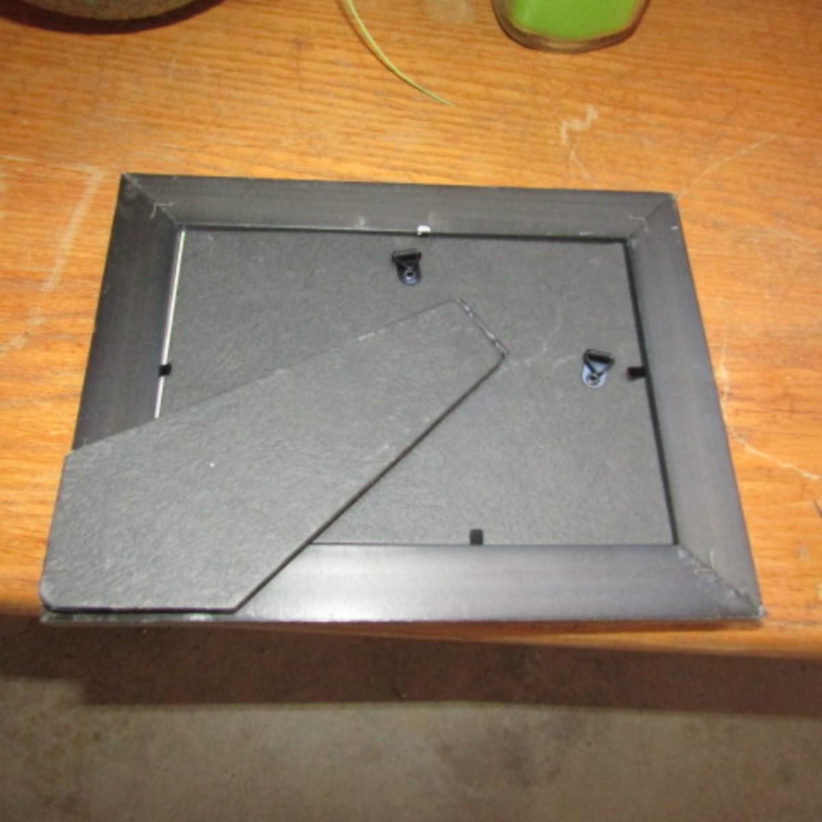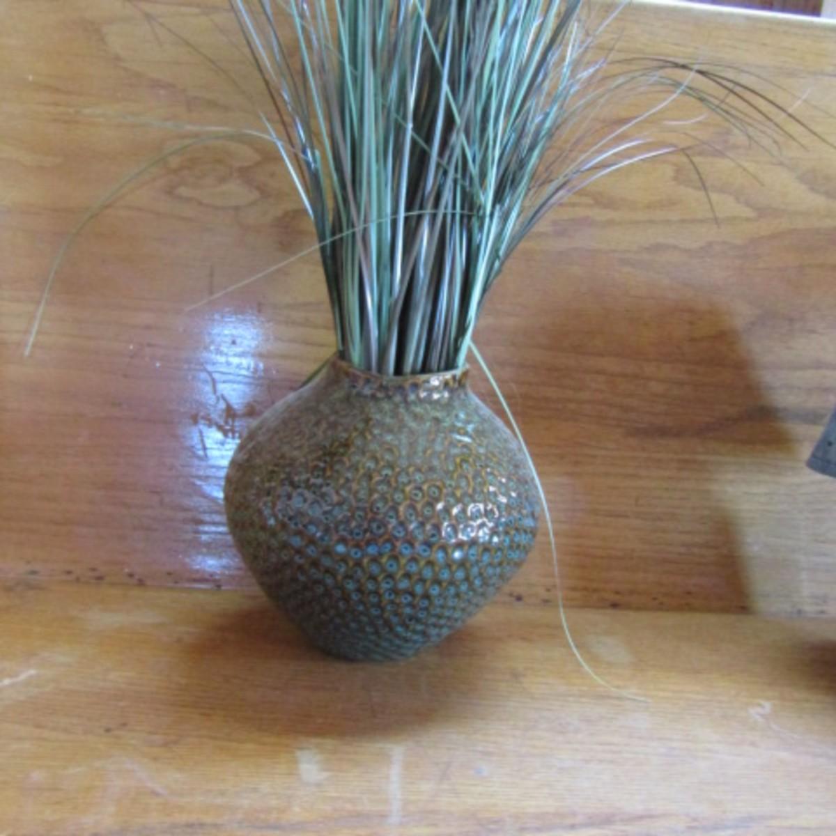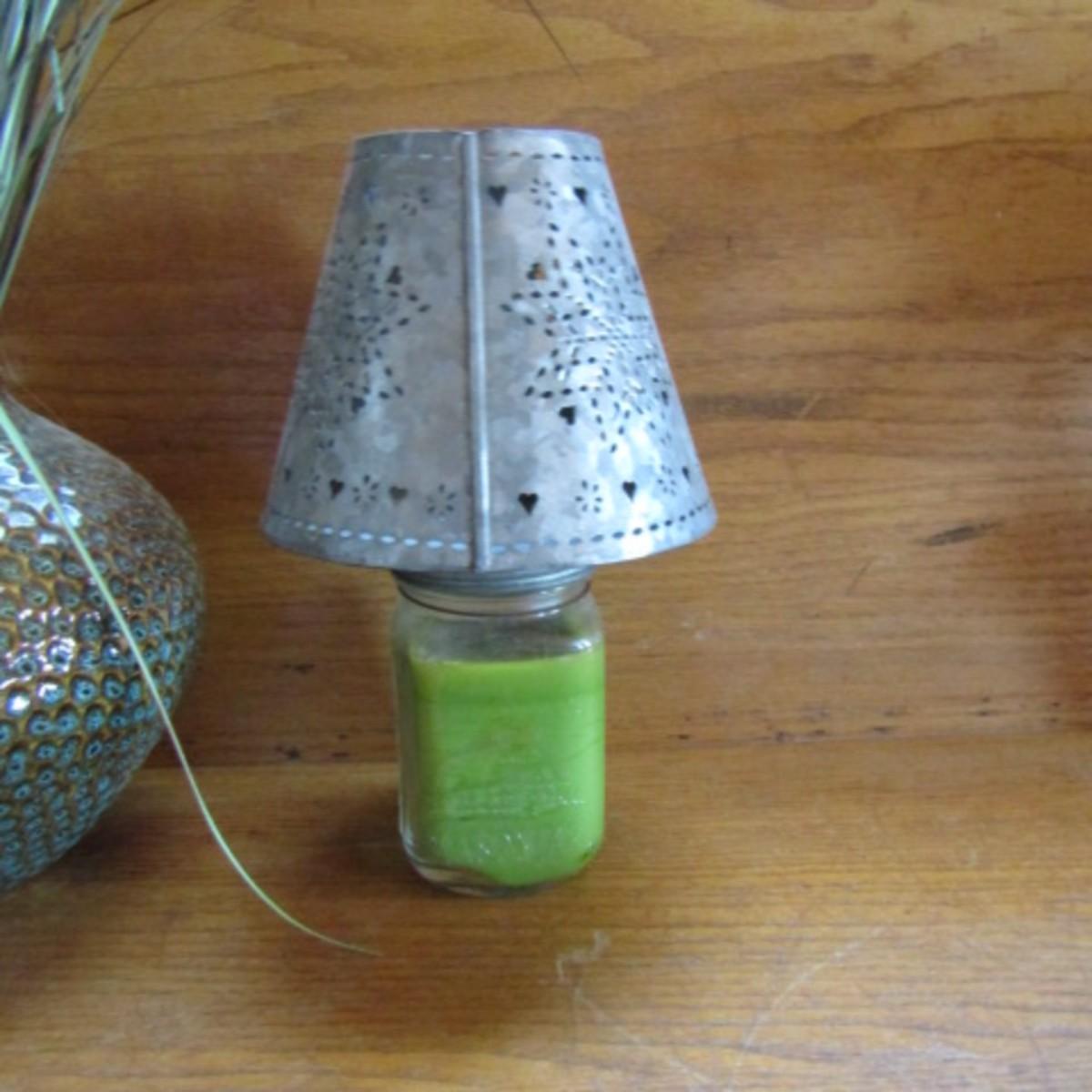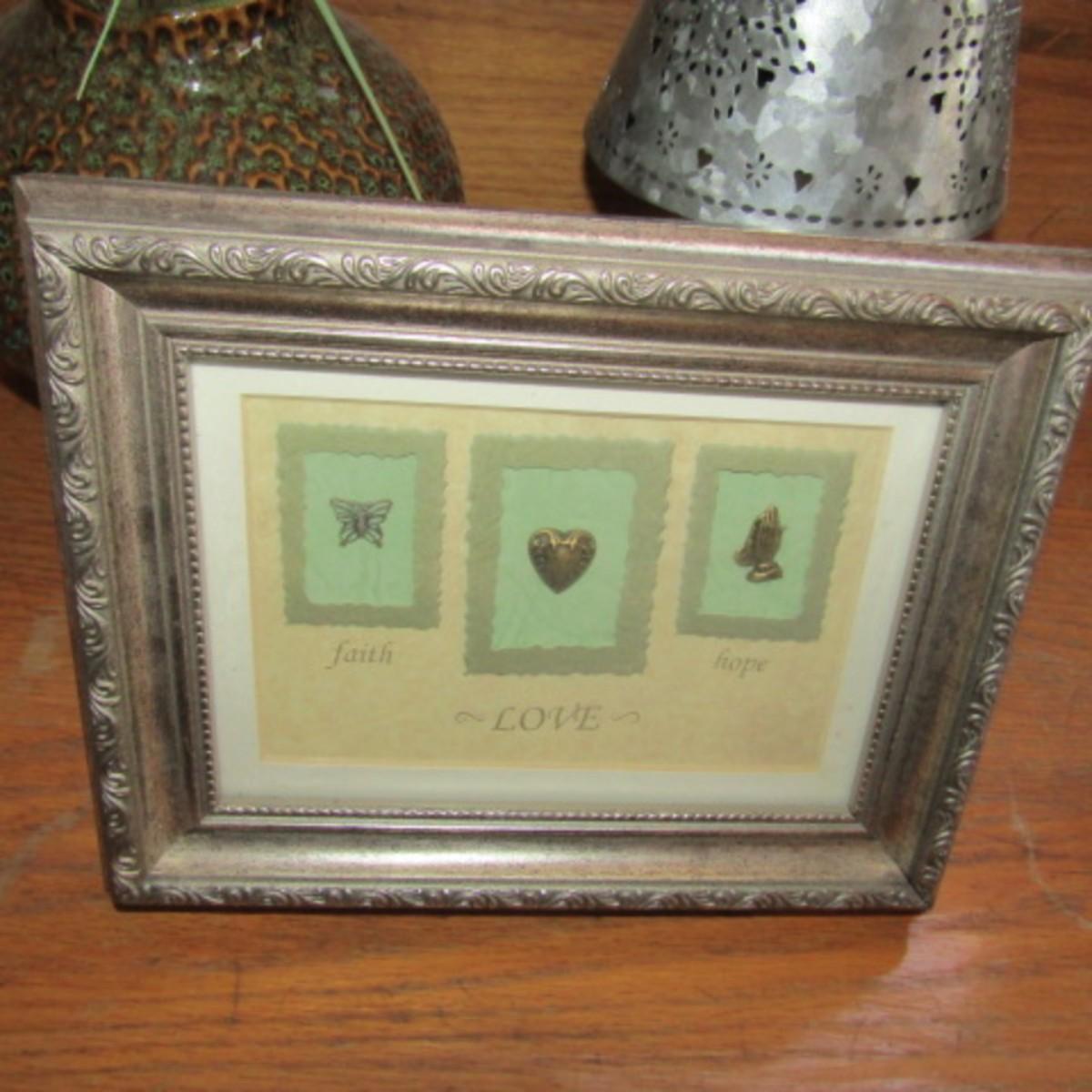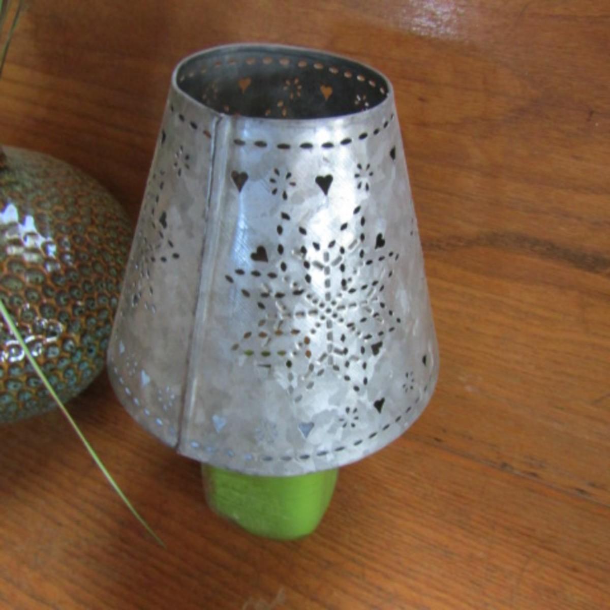 FAUX PLANT IN CLAY POT, JAR CANDLE WITH TIN SHADE AND PICTURE 5" X 7"