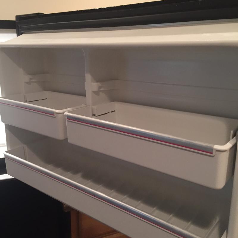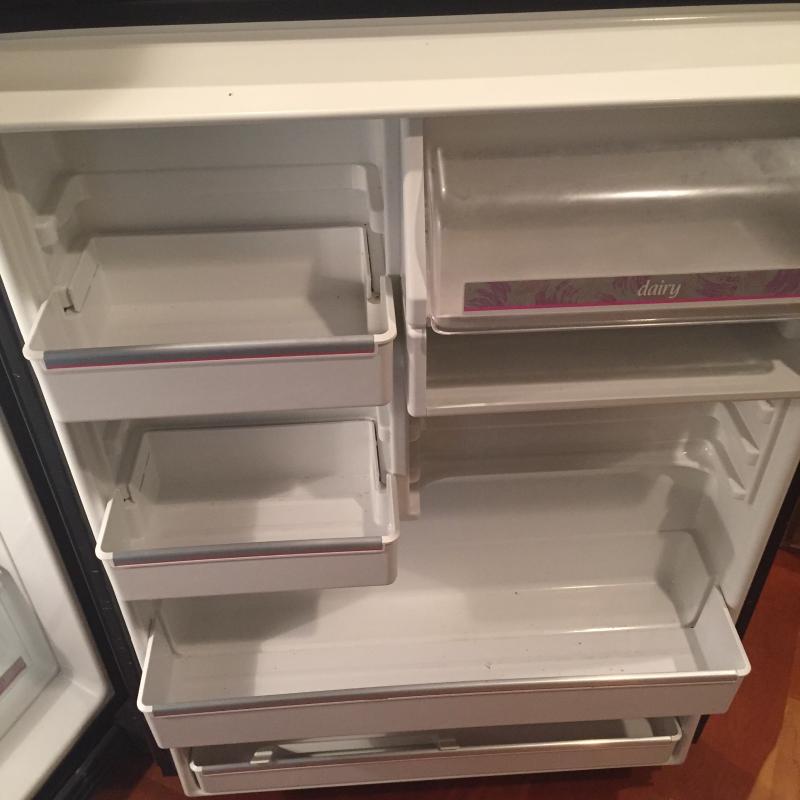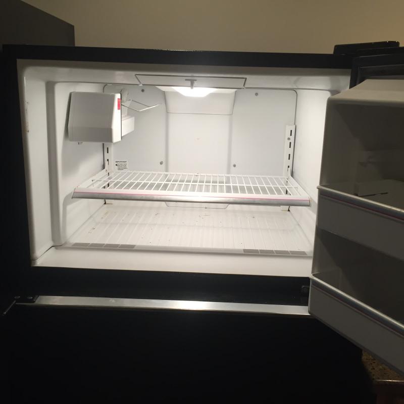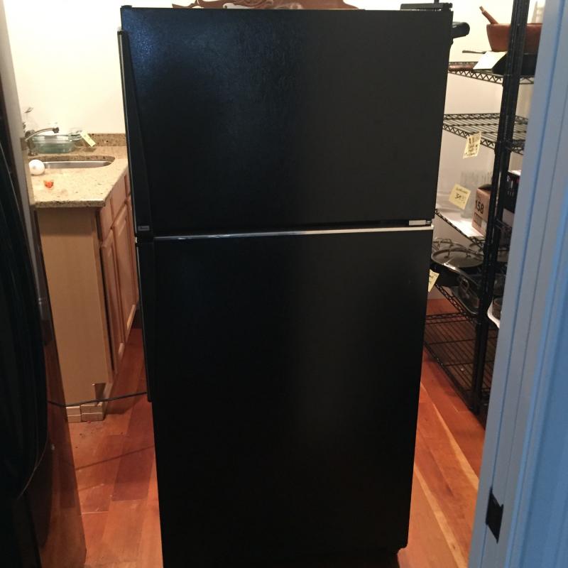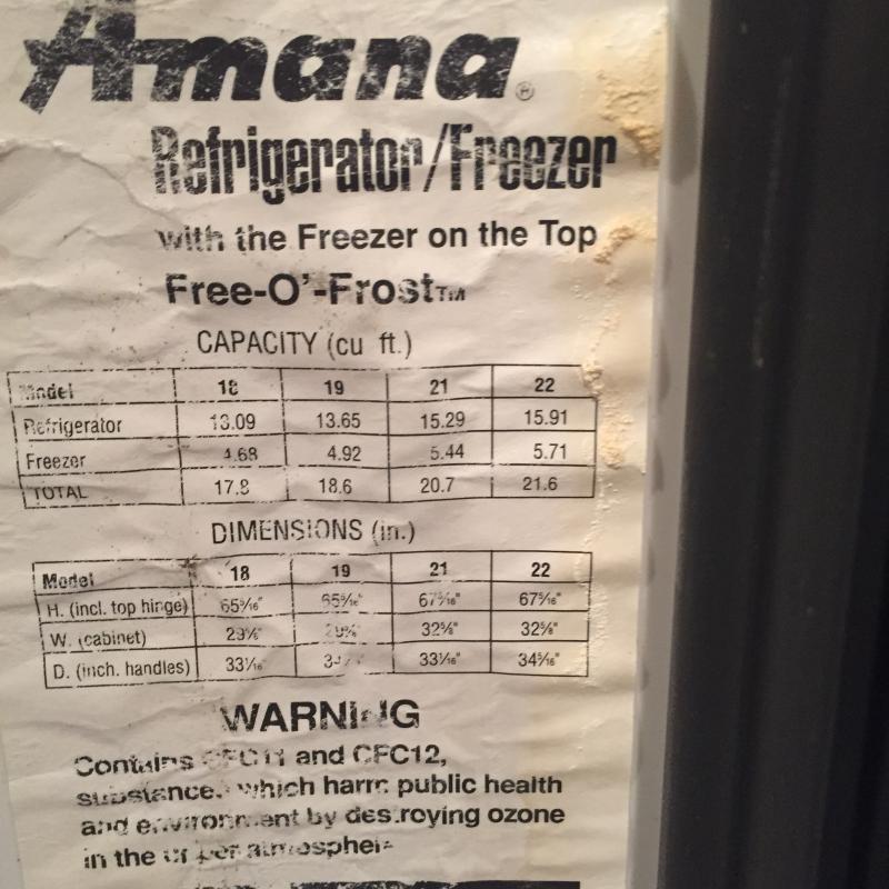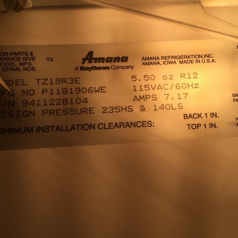 Amana refrigerator model # TZ19R3E with ice maker. Save money buying at auction for this fridge in great condition. Refrigerator measures 29.75” x 33” x 65”.