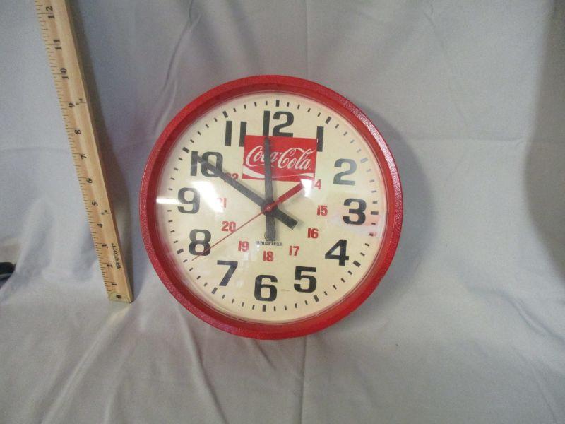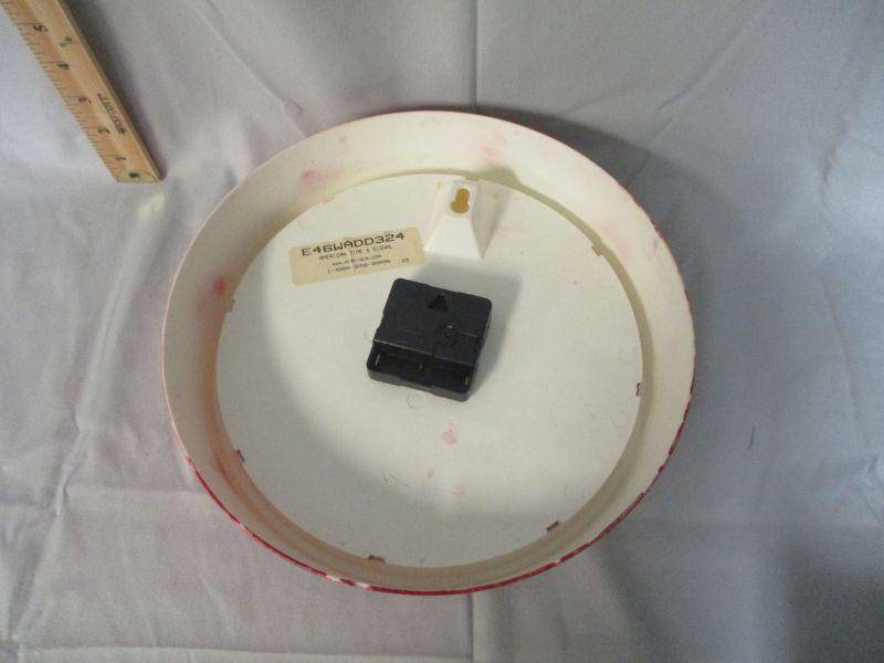This clock is about 10" in diameter and in working condition. It is about " in diameter and uses (1) AA battery. I believe that someone converted a plain clock into this one based on the CC sticker doesn’t fit well and the casing was painted red after the fact. The plastic face has light surface scratches and there was a red color bleed that they tried to clean up with white out. Once it's hanging on a wall, the flaws aren't as obvious.