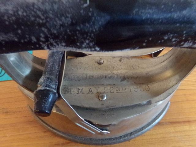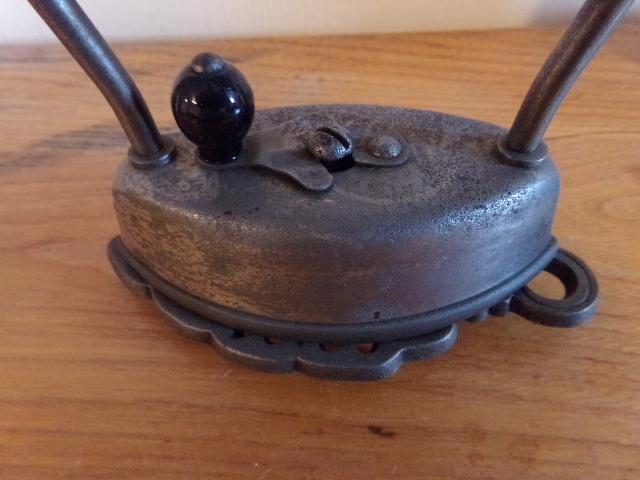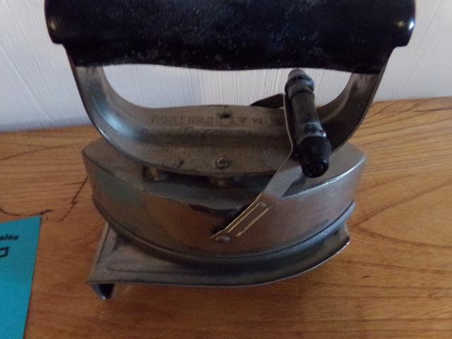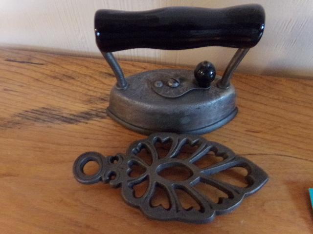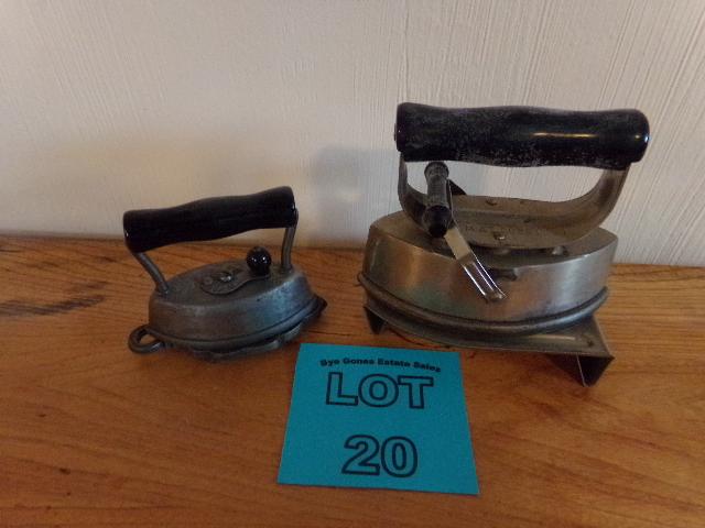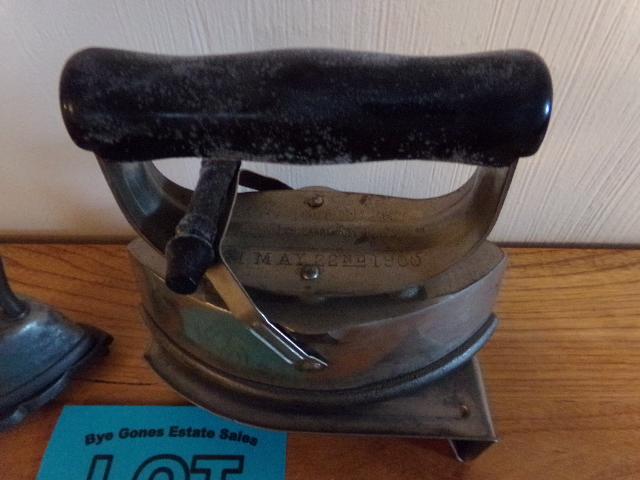 THE BIGGER ANTIQUE ASBESTOS SAD IRON HAS A PAT. DATE OF MAY 22nd 1900. IT HAS A WOODEN HANDLE WITH STAND AND IS IN VERY GOOD CONDITION. THE SMALLER ONE SITS ON A CAST-IRON TRIVET.