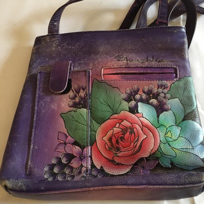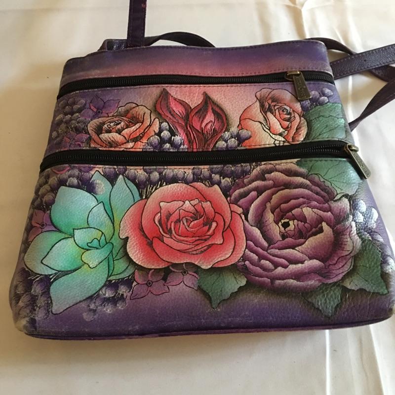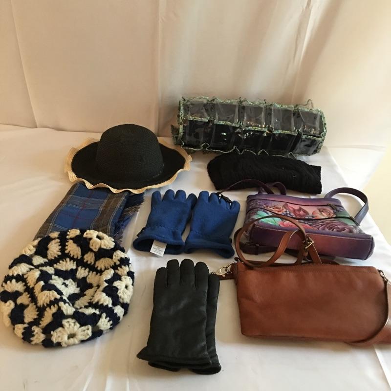 A lovely floral design Anuschka purse in leather will add some wow to any outfit! Lot also includes leather and polyester gloves, hanging organizer, Fossil purse, two hats and two scarves. Purse has some wear on one side, see pictures.