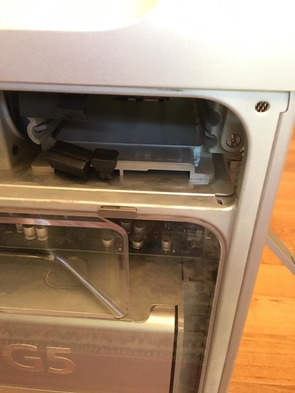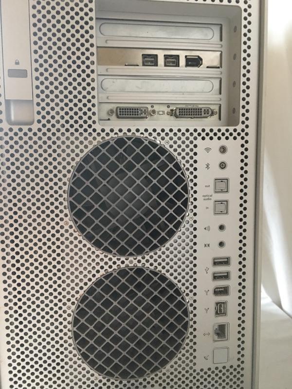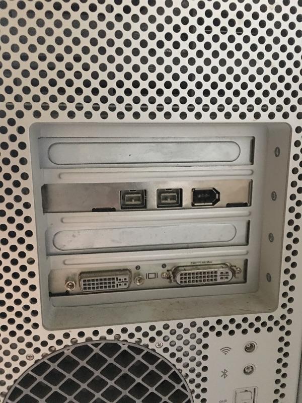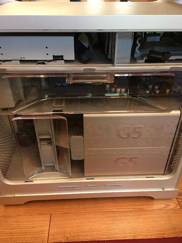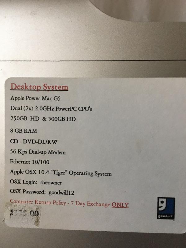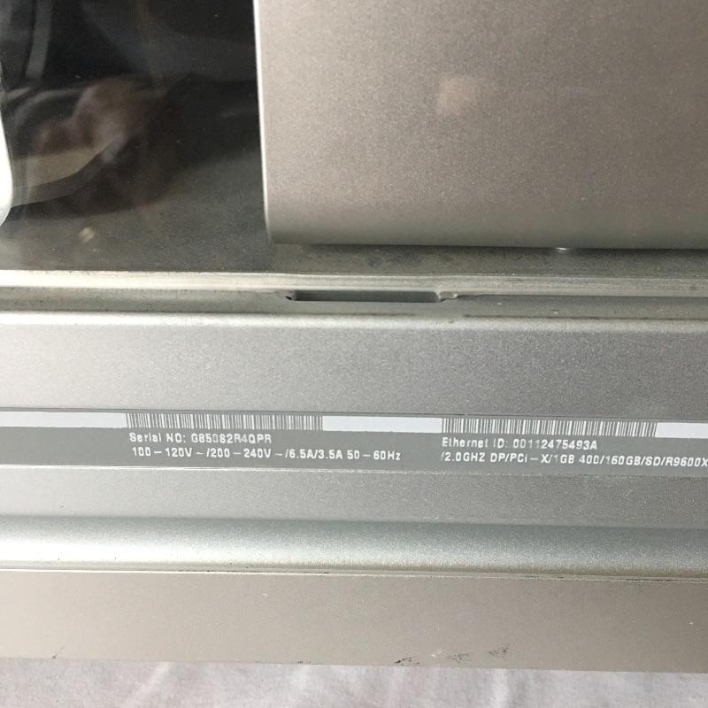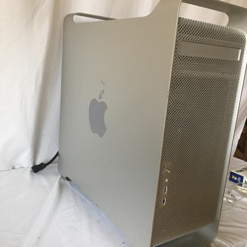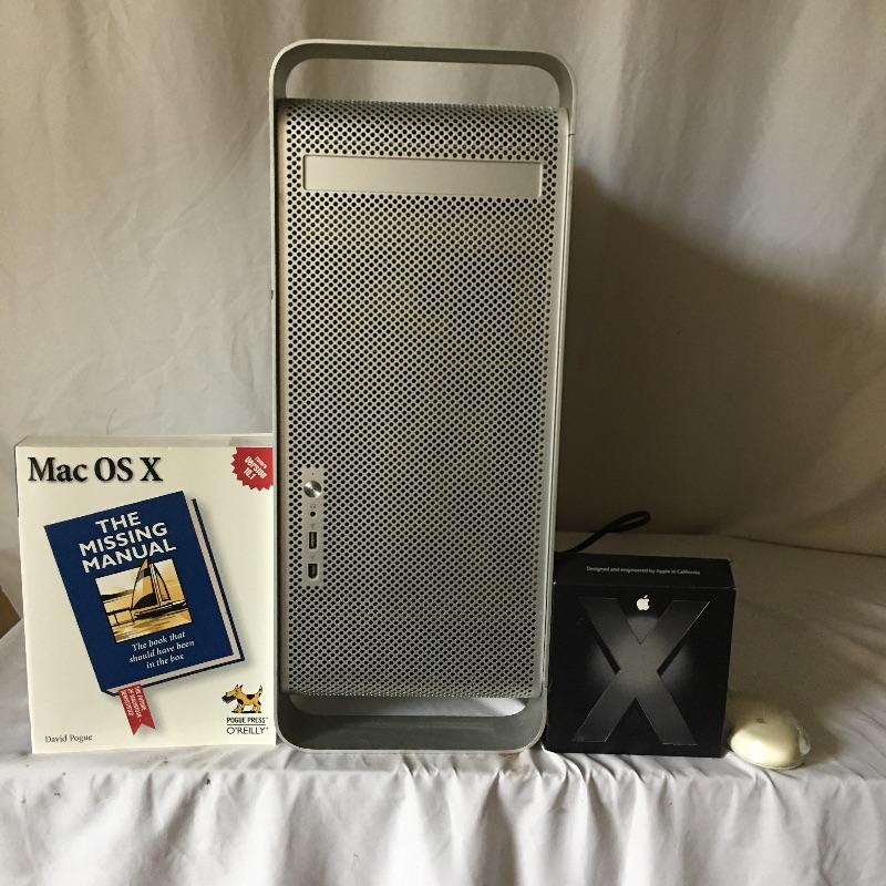 Apple Power Mac G5. Lot includes mouse, OSX Tiger and Power Mac G5 with dual 2.0GHz PowerPC CPUs and 8 GB Ram. Hard drives have been removed from computer. Machine powers on when tested.