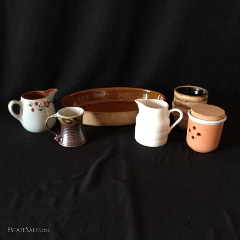 Assorted pottery. Includes a floral pitcher by Stangl Pottery and white pitcher by Lord Nelson Pottery. Both approx. 5"high. Ceramic casserole dish, four small bowls and signed mug.