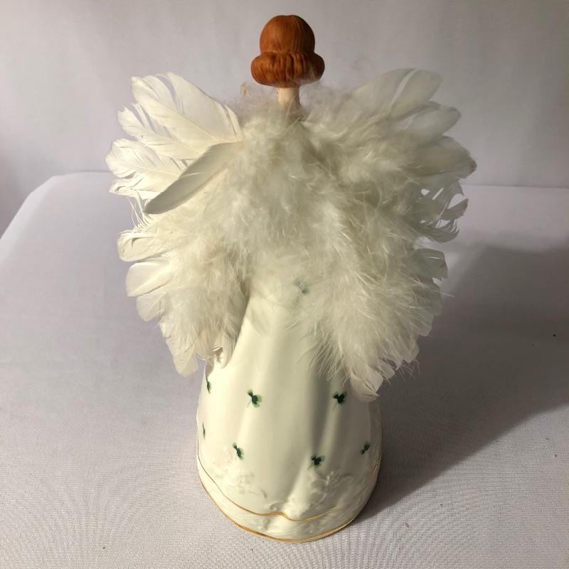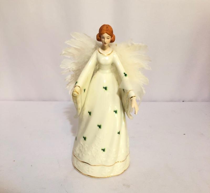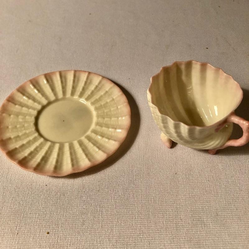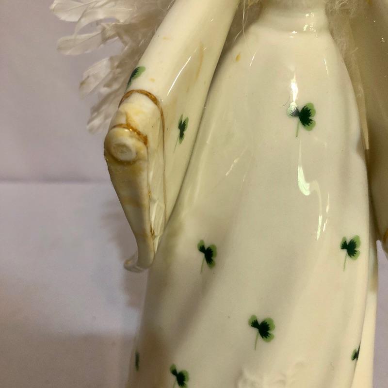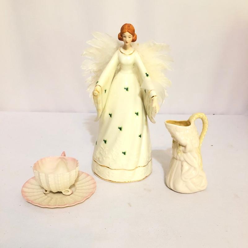A precious Belleek shell cup and saucer has been paired with a dainty Belleek creamer. Lot also includes an elegant angel with feathered wings. Please note her hand needs gluing back on. The three Irish made collector Belleek pieces are all marked and shown in images that you can zoom in for numbers.