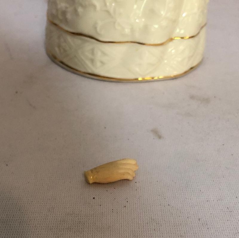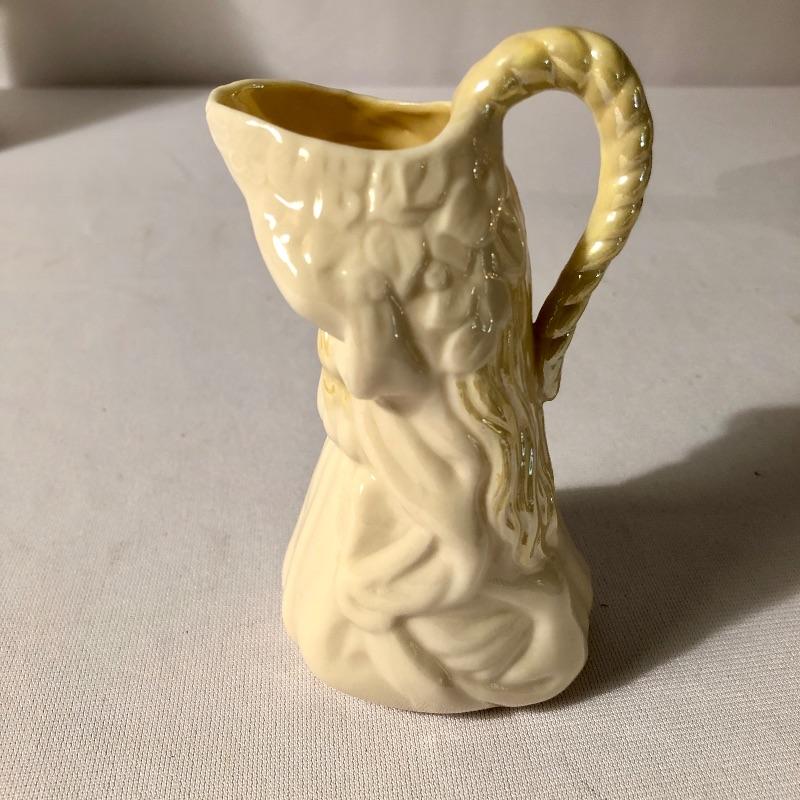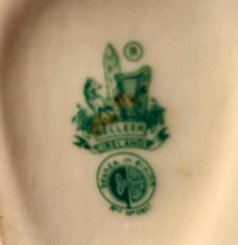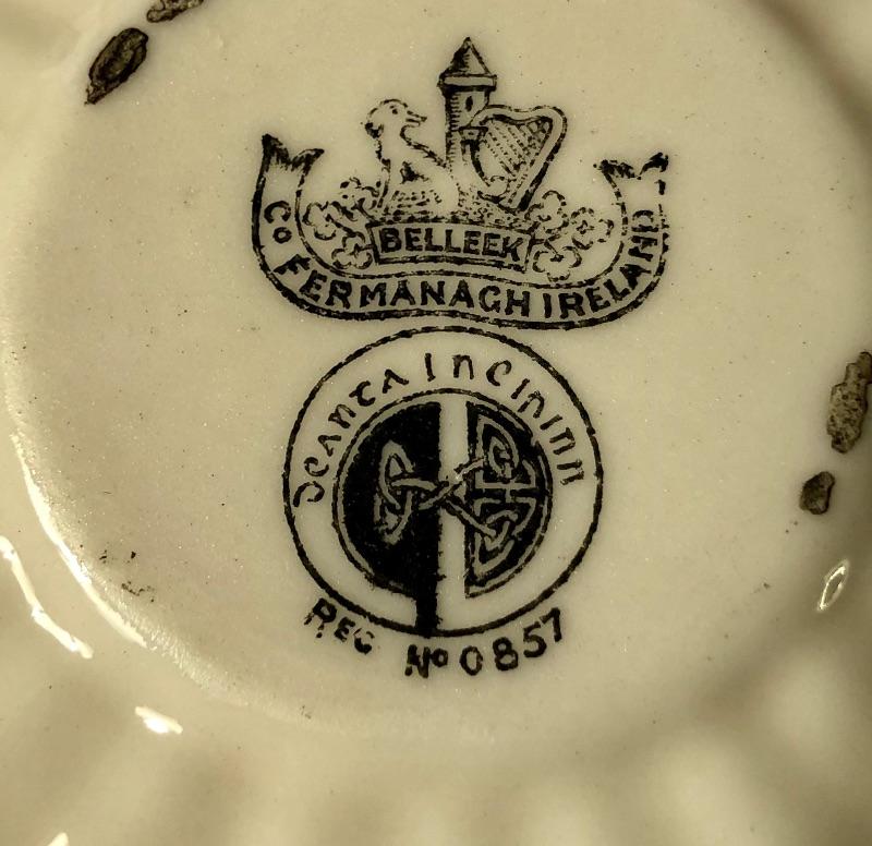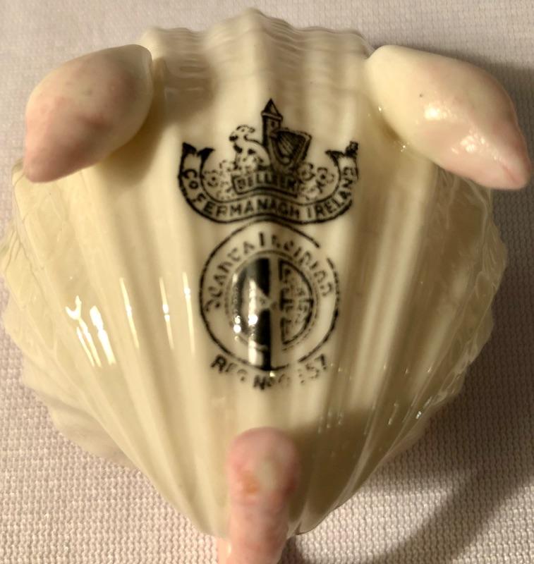 A precious Belleek shell cup and saucer has been paired with a dainty Belleek creamer. Lot also includes an elegant angel with feathered wings. Please note her hand needs gluing back on. The three Irish made collector Belleek pieces are all marked and shown in images that you can zoom in for numbers.