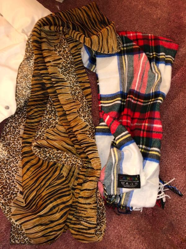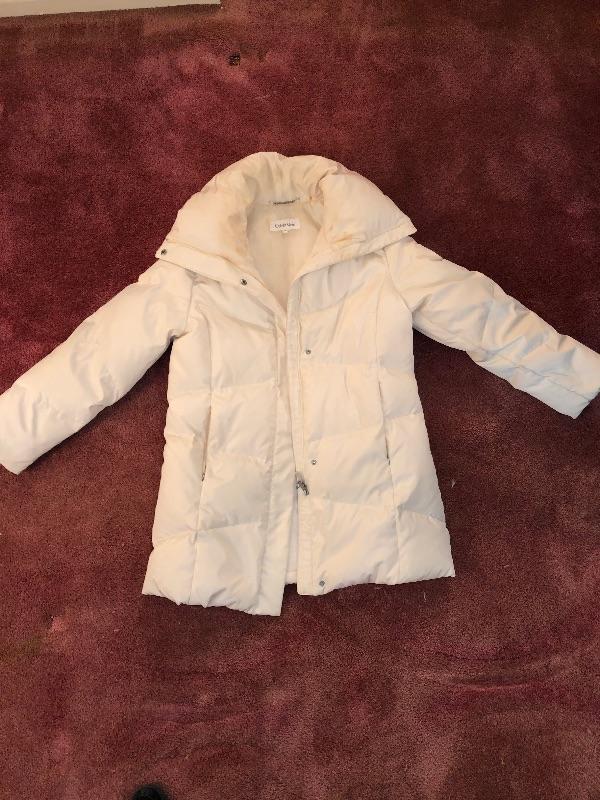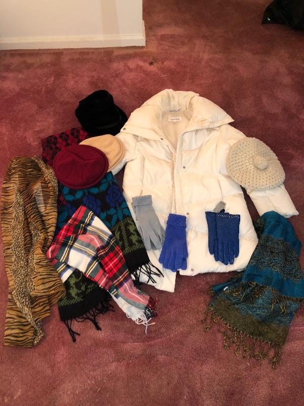 Lot 20 - Calvin Klein White Puffy Coat, Handmade Hat, Scarves, New & Used Gloves, etc!