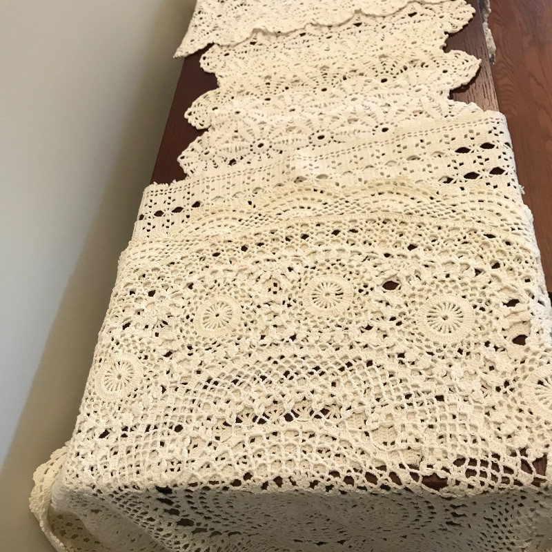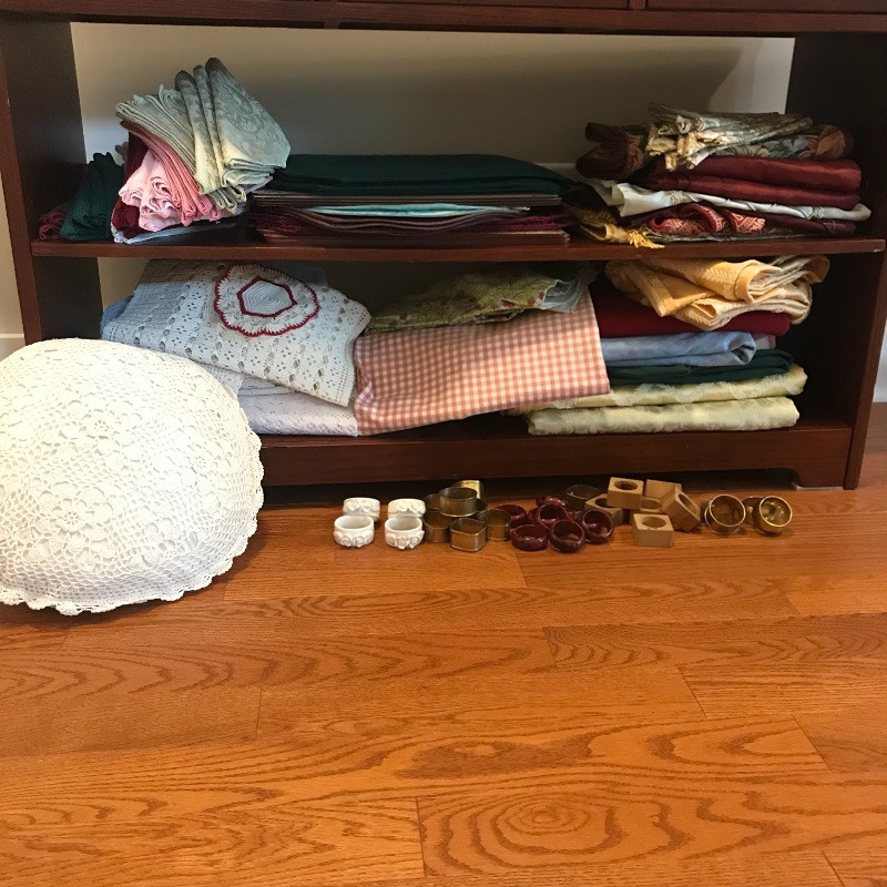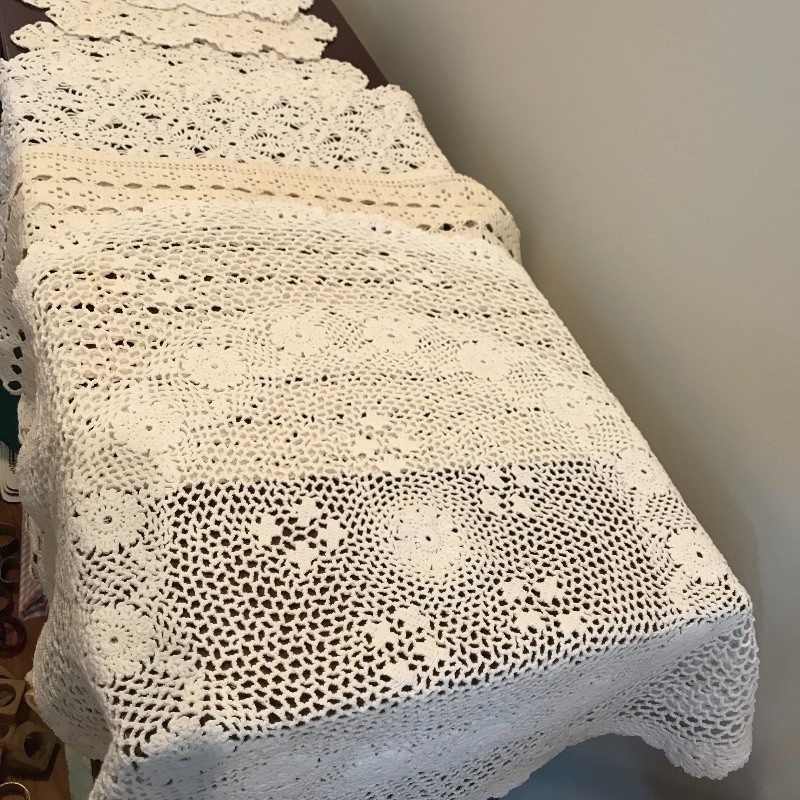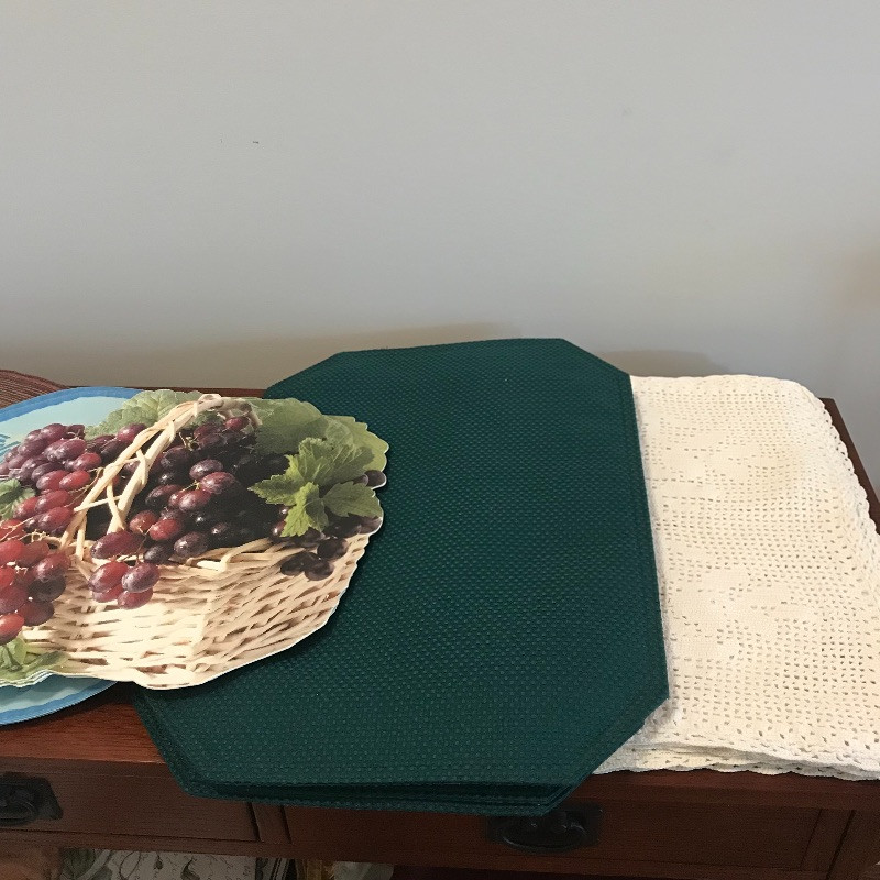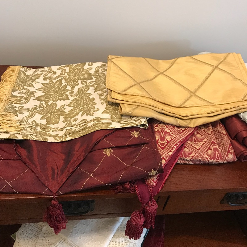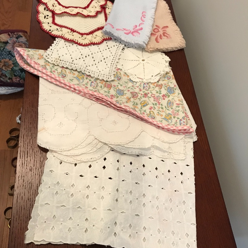 Lovely collection of various dining table decor. Lot contains napkin rings of various styles, crocheted placemats and table decor, pumpkin and French hard cork mats. Lot also includes table cloths for any occasion, including a 70” new in packaging white “dainty” table cloth. Table runners, other linens and a crocheted pillow also included. See photos. The hallway table is not included and can be found in Lot 22. Local Pickup Only.