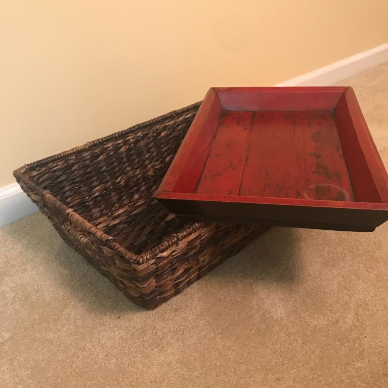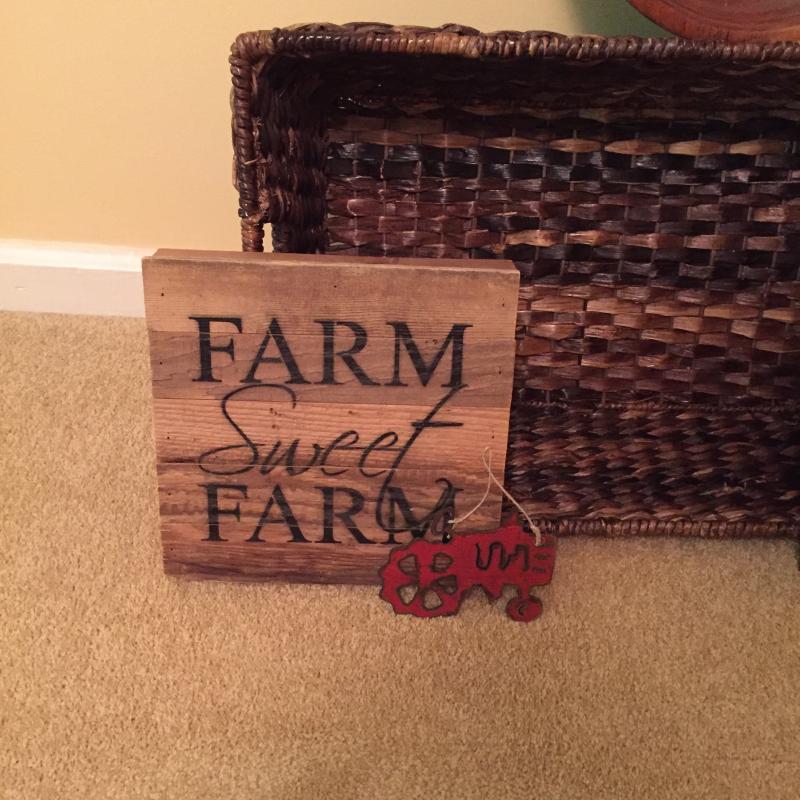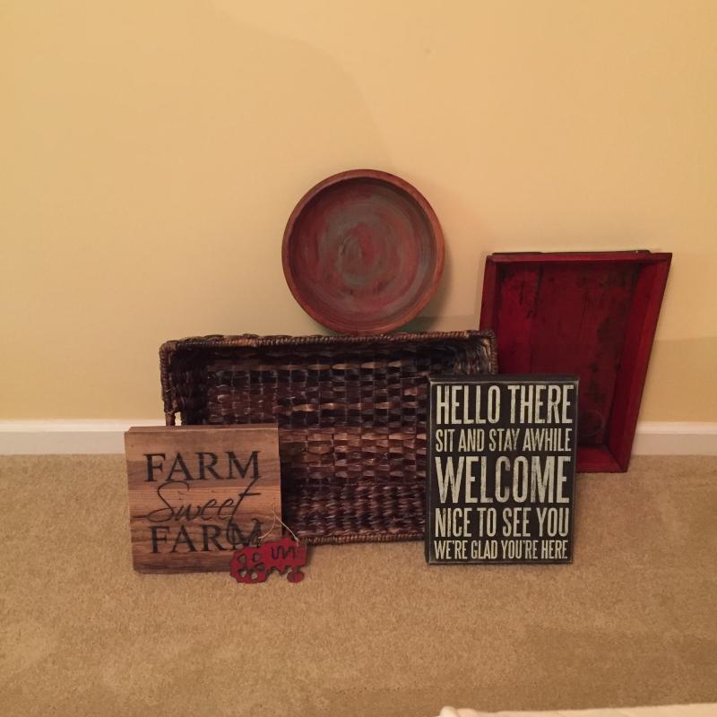 Quote Art Signs for your home. Lot also includes two trays -one woven and one wooden. Red one has small water stain. Lot also includes beautiful red and aqua colored wooden bowl and small tractor plaque or ornament. Largest Basket Tray Measures 22.5”x15”x7”. Local Pickup Only