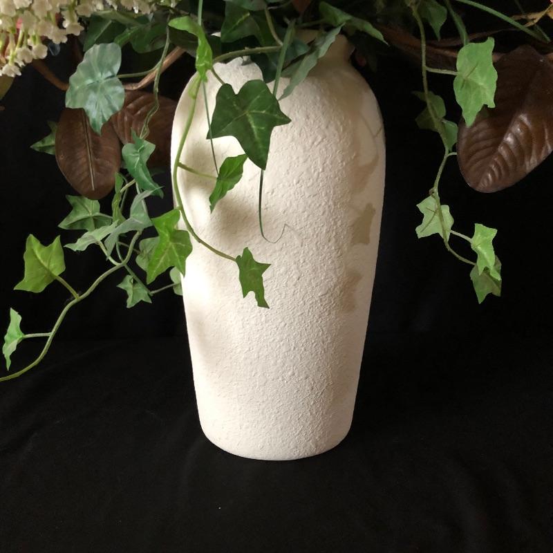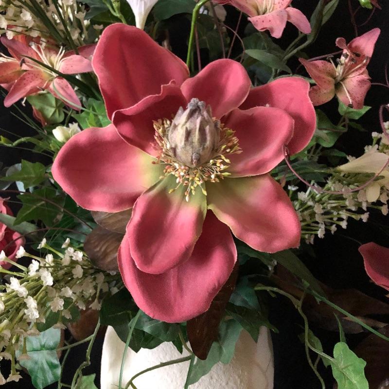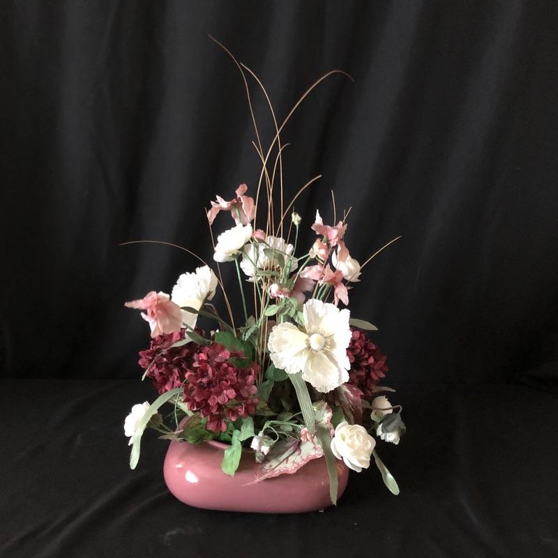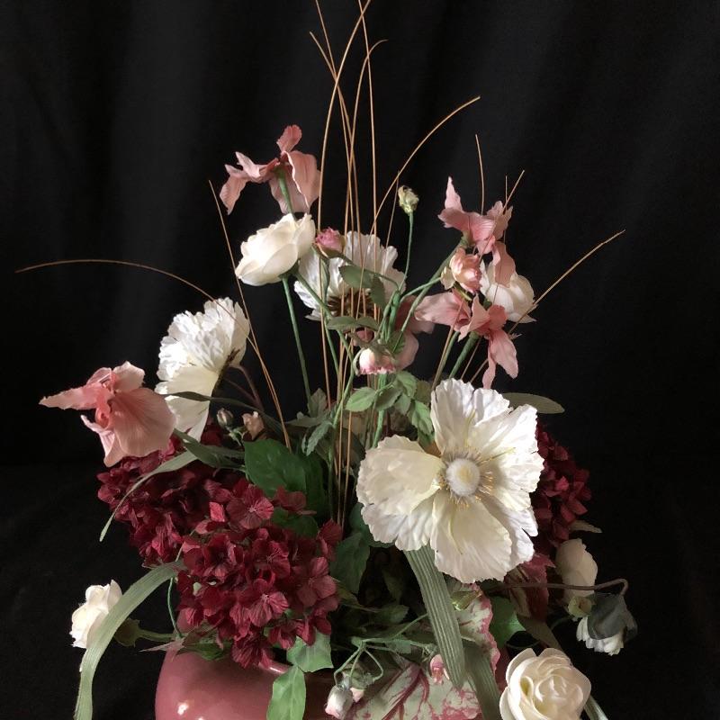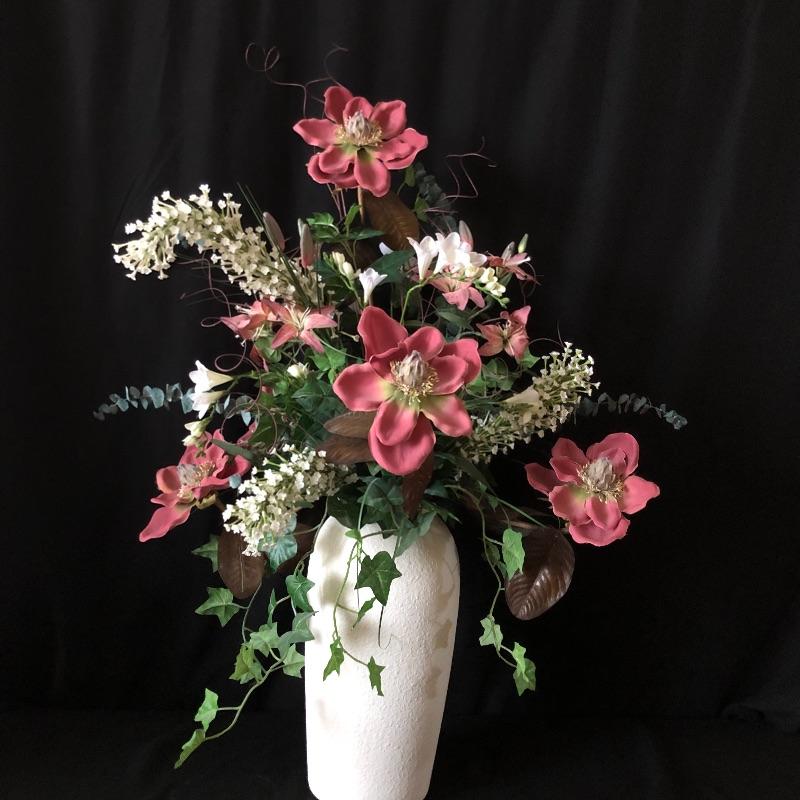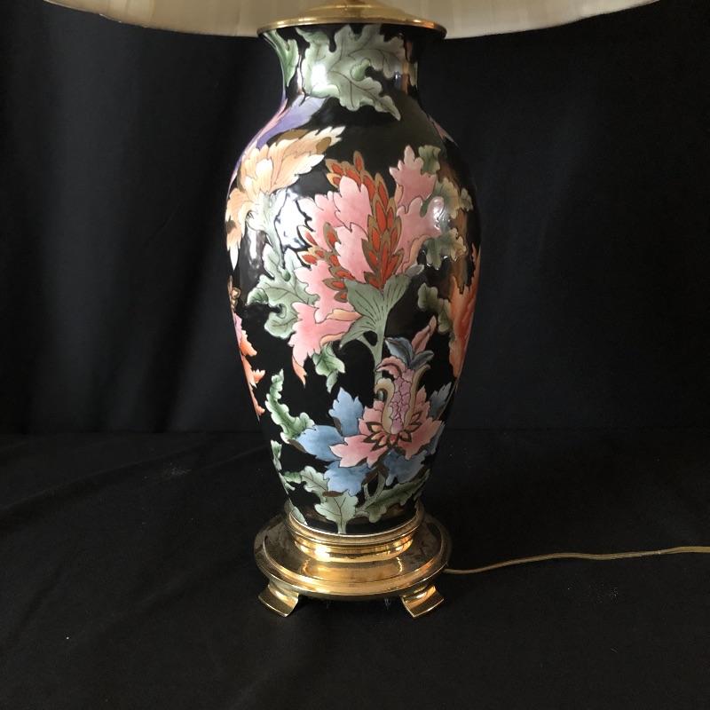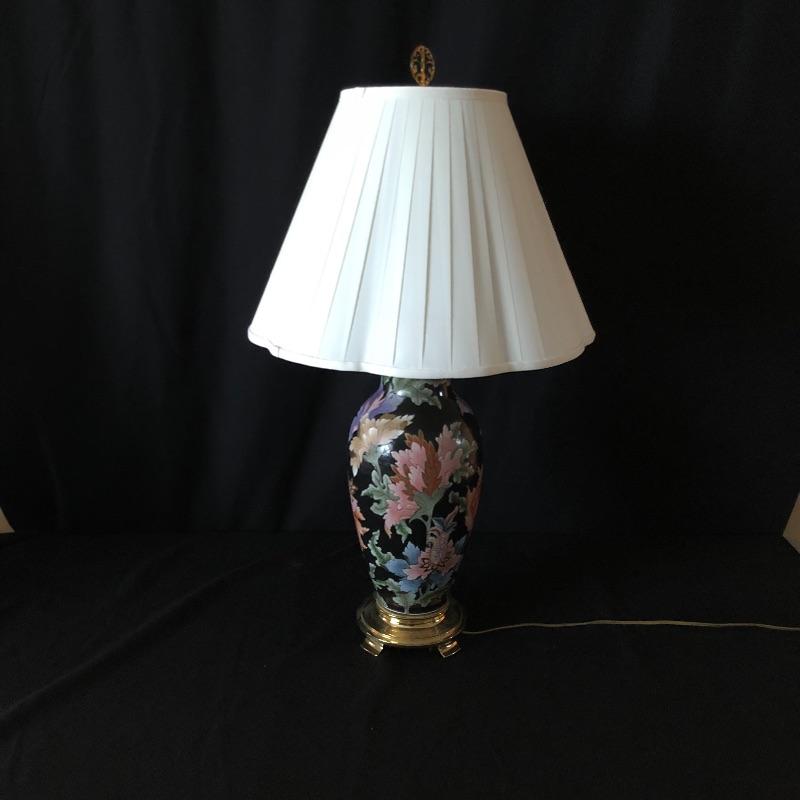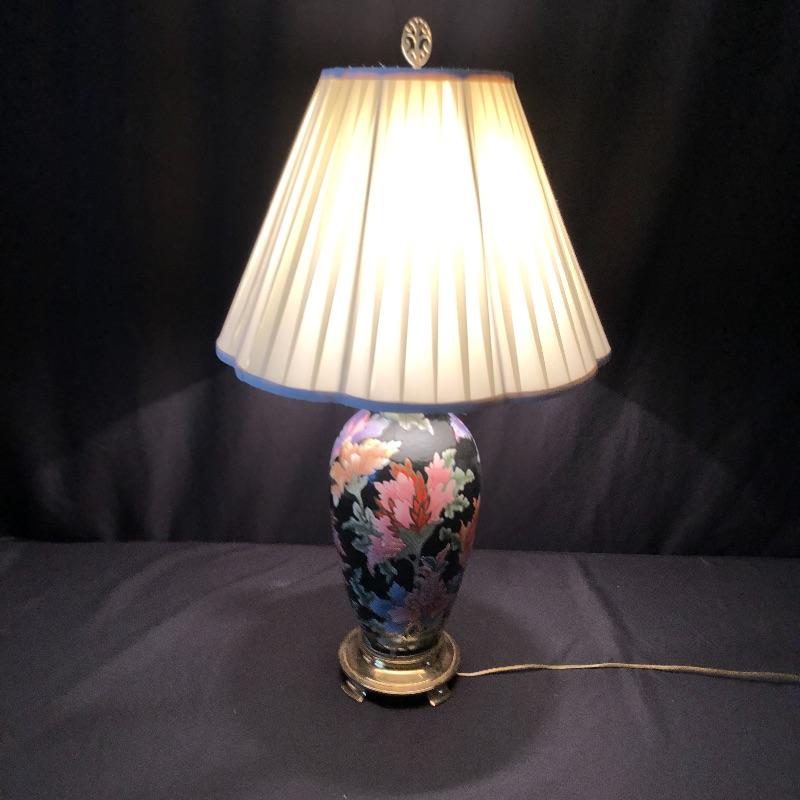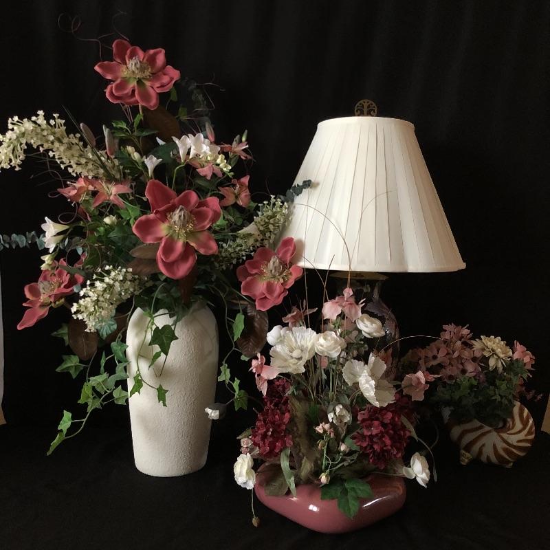 Lot include lamp with floral design faux floral arrangement in white vase and two smaller faux flower arrangements in vases. Largest flower arrangement measures 41” tall.