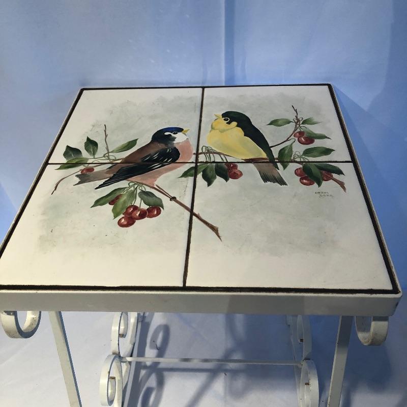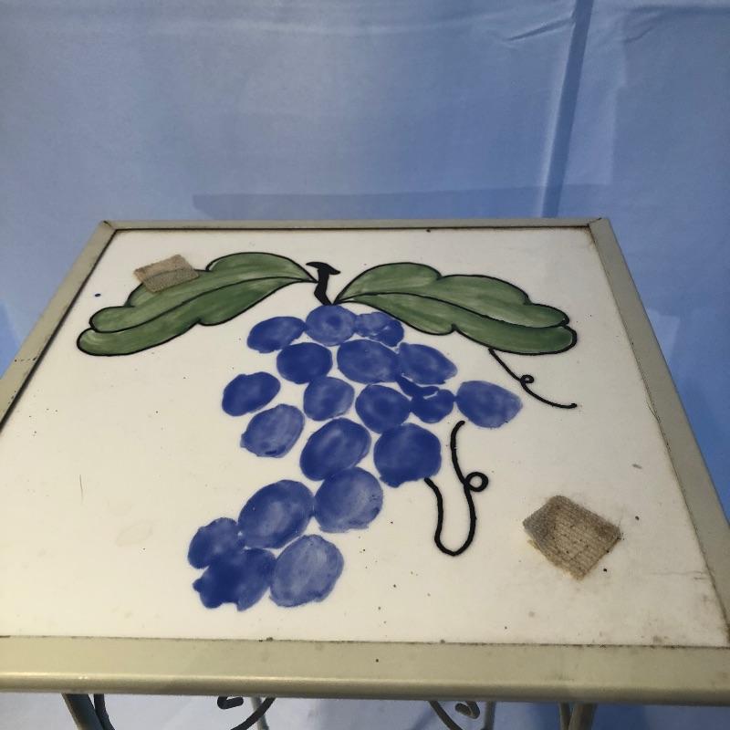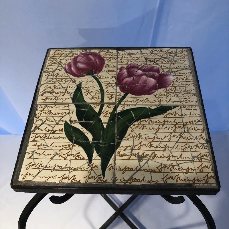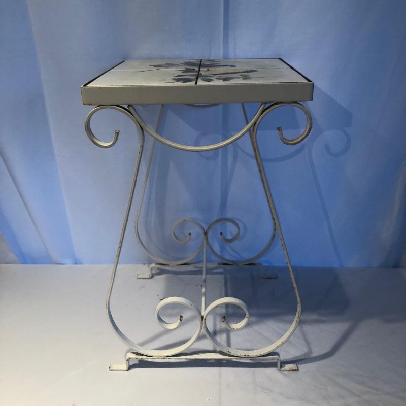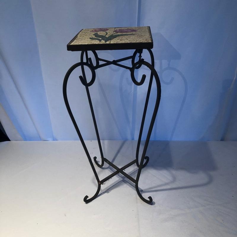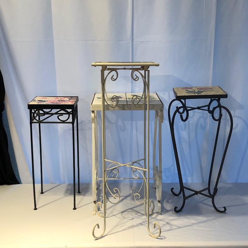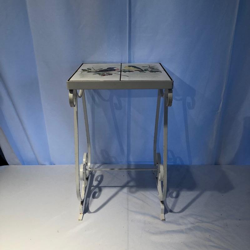 This lot contains four beautiful tile plant stands with flower/nature designs! The first (12.5” x 12.5” x 20”) is a wider white stand with two birds sitting on holly branches. This one is beautiful and would look great in any garden or sunroom. The second (8.25” x 8” x 19.75”) is a little bit smaller, with a beautiful pink and purple tinted rose design. The third (8.5” x 8.5” x 21.5”) is cracked on the top, but beautiful nonetheless, with two purple tulips and cursive design on the top. The fourth (10” x 10” x 27”) is the tallest, a white one with a cute design of grapes on the top. Local pickup only.