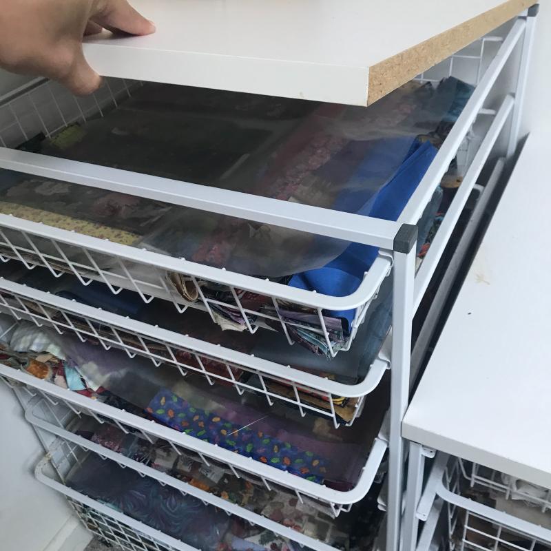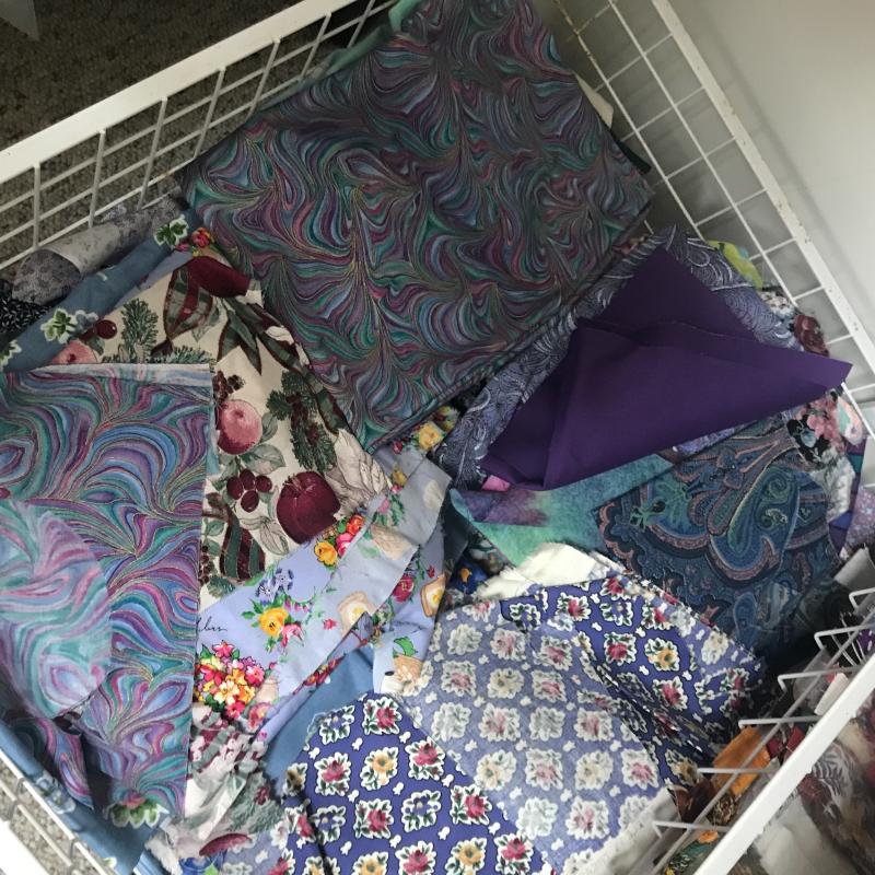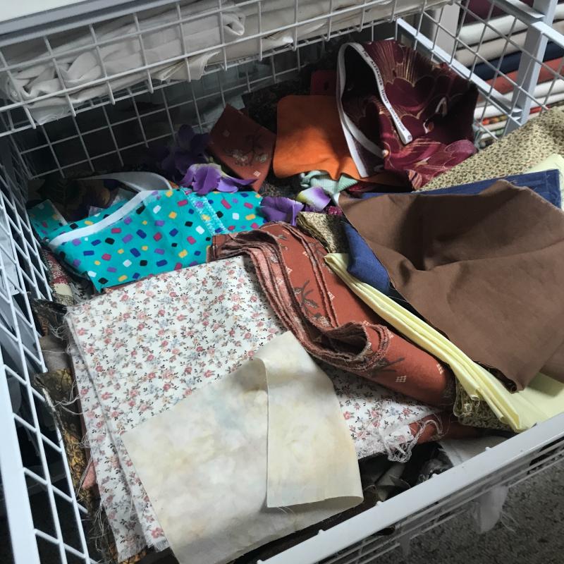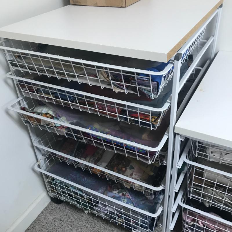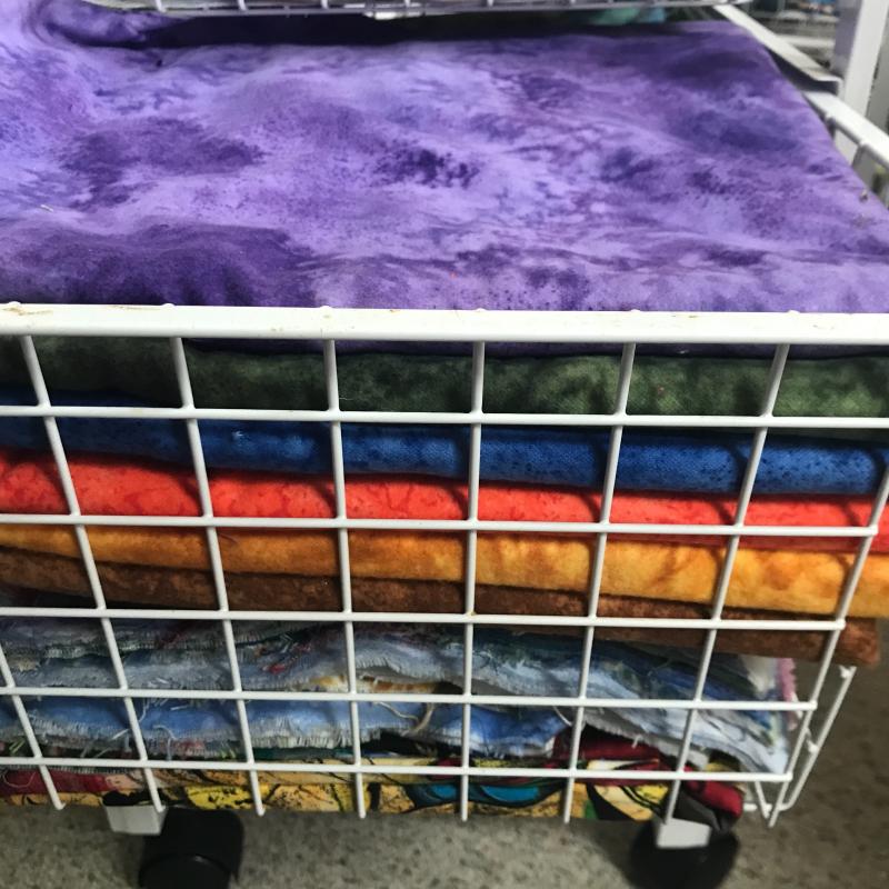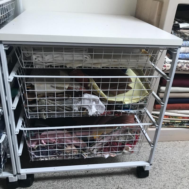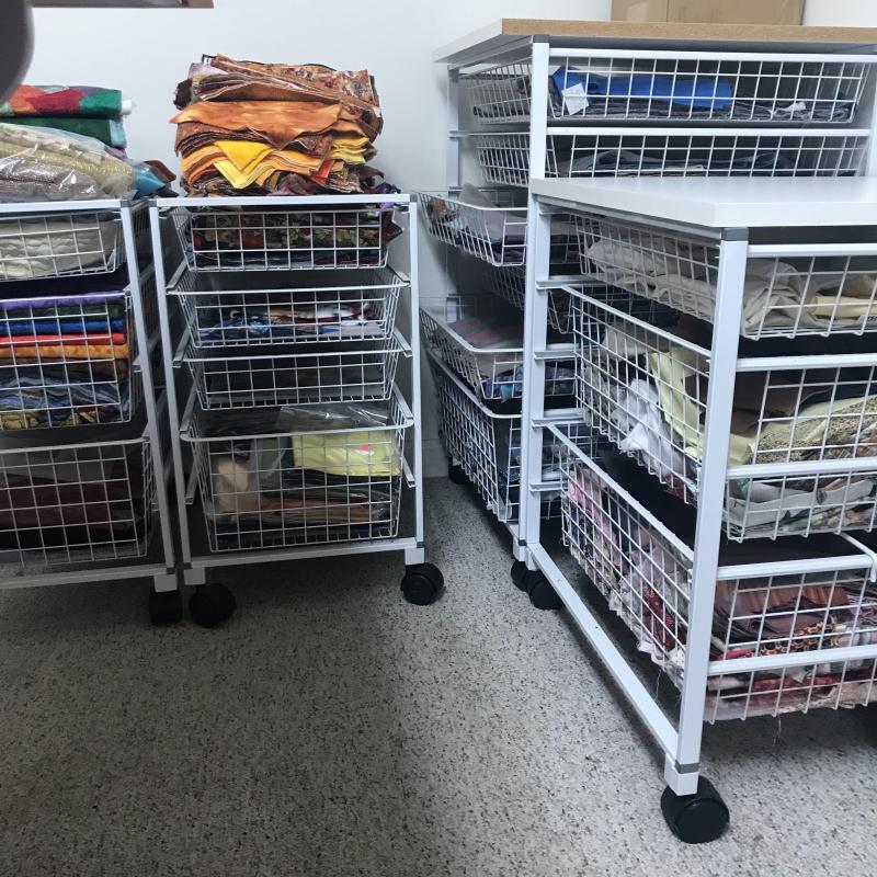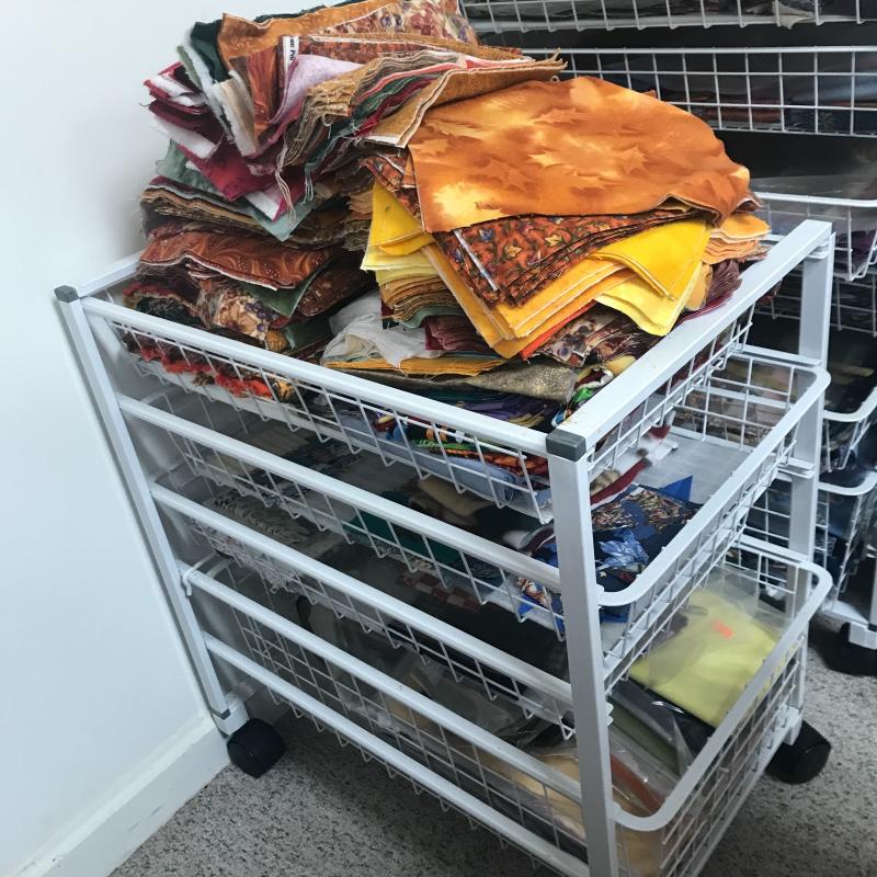 This lot includes four rolling storage carts. Each cart has layers of quilting fabrics. Some are yards, some fat quarters and some cut strips. See photos for details. No shipping. We encourage you to come to the preview to see fabric details in person. Tallest cart is 22.5” x 21” x 32”h., next tallest is 24”h. Two smallest carts are both 21” x 14” x 24”h. The two larger carts have removable tops that were not included in measurements.