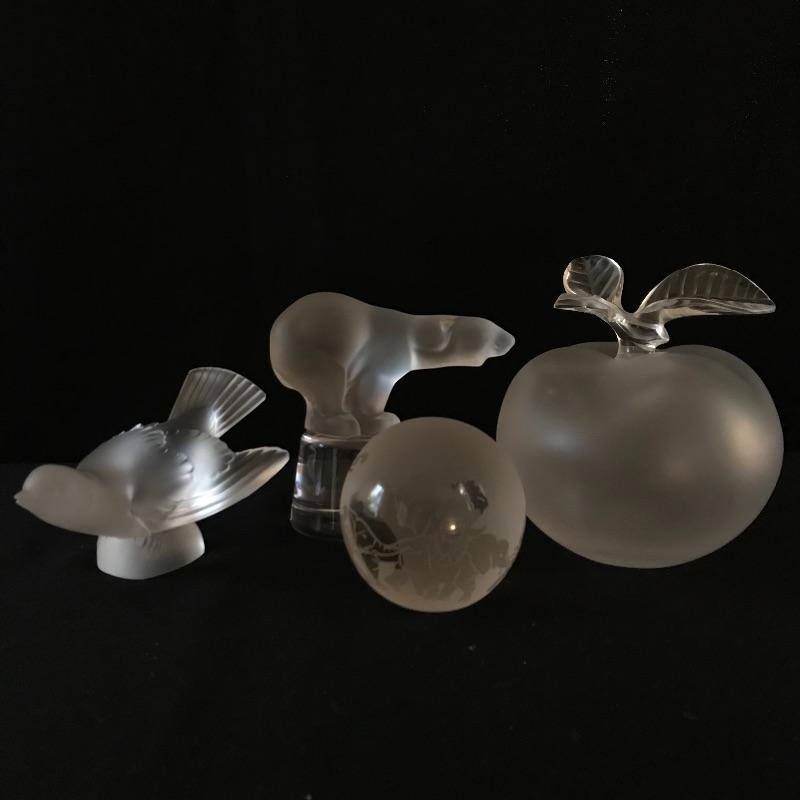 Fun collection of frosted favorites! The apple and bear have signatures noted in photos, the bear appears to be Sevres. The apple also doubles as a perfume bottle with stopper, while the others are all solid glass. The apple stem hits the highest measurement at 6”. See photos. Shipping available.