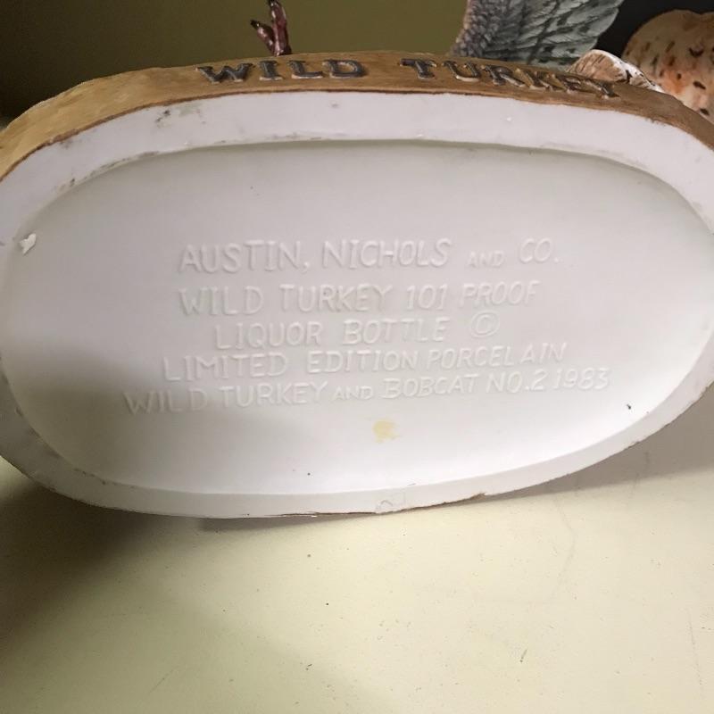 Two Austin, Nichols’ Wild Turkey porcelain decanters. One Wild Turkey and Bobcat No. 2 1983 and the other is a Wild Turkey and Falcon No. 11 1986. Both are empty and have broken seals and corks. They come with original boxes and styrofoam packaging. The bobcat box is the largest and measures approximately 12.75” x 9.25” x 11.5”. Large decanters are accompanied by a small miniature decanter with a partial broken seal and named “Mini No. 3”. Shipping available.