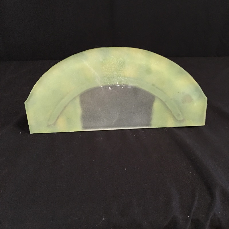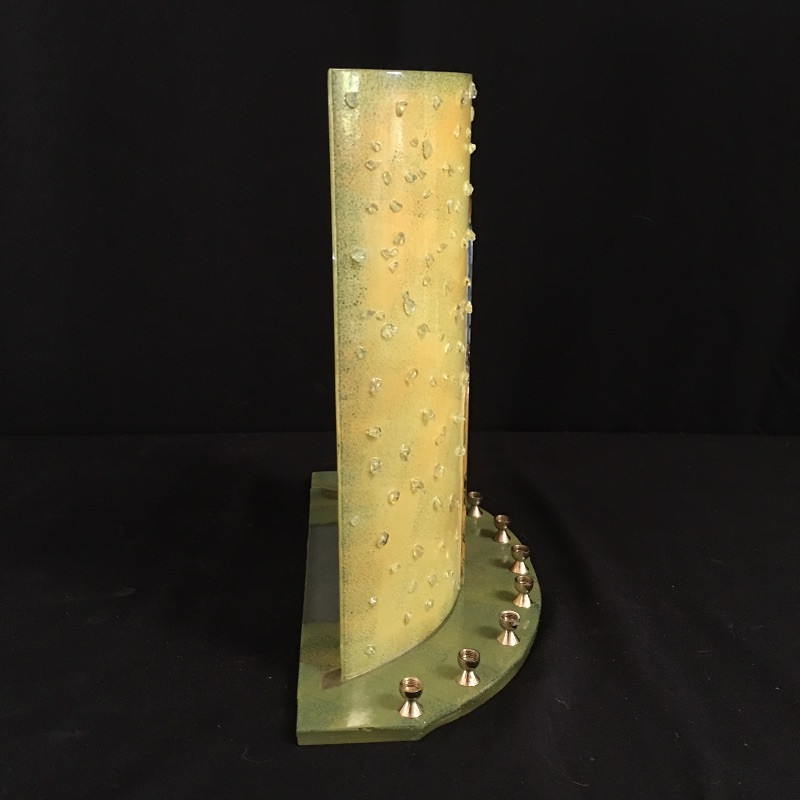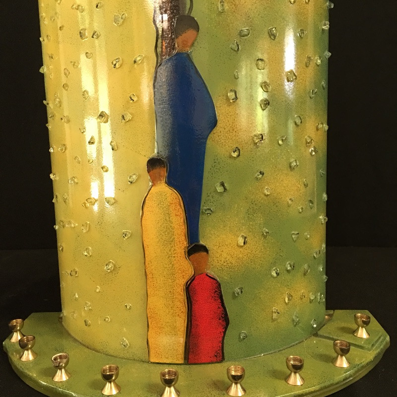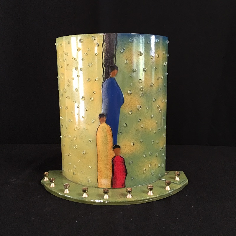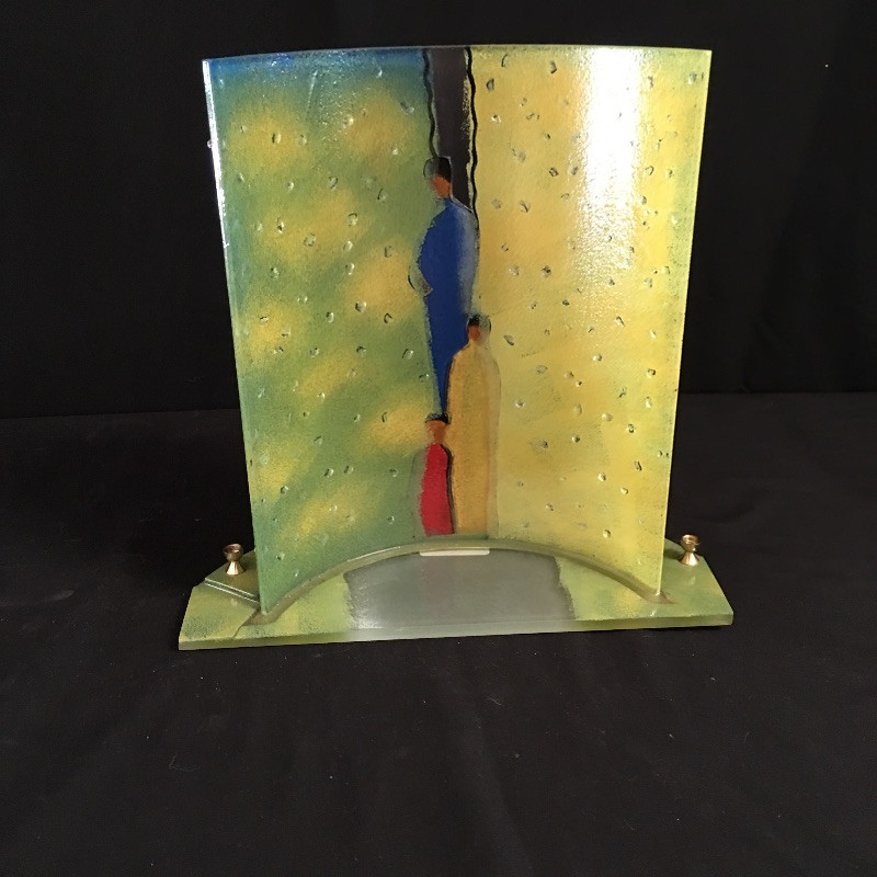 Take a moment to consider this unique piece of glass art. This stunning piece is in a curved design with 3 figures on the front. It has 9 places for small candles if you would like to use it as a menorah. Or just put a light behind it to brighten the colors of this piece - yellows, blues and greens. Art measures 5.75” x 12.25” x 12”.