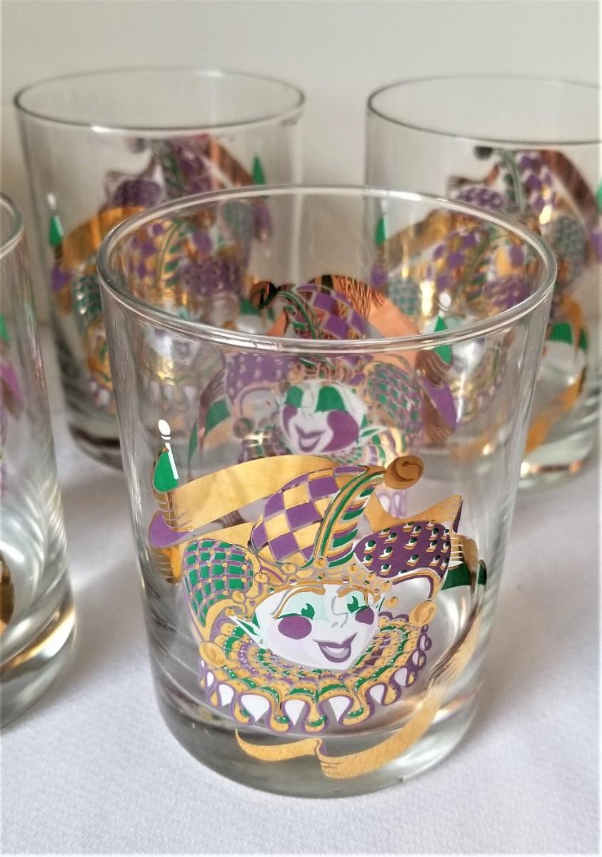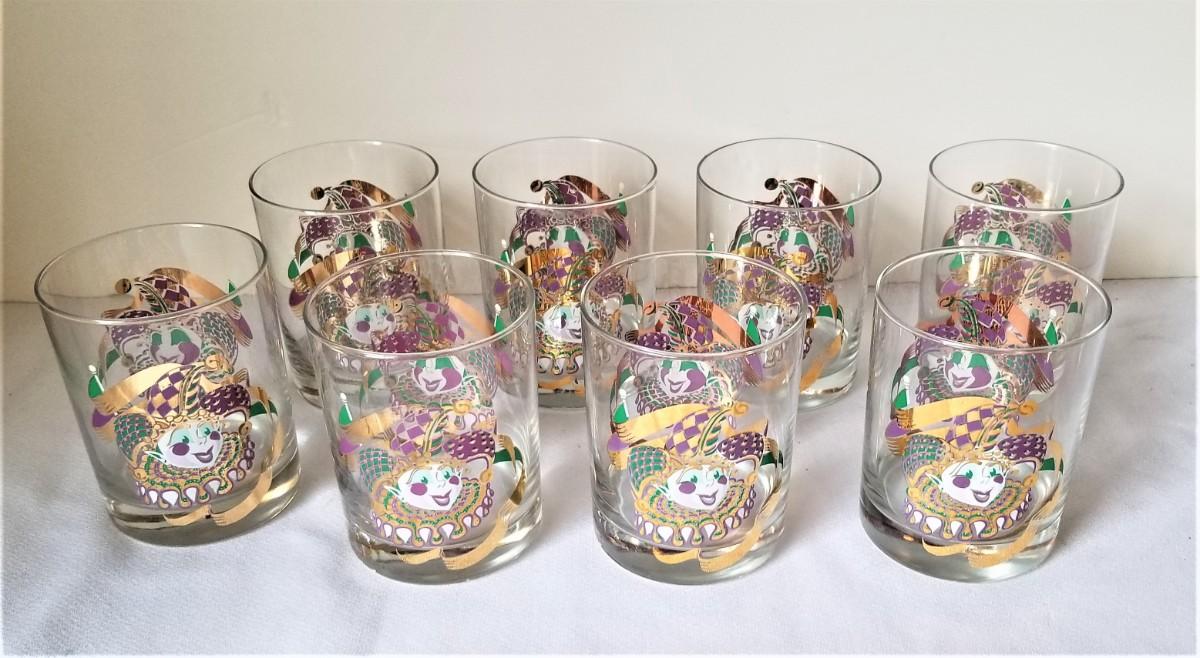 Set of 8 Mid-Century rocks glasses with Mardi Gras theme. Good condition. Each stands 4" tall.