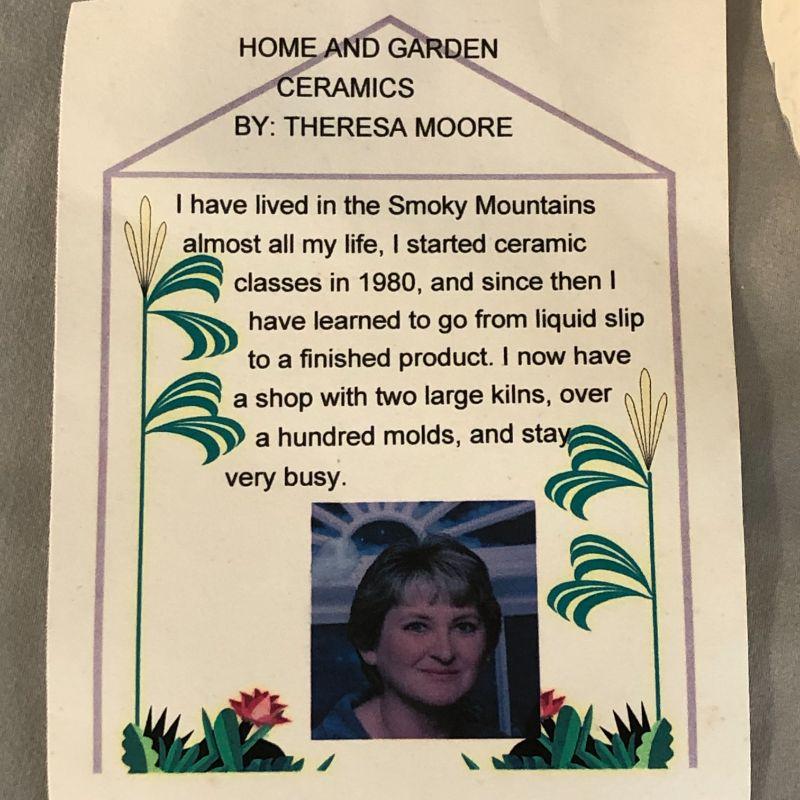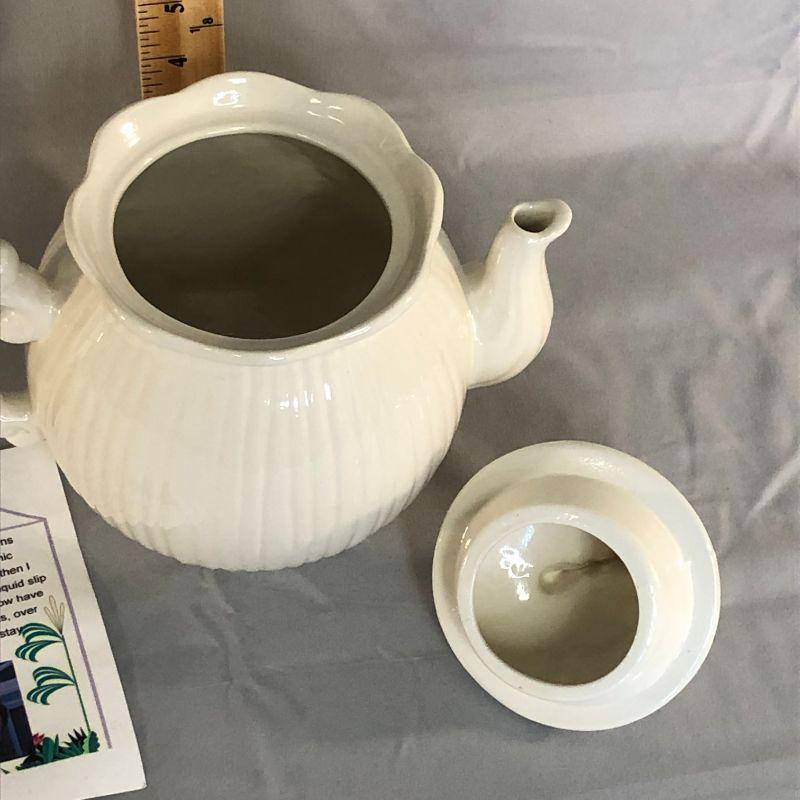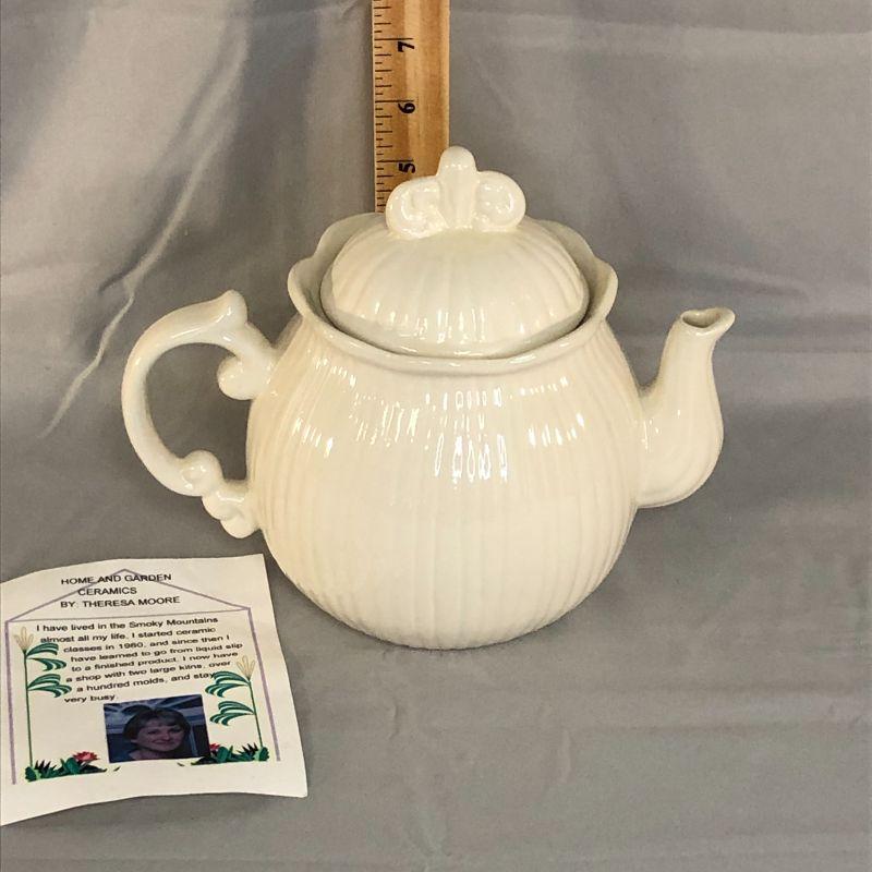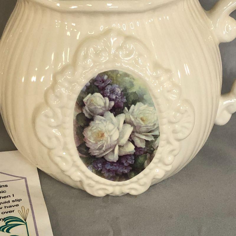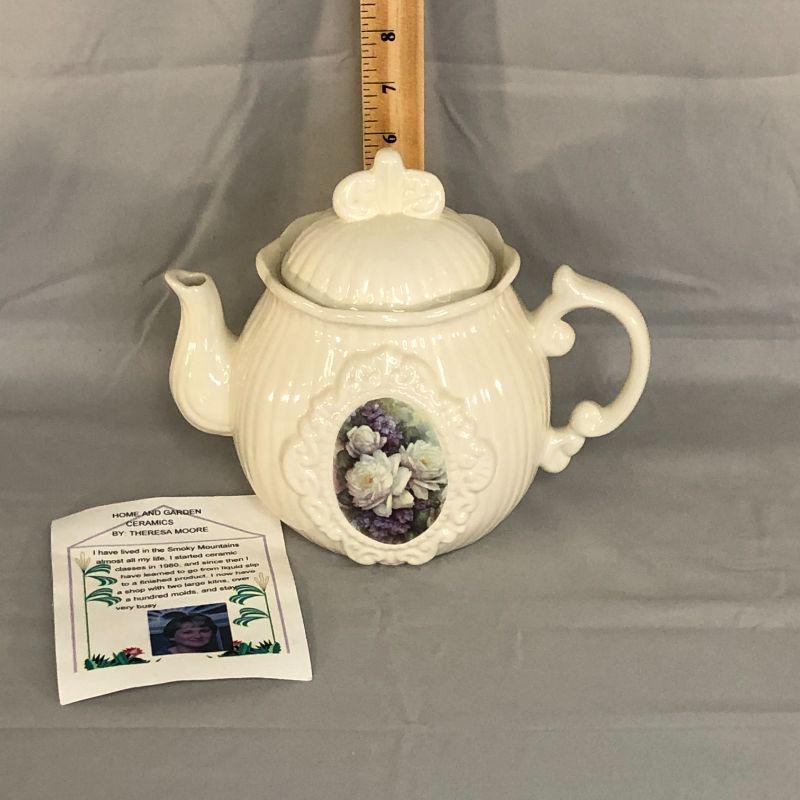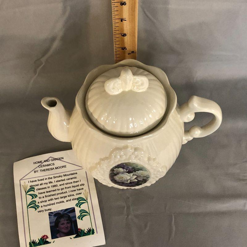 This teapot is in excellent condition with no found chips, cracks, repairs, or crazing. It is about 7.5" tall and the floral picture on the front appears to be applies rather than painted like the rest of the teapot. There is a card included that has the maker's information and very brief history on it.