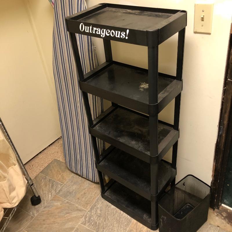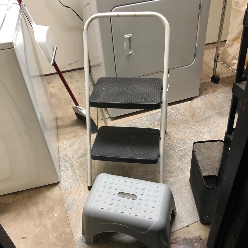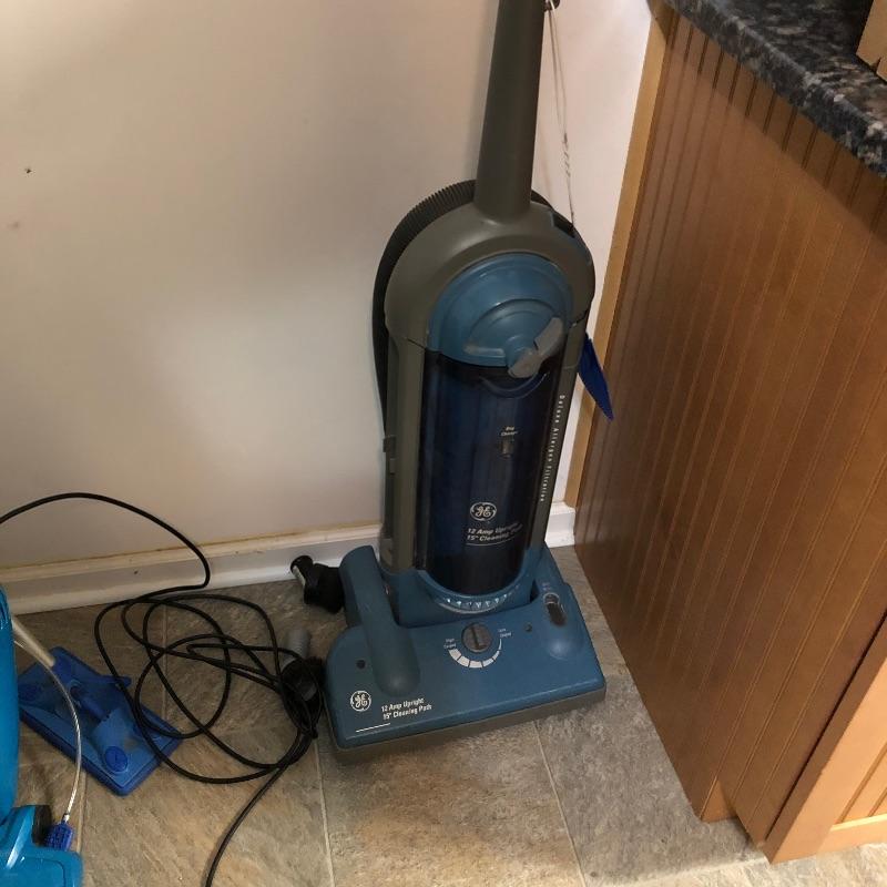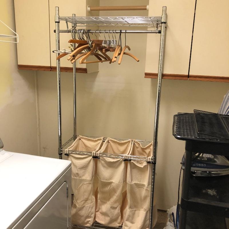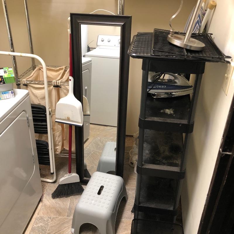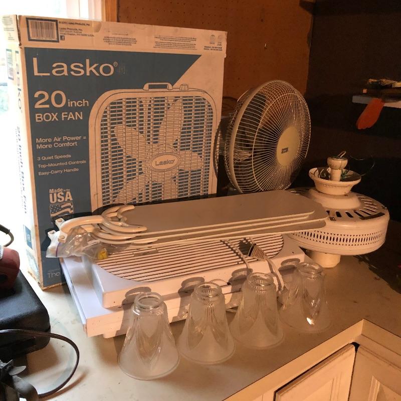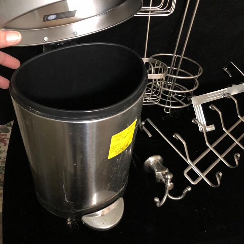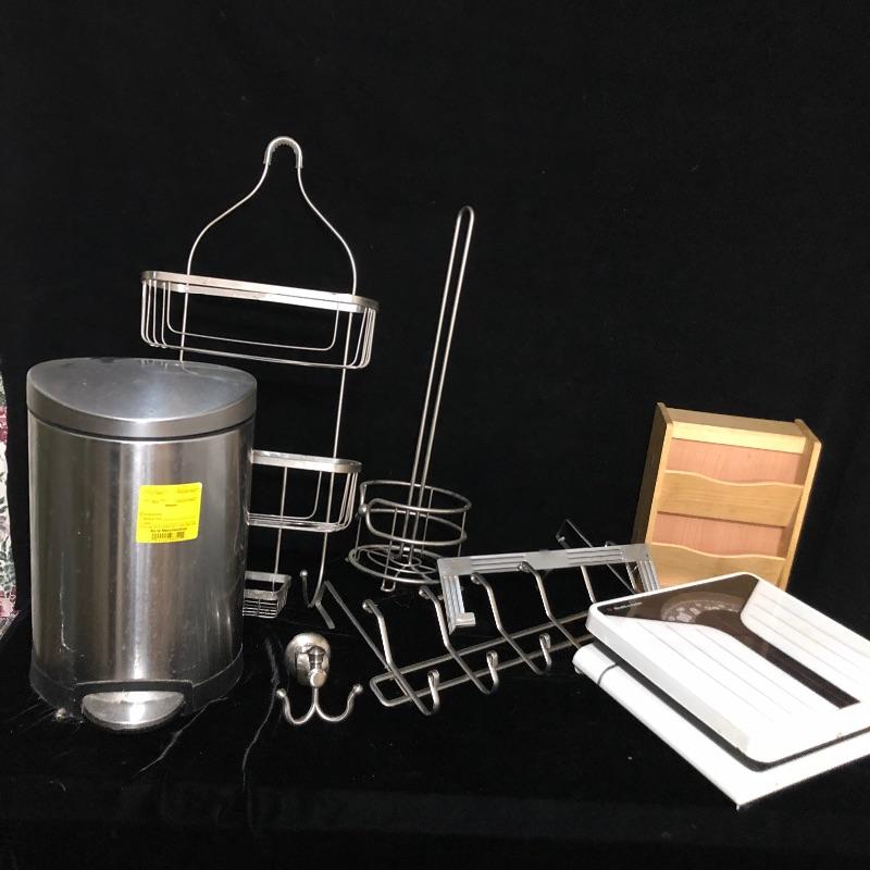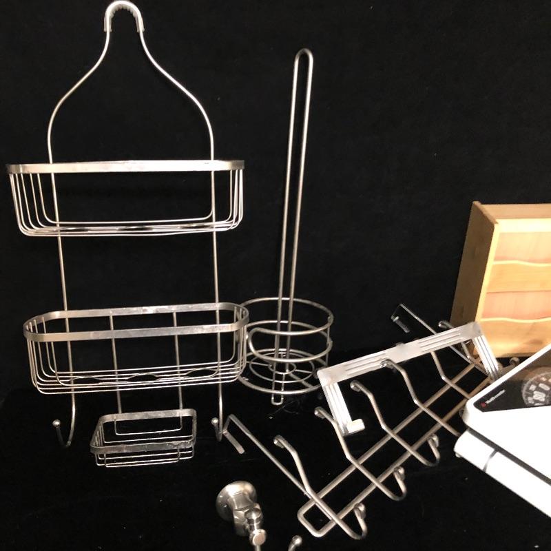 Perfect lot for first home owners or someone who needs a lot of household accessories. This large lot includes a GE vacuum, Hoover floor cleaner, aluminum trash cans, Black & Decker ScumBuster Kit, lots of chrome colored bathroom accessories, scales and a letter/key holder. The brown curved shower curtain rod, towel, toilet paper holder and more are brand new. The Laundry accessories include a rolling laundry hamper/hanging unit, shelves and much more. Last but not least are an array of fans that includes a white ceiling fan plus 3 more regular fans.