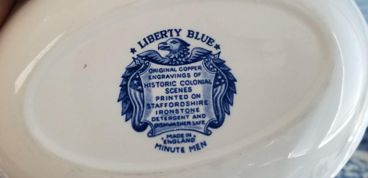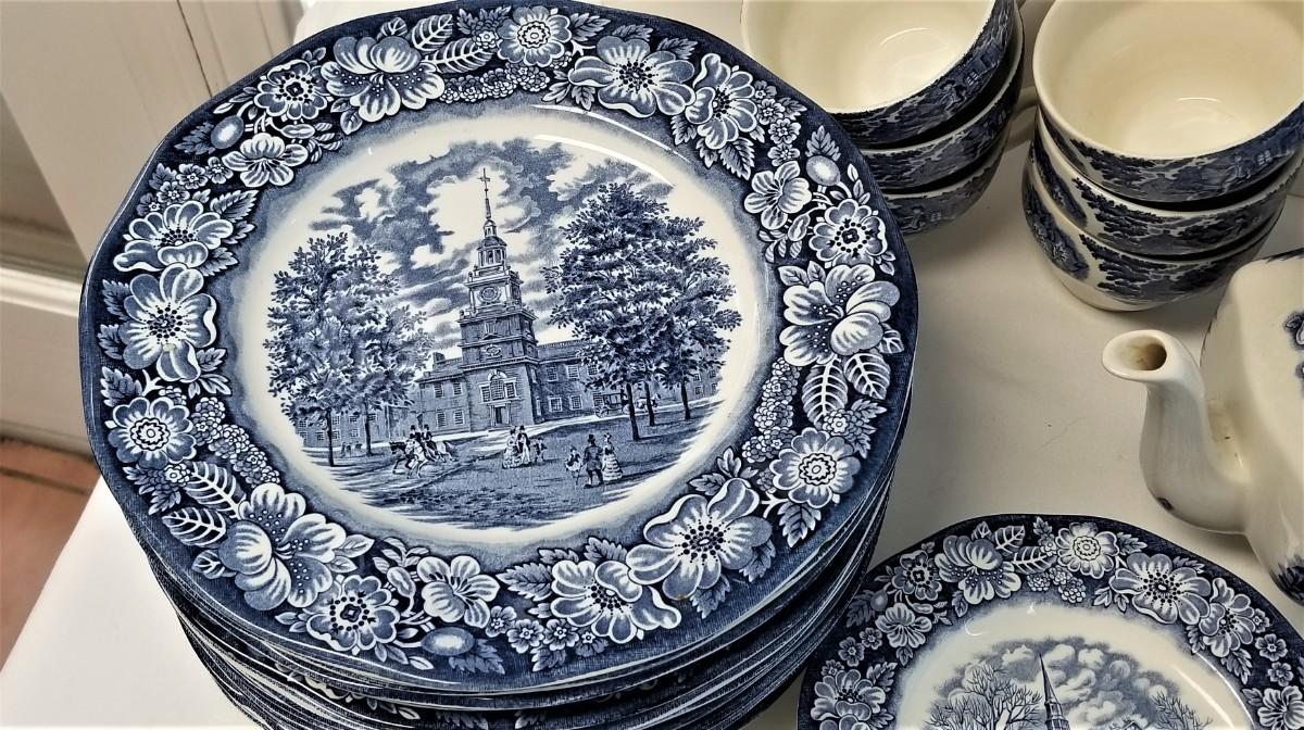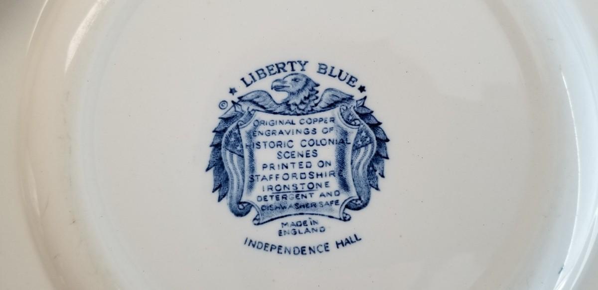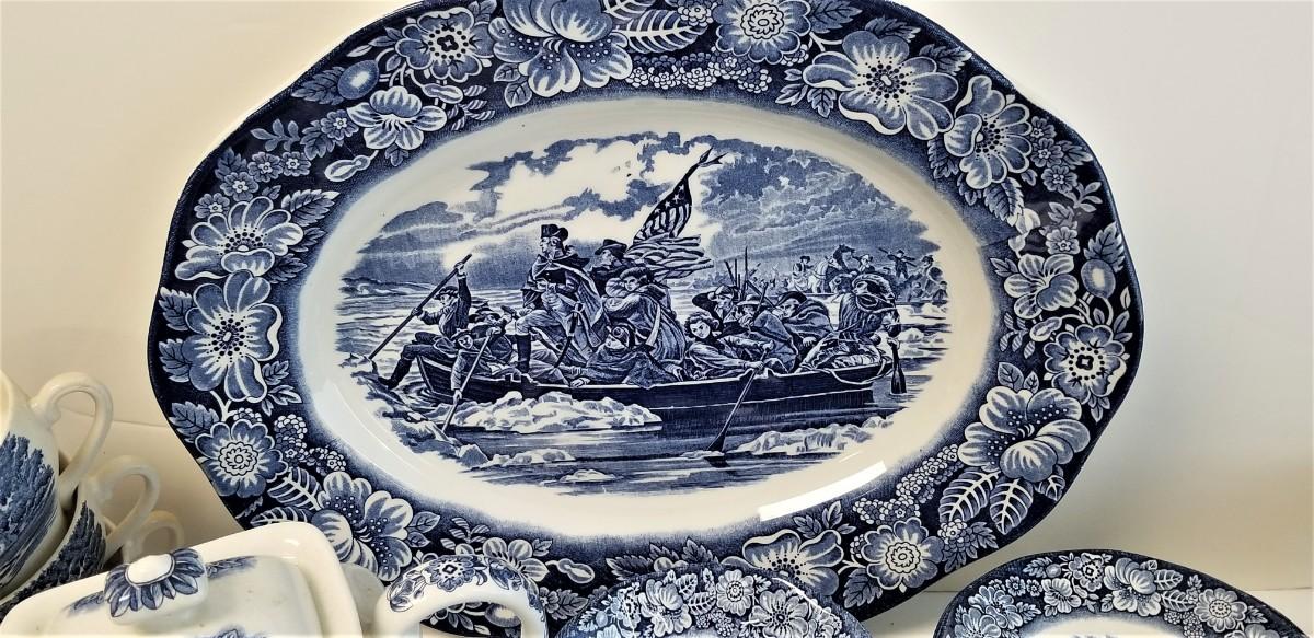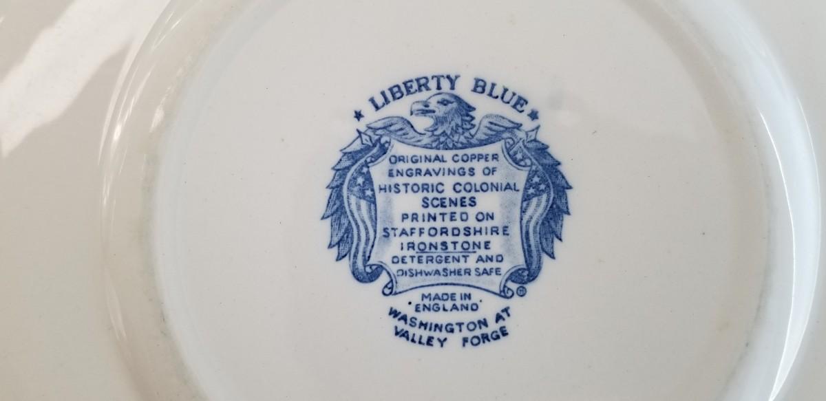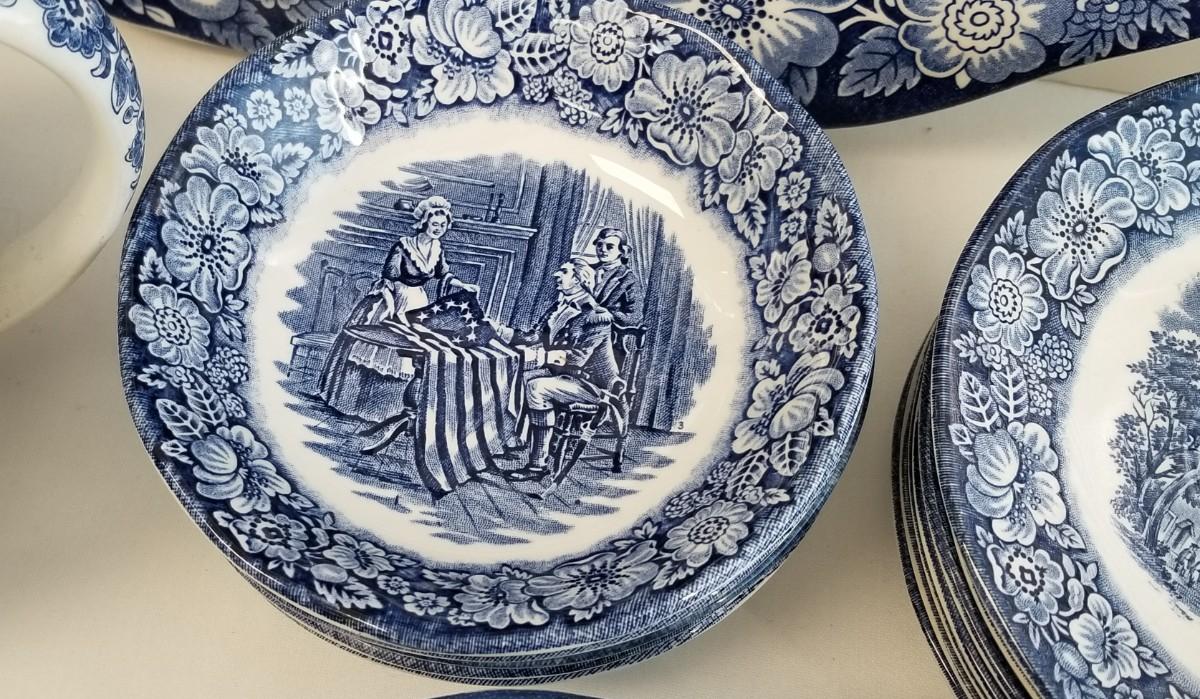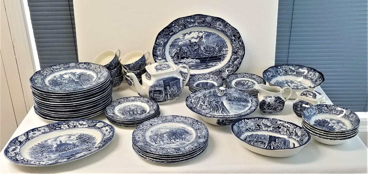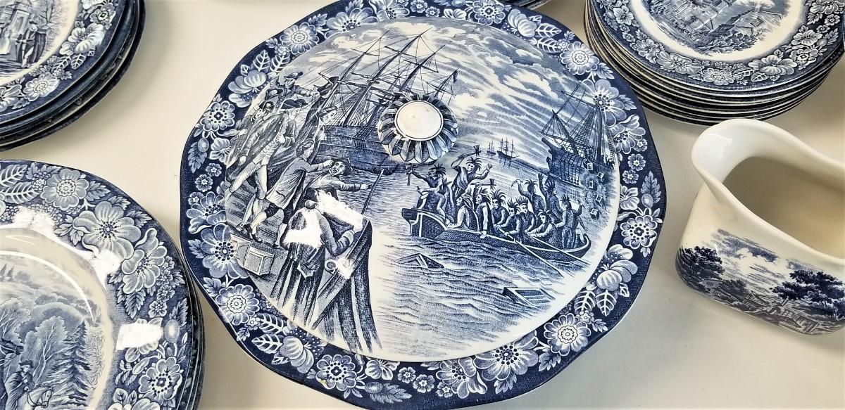 Large grouping of Liberty Blue Staffordshire China featuring scenes from colonial American history. You get all you see here: 13 plates (Independence Hall), 9.75" across, 5 bread/butter plates, 6 cups/8 saucers, covered bowl (Boston Tea Party), 5 small bowls (Betsy Ross), 5 salad plates, Teapot, cream/sugar, 2 serving bowls, 2 platters (larger 13.5" across - Washington Crossing the Delaware), All in gently used condition. Very attractive. Good Dealer lot here!
