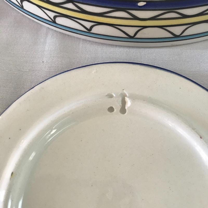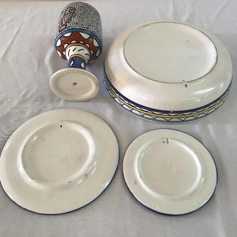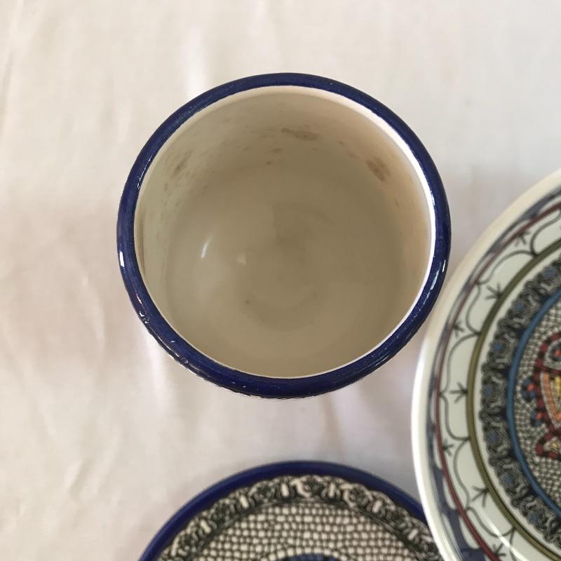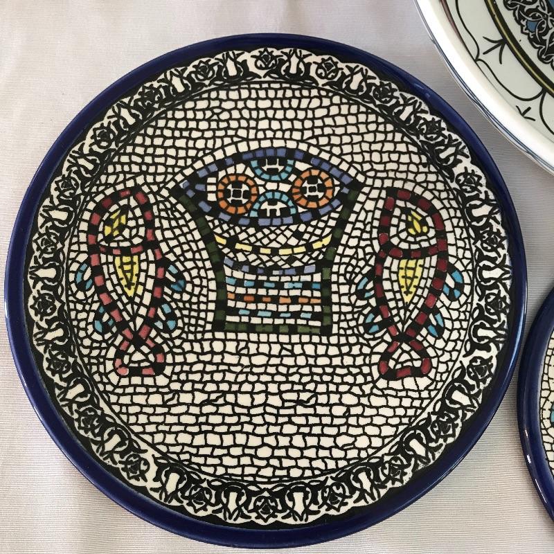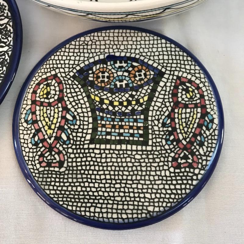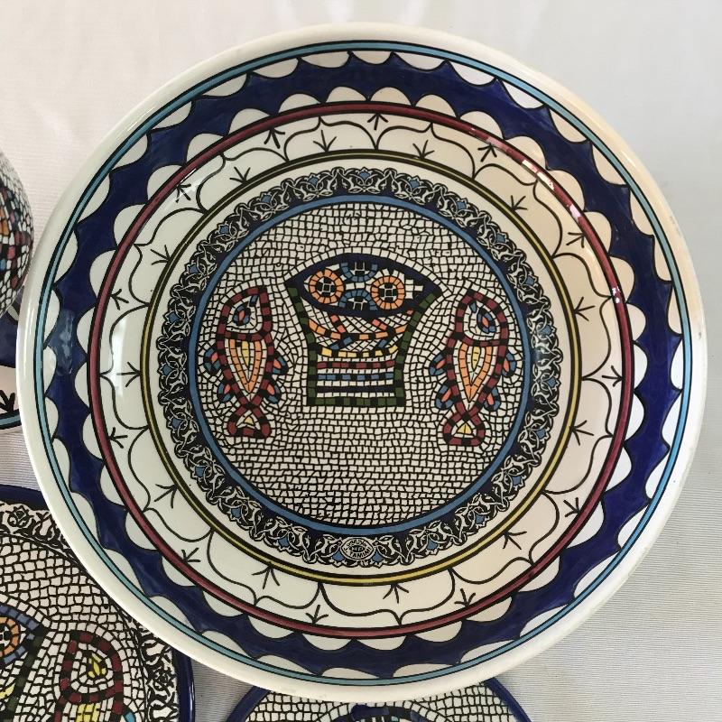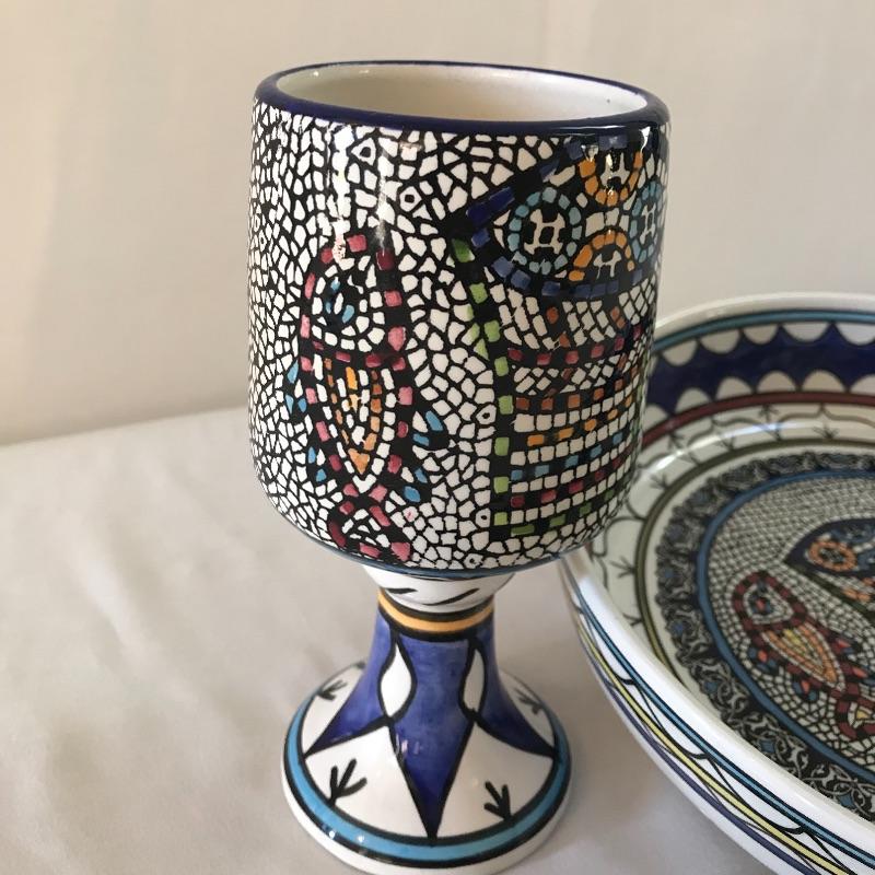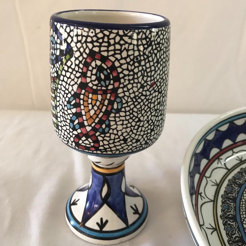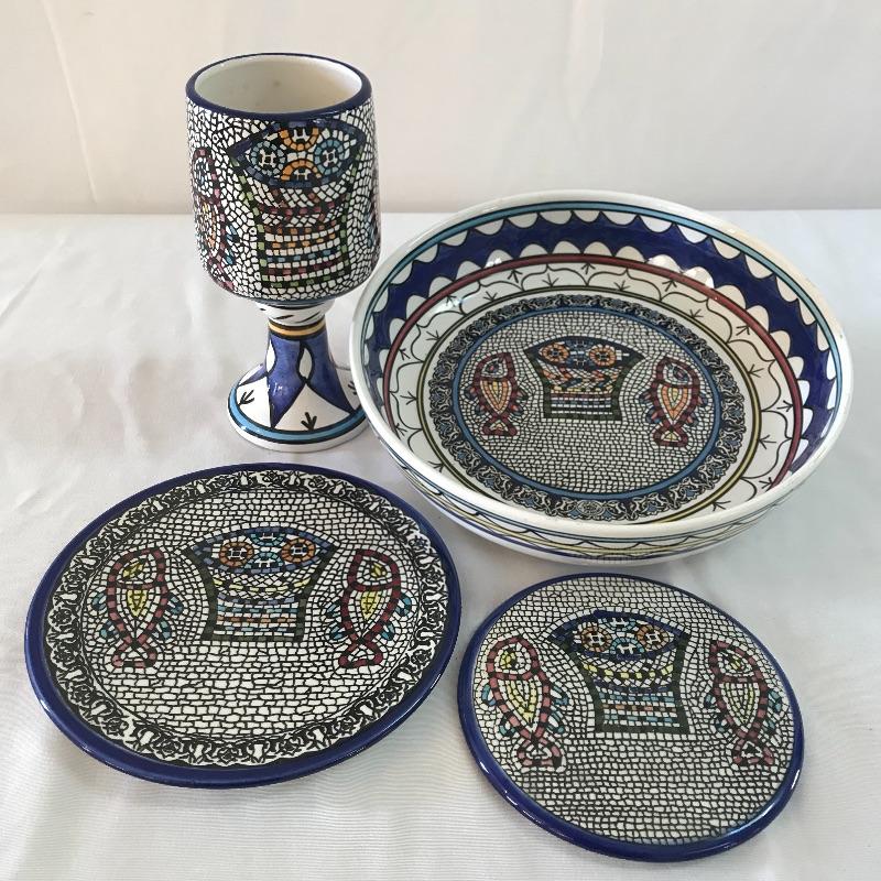 Lovely communion set consisting of two small plates, goblet and paten. All have “loaves and fishes” adorning each dish. Previous owner has stated dish set is from Israel, but no artist mark was located. Dishes also appear to have hanging capabilities. Paten has a 9” diameter and goblet is 7” tall. Shipping available.