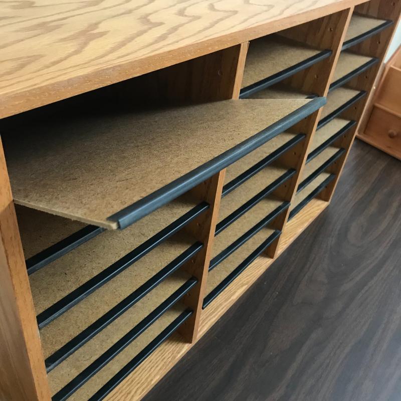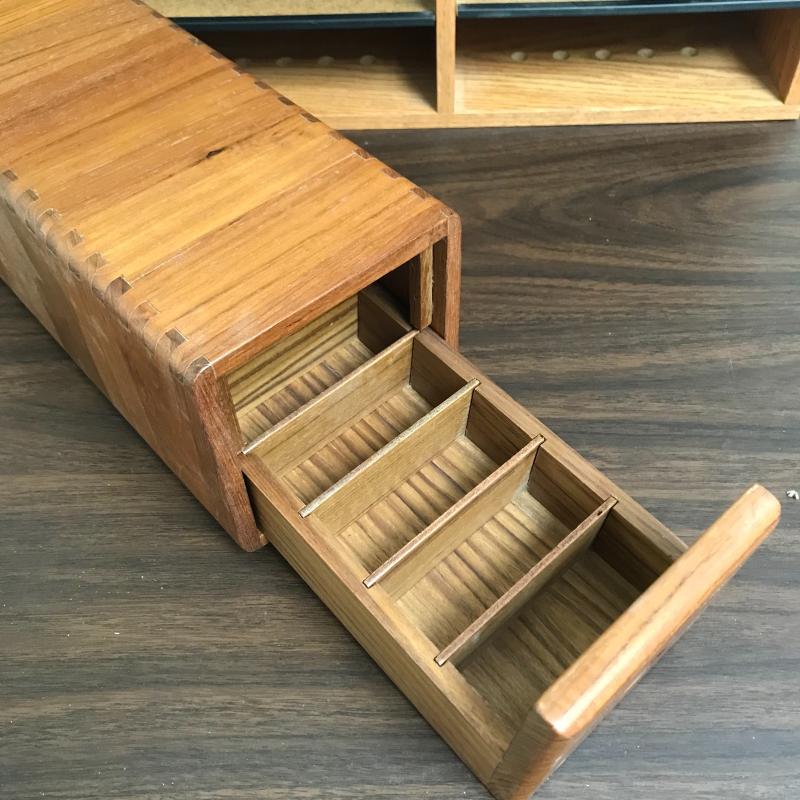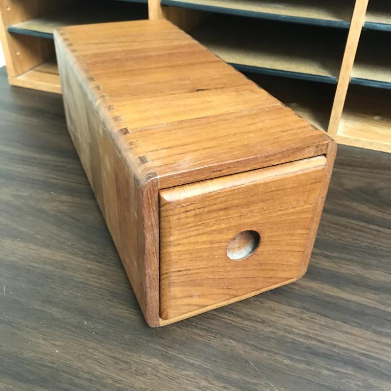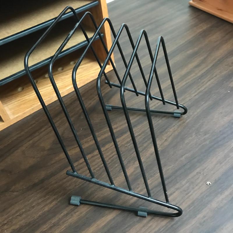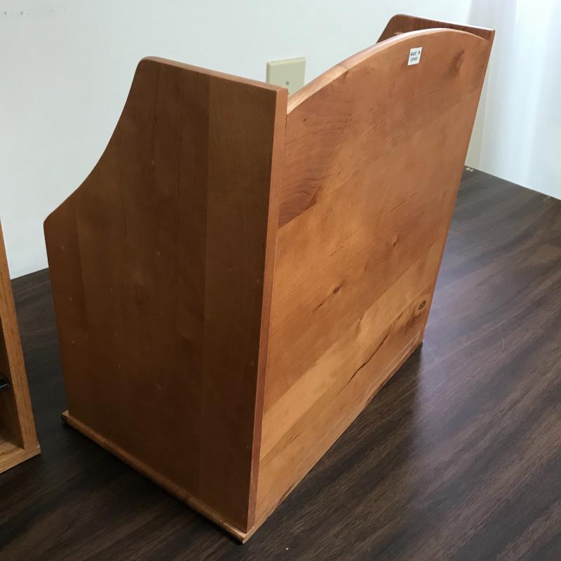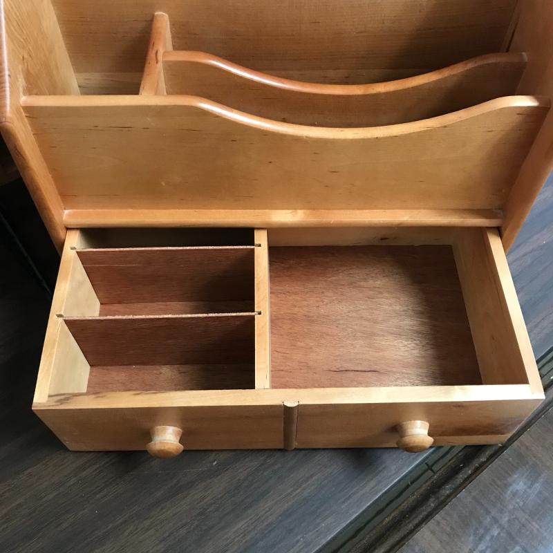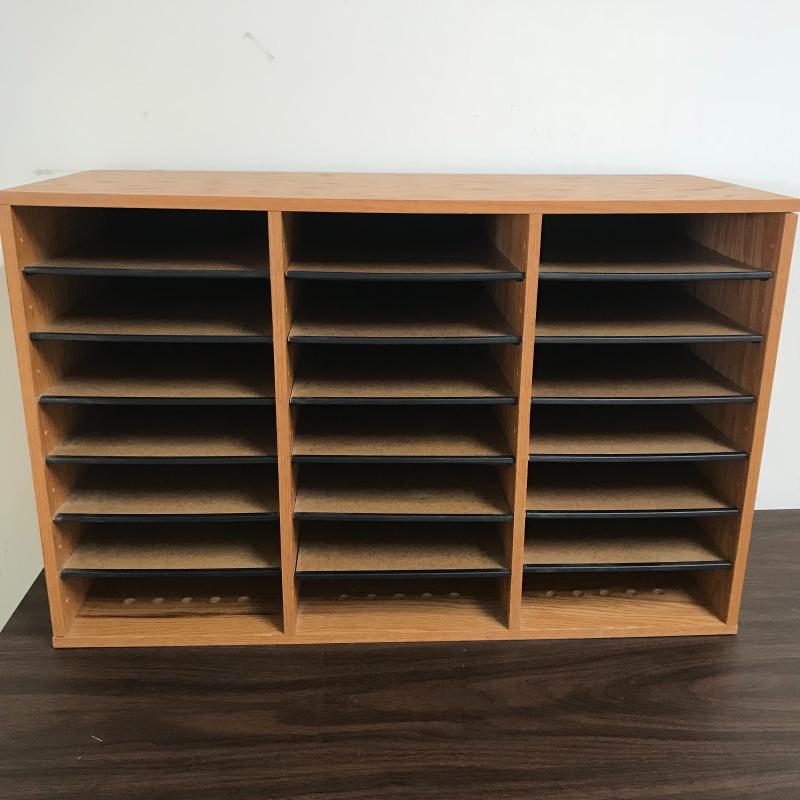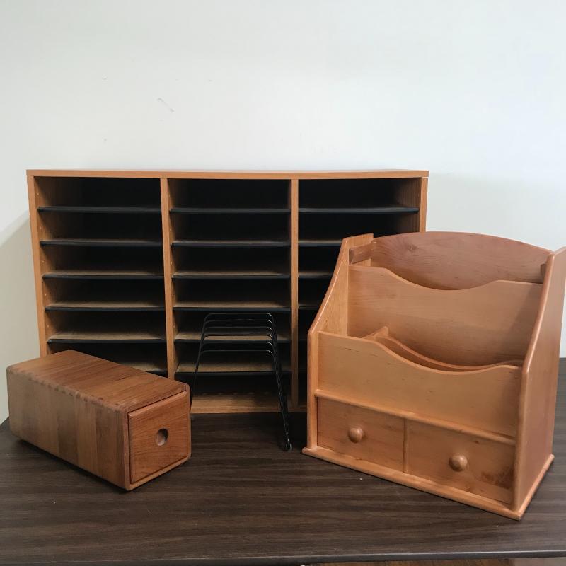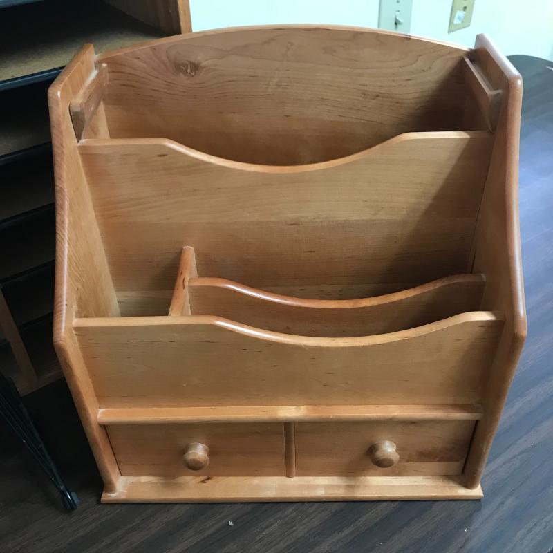 Large organizer/office mail box measures 29.5” x 12” x 19” with adjustable shelving. The medium sized organizer is finished on all sides and has many dividers to keep your work area clean. Lot also includes a wooden floppy disc box that is the perfect size for business cards or perhaps another use. Lastly, lot includes an ascending metal desktop file organizer. Local pick up only.