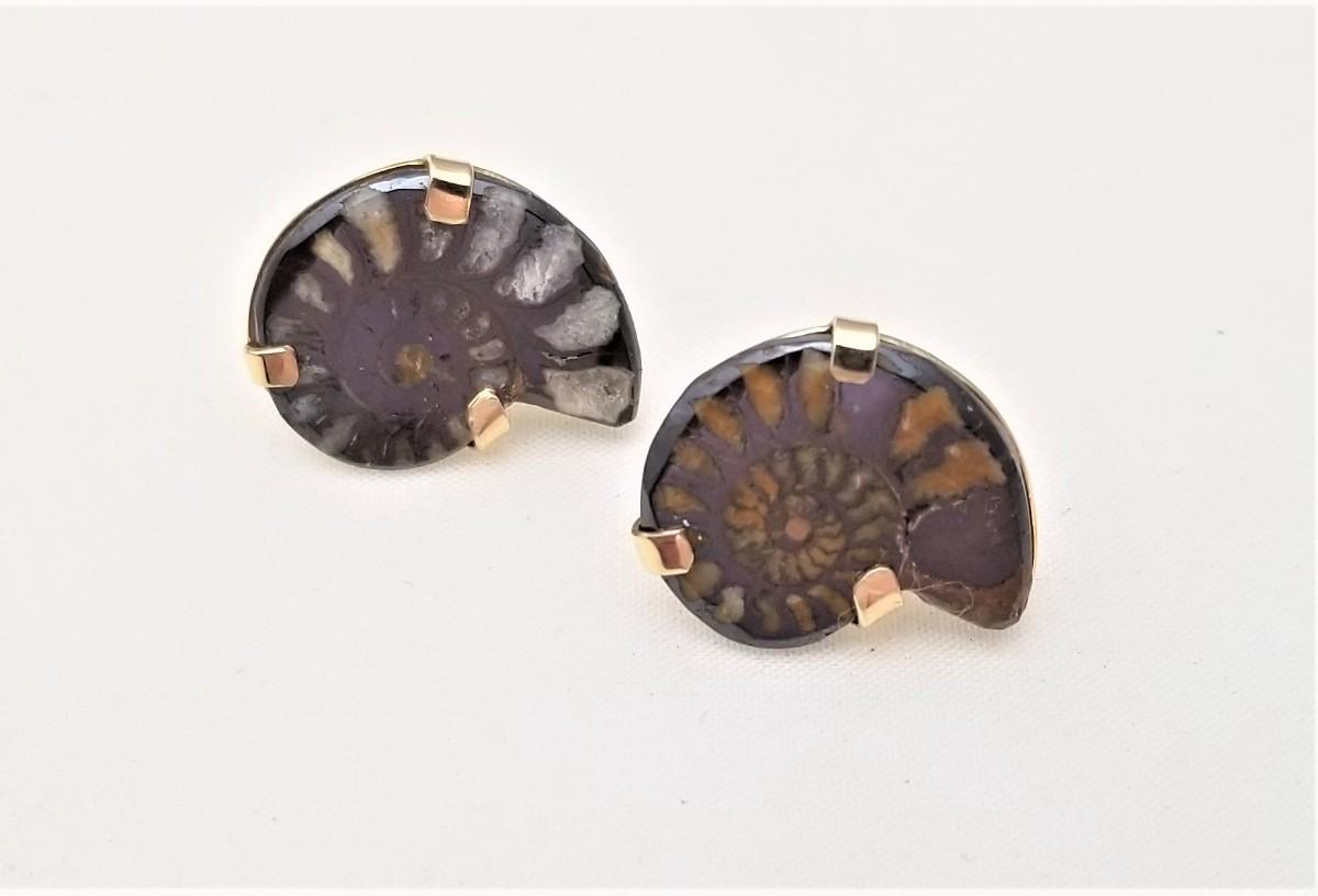 Lot #20  Pair of Ammonite Fossil Earrings, set in 14kt gold.