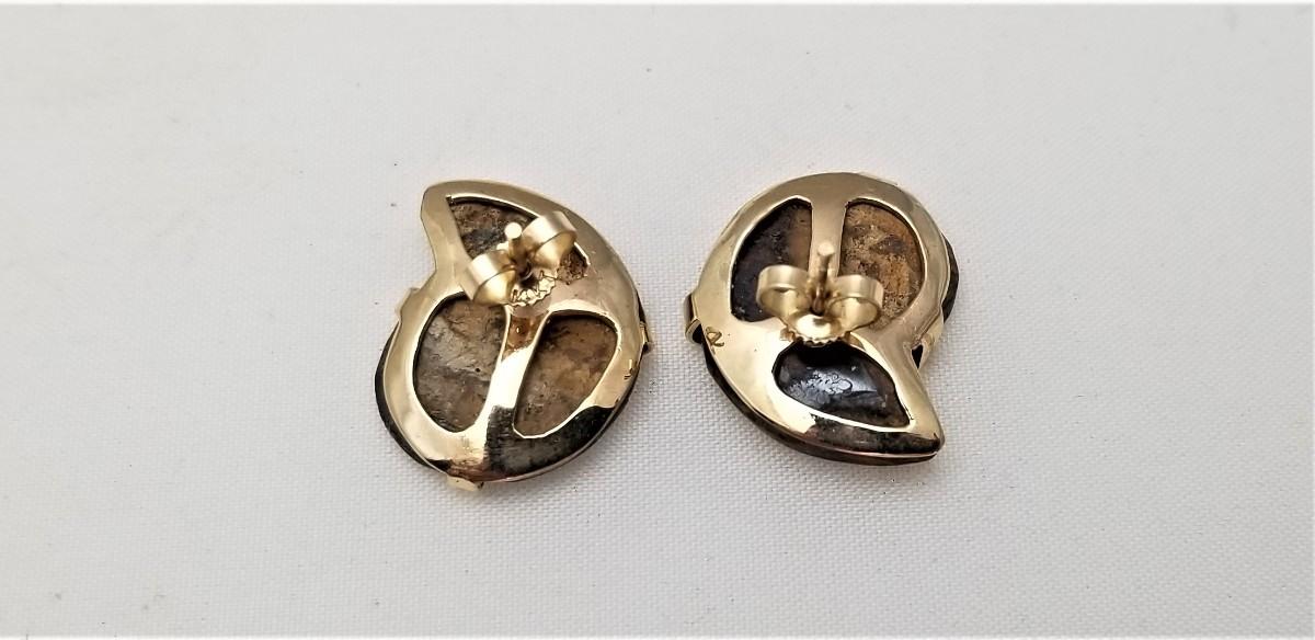 Interesting pair of polished Ammonite fossil pierced earrings set in 14kt gold mounts (tested) with 14kt gold backs (marked). The Ammonite was a creature that flourished in the Paleozoic and Mesozoic Periods (408 to 65 million years ago). They are closely related to today's Nautilus, Octopus, and Squid. Each measures 1/2 inch across. Good condition. The scrap price of the gold is less than the opening bid.