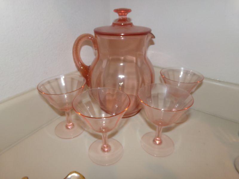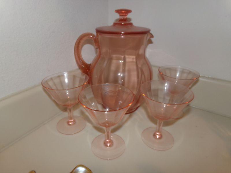PINK DEPRESSION GLASS PITCHER WITH LID AND 4 STEMMED GLASSES