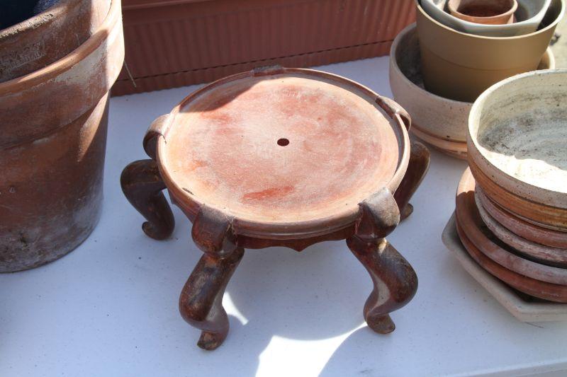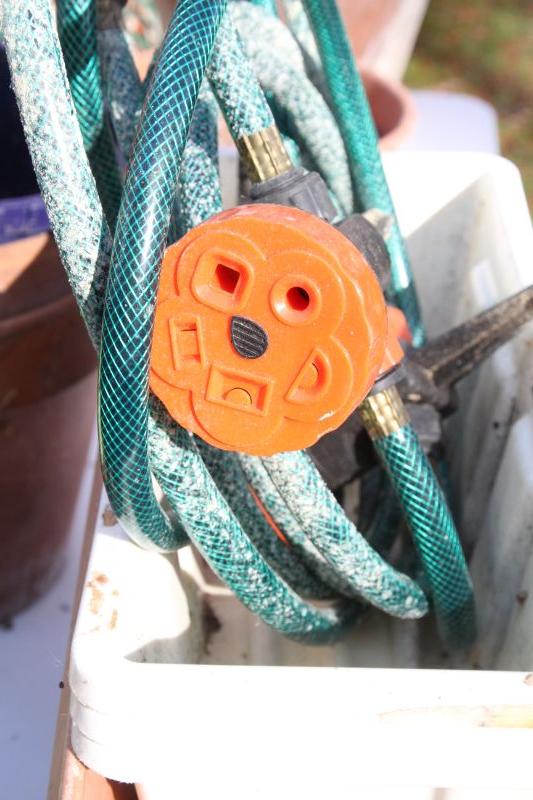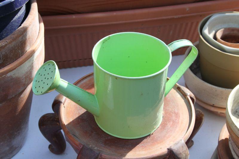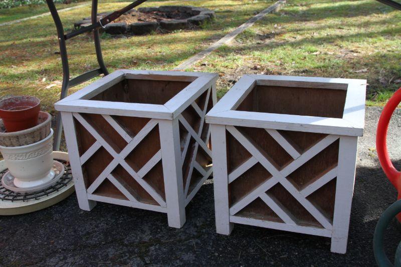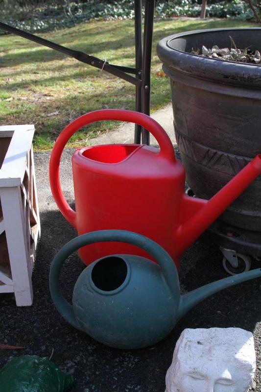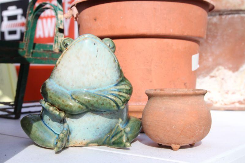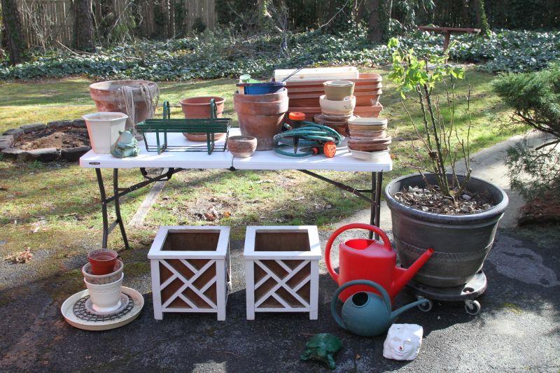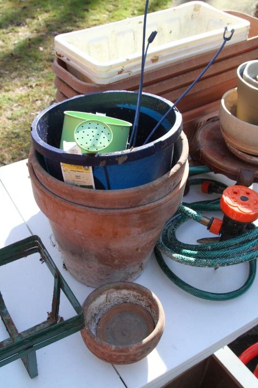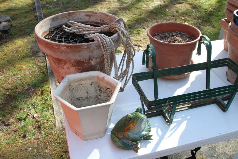 4 plastic 22 x 7 terra cota look window boxes; 2 white plastic window boxes 17 x8; 24" w x 20" H plastic pot on rolling stand with rose bush; spray hose adjustable stream with stakes; 3 watering cans (2 plastic and green metal); 2 asian chippendale wood 14x14x14 white planter boxes; 3 hanging metal porch baskets; a ceramic green frog; a cement green turtle; a faux rock with face and ladybug on nose; a bunch of plastic and terra cota pots and saucers and a wooden oriental plant stand with bowed legs.