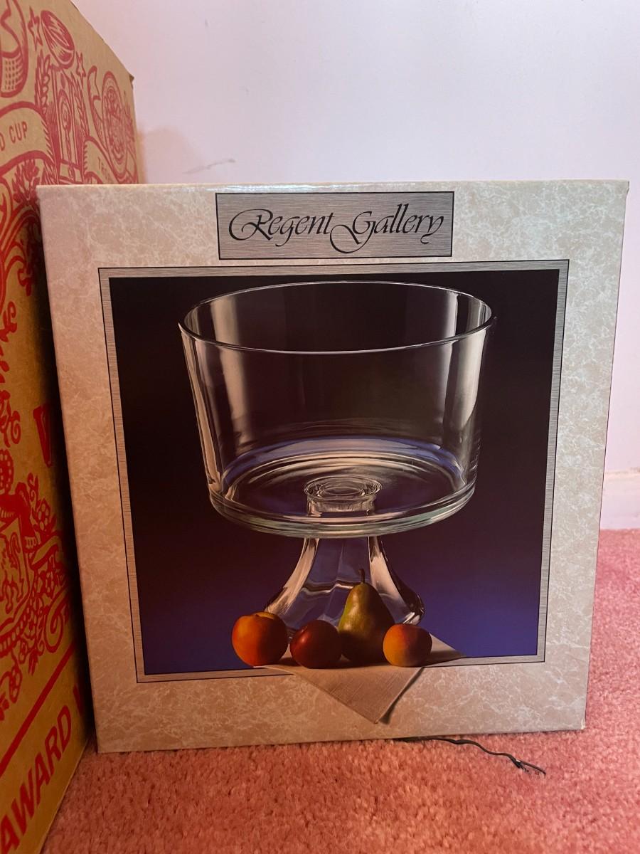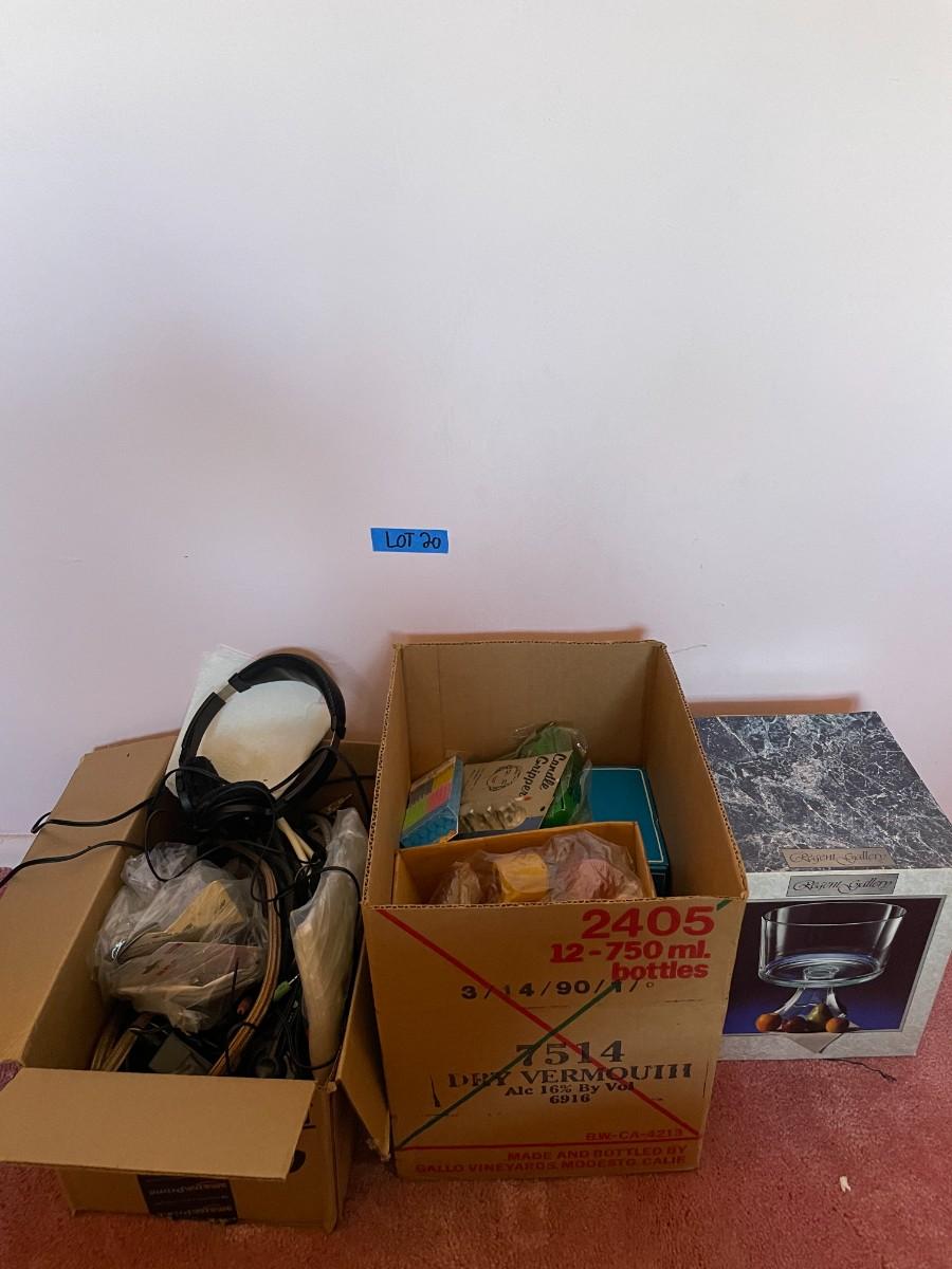 Lot 20- Regent gallery glass bowl, box of misc. candles, headphones, box of misc. cords and wires