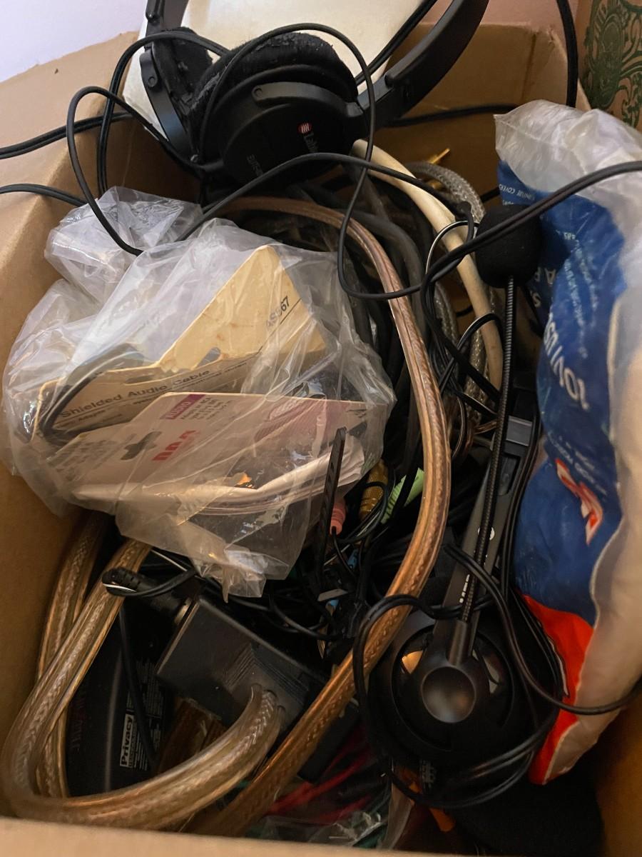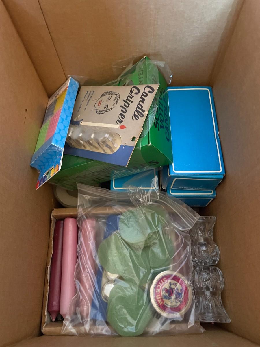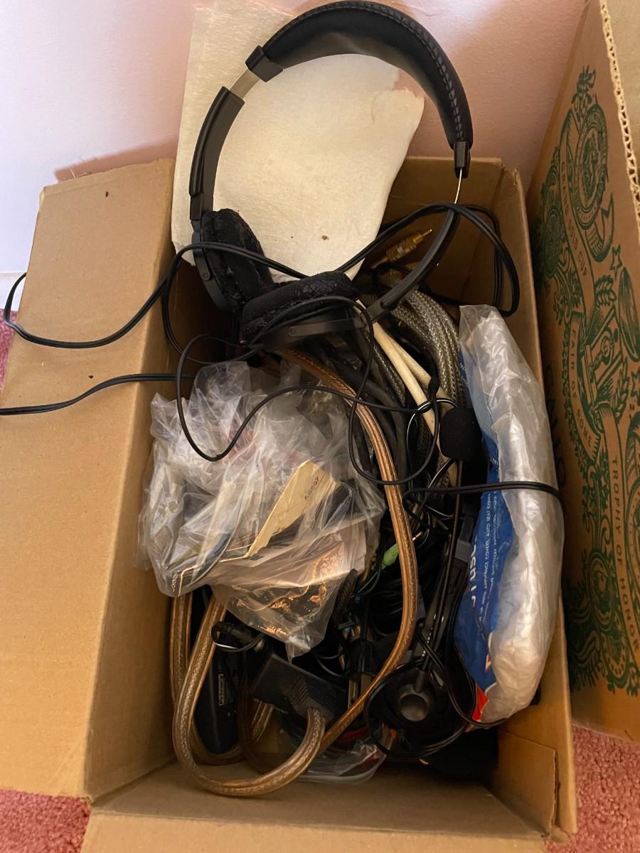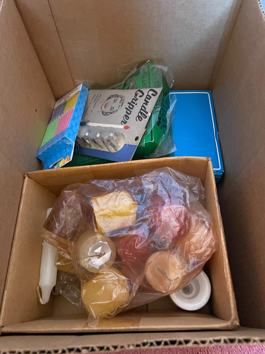 Regent gallery glass bowl, box of misc. candles, headphones, box of misc. cords and wires.