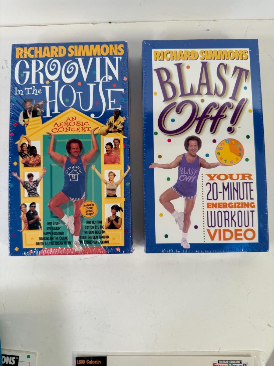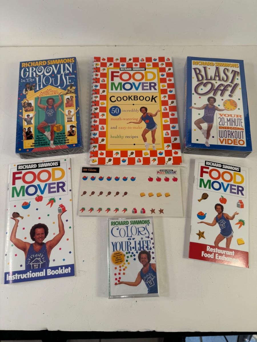 Includes Richard Simmons Food Mover Instructional booklet, cookbook, restaurant food exchange booklet, stickers, Colors of Your Life cassette tape, Blast Off! & Groovin in the House VHS tapes.