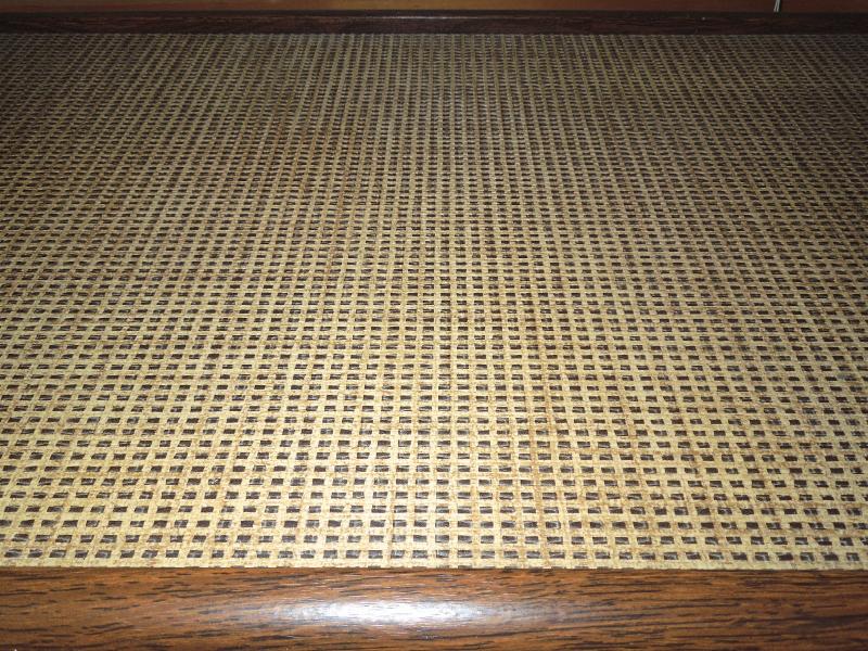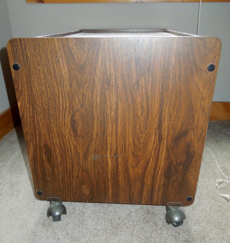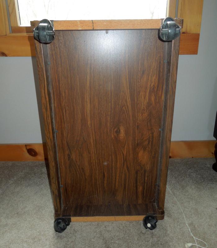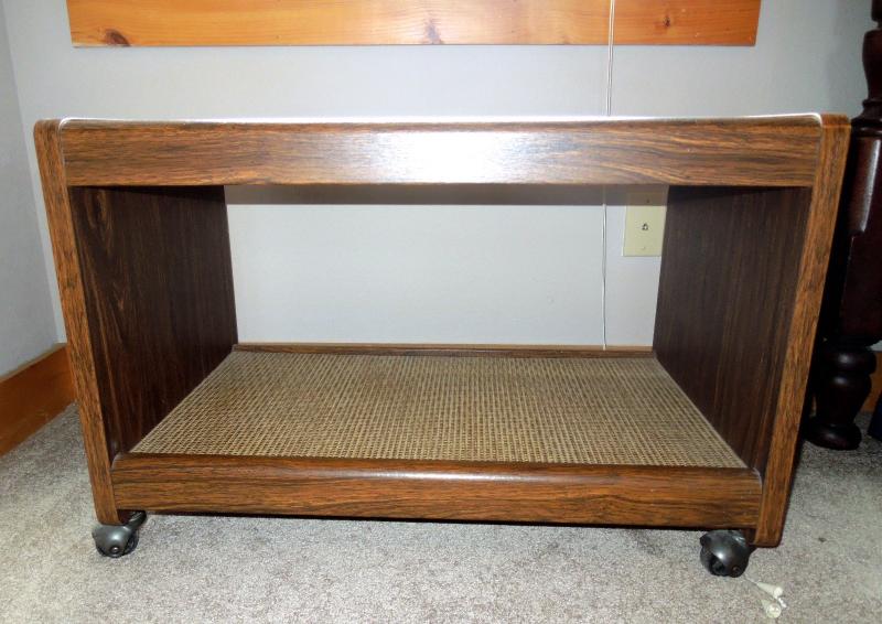 Vintage laminated pressed wood cart with faux weave bottom shelf. On plastic casters. 30 x 18 x 18. One scratch, otherwise clean.