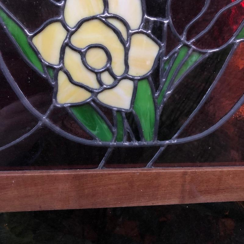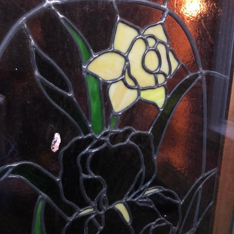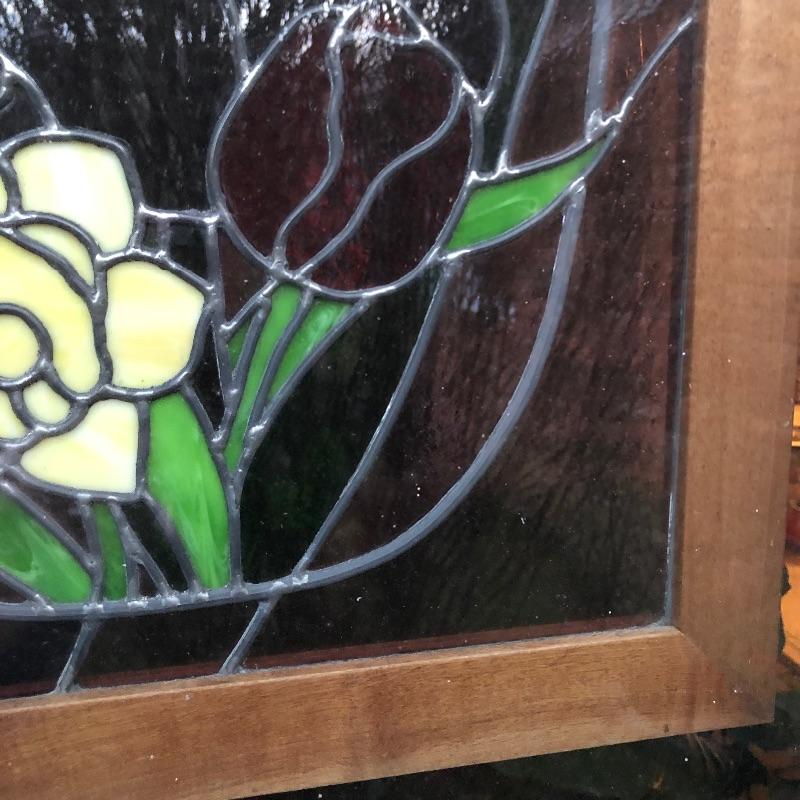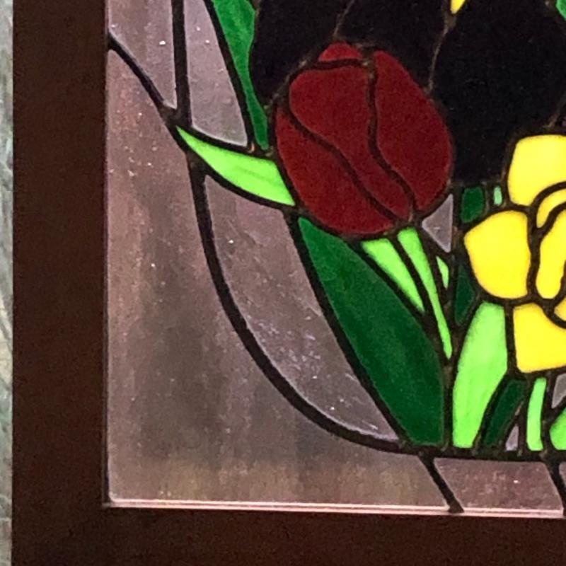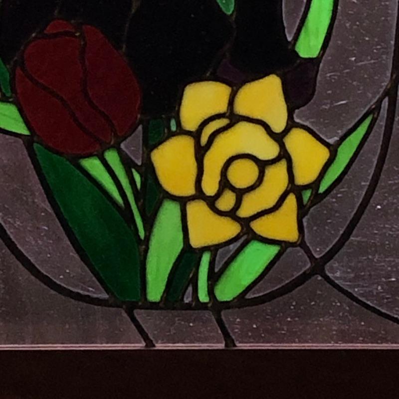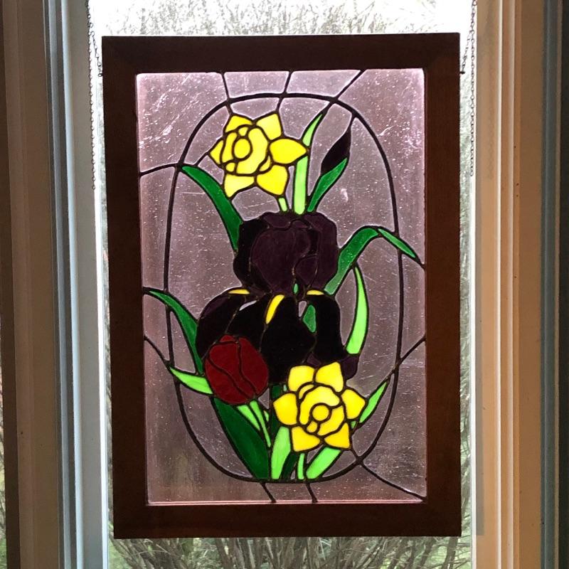 This wonderful framed and ready to hang piece of floral stained glass changes mood and color tone with the light and weather of each day, presenting itself as a unique creation never quite the same as it was prior. Daffodil, Tulips and an Iris in the mix. Shipping available.