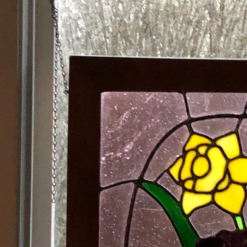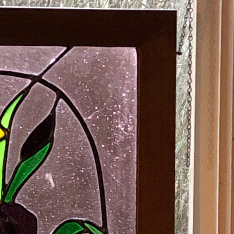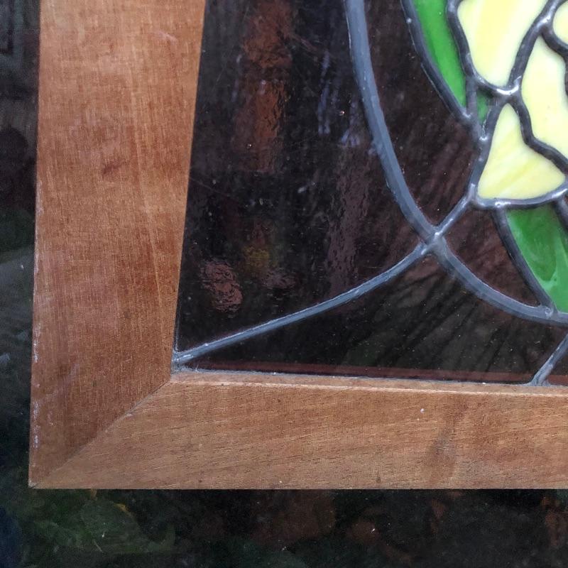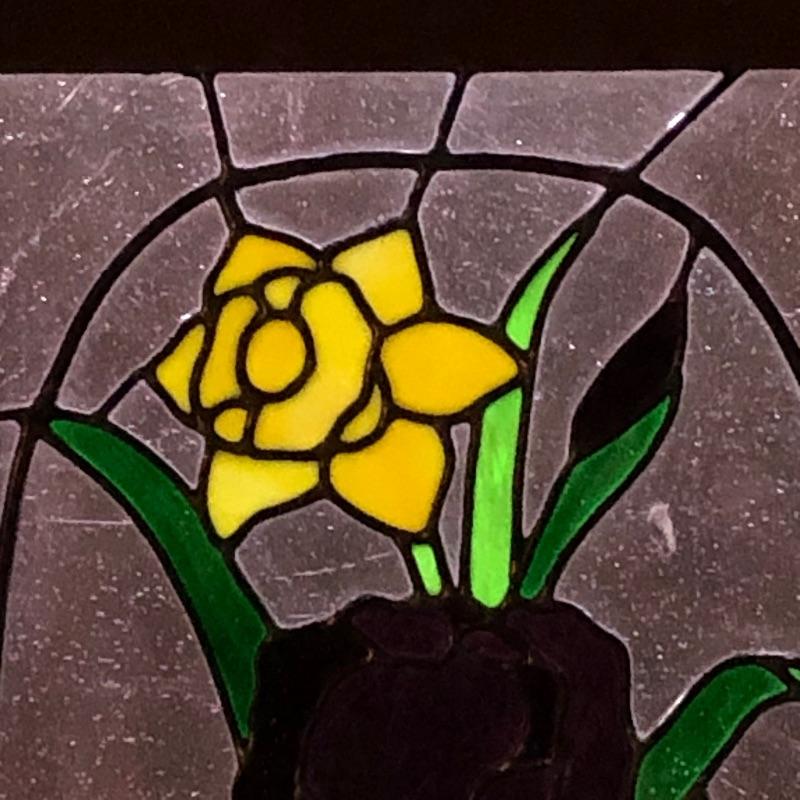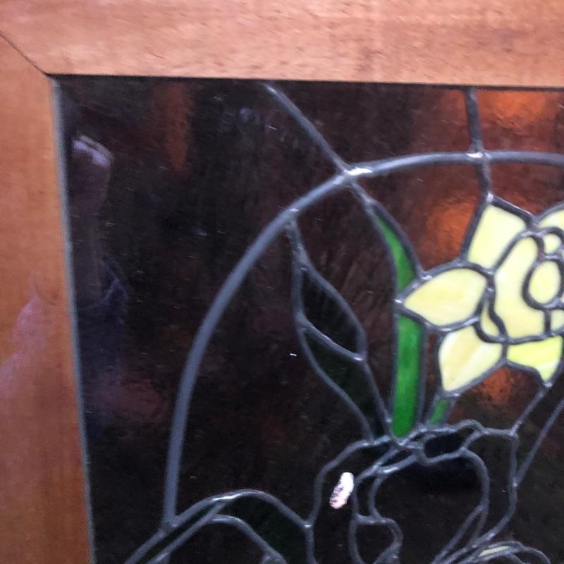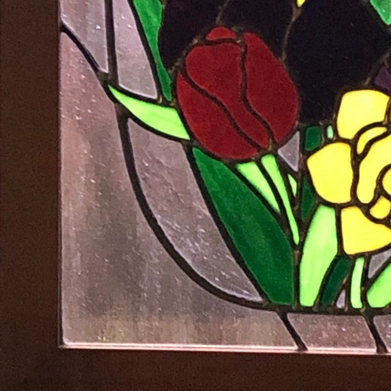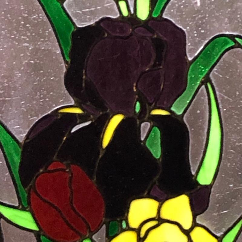 This wonderful framed and ready to hang piece of floral stained glass changes mood and color tone with the light and weather of each day, presenting itself as a unique creation never quite the same as it was prior. Daffodil, Tulips and an Iris in the mix. Shipping available.