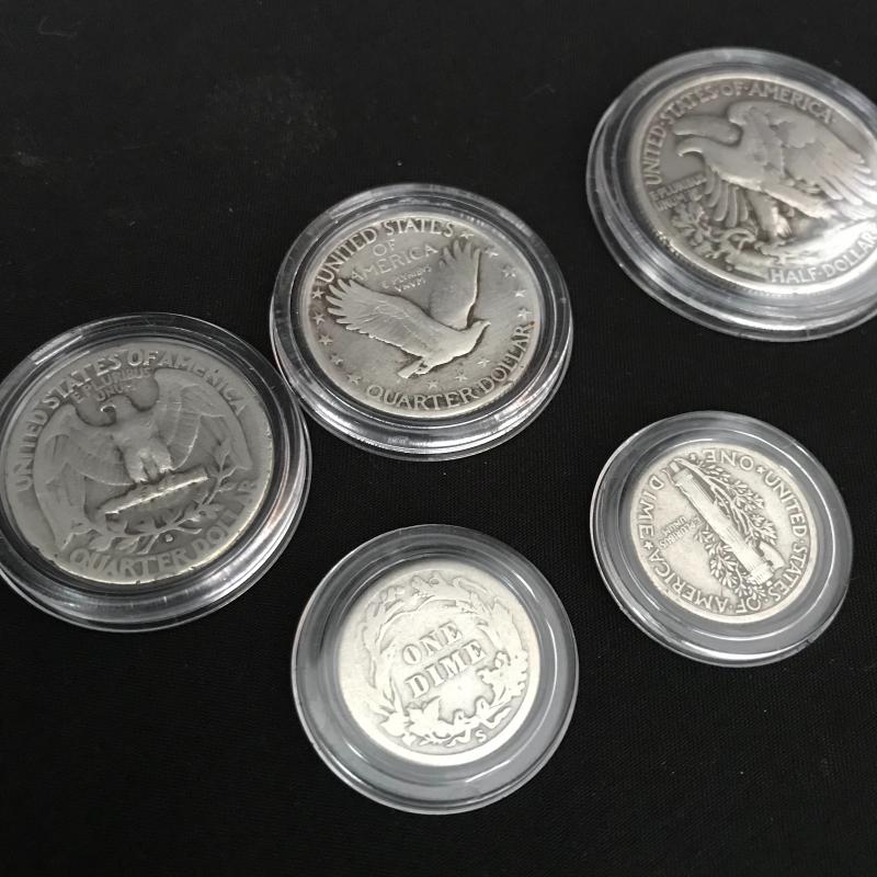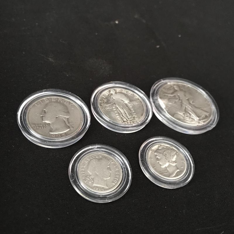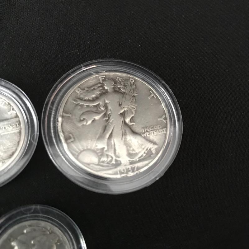 Like new, with key, coin collectors’ box. Includes 1914 Barber and 1936 Mercury silver dimes, two quarters -from 1929 Standing Liberty and Washington from 1935, and a 1937 Walking Liberty silver half dollar. All coins are in protective cases and there is extra space in the box for more of your collection display. Box measures 9” x 5.5” x 4”h Shipping available.