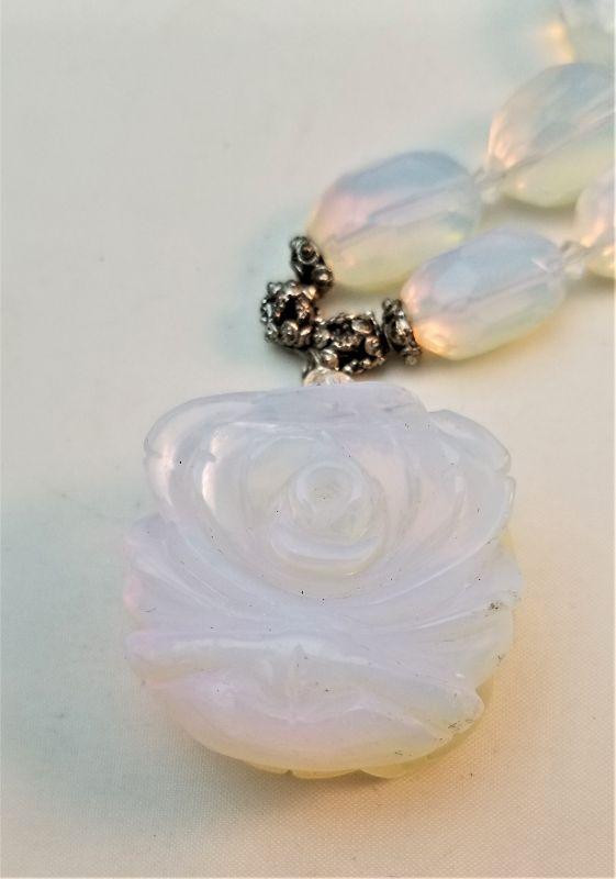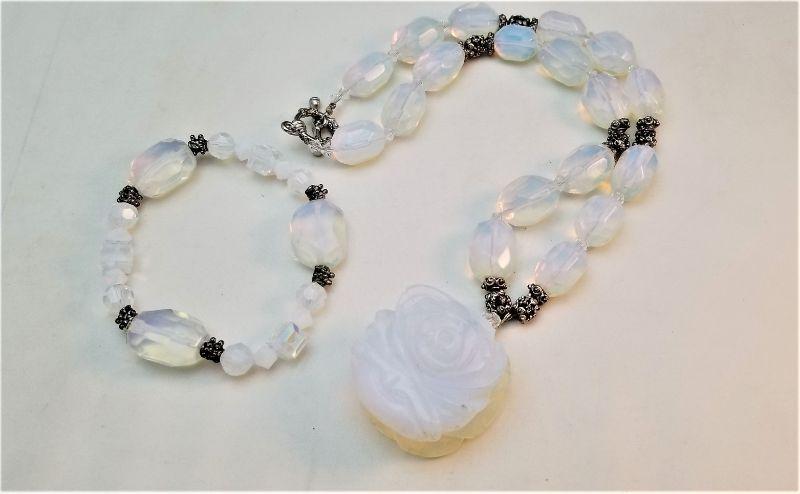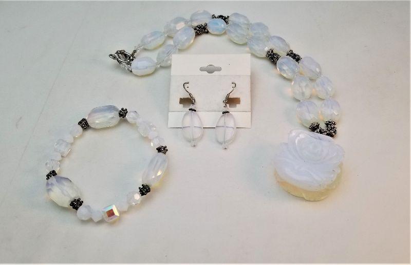 Carved blue/milky white quartz set - necklace has a rose motif. Set in silvertone - toggle clasp. Bracelet is a stretch bracelet with silvertone accents. Earrings are pierced and are 2 inches long. If you are looking for something "different" - this is it. Necklace is about 21" long. Bracelet would fit up to about an 8 inch wrist. "Rose" on necklace is about 1.5" across.