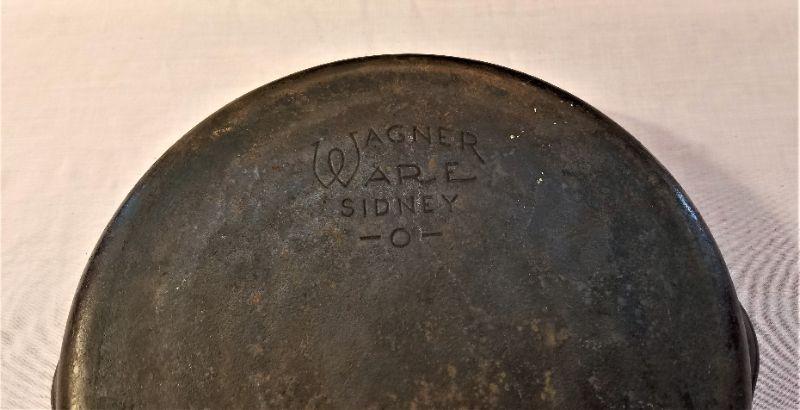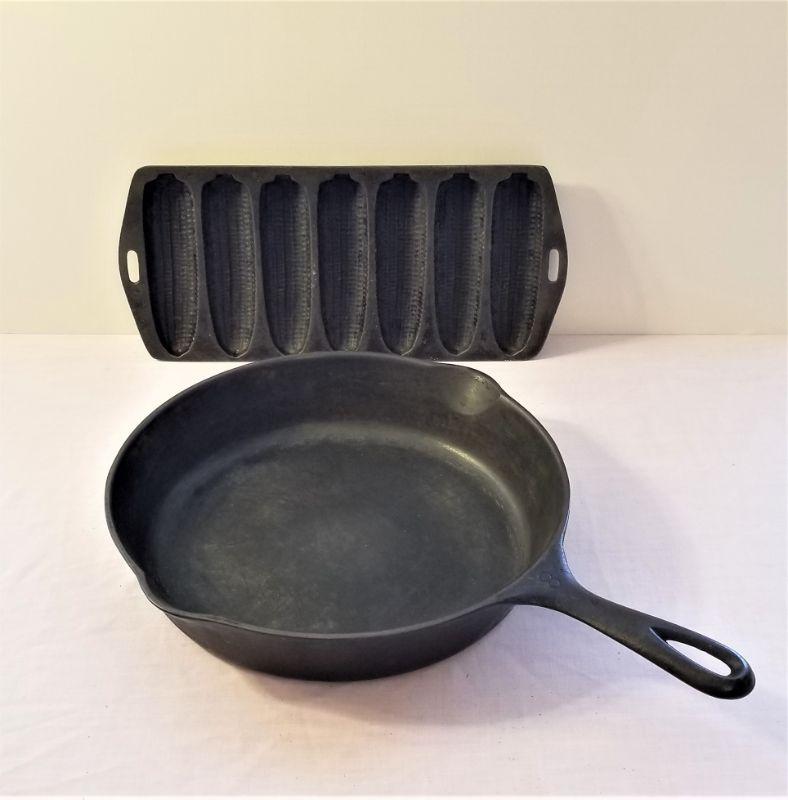 #8 Wagner Ware (marked) cast iron skillet (11" x 15" counting the handle" and a vintage corn stick pan - no maker's mark, measures 12" x 5.5". Both in good vintage condition.