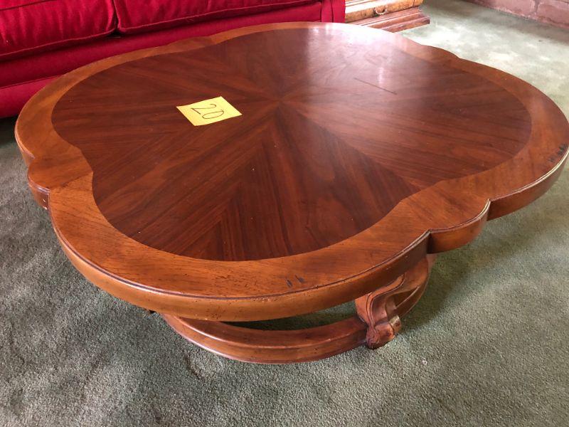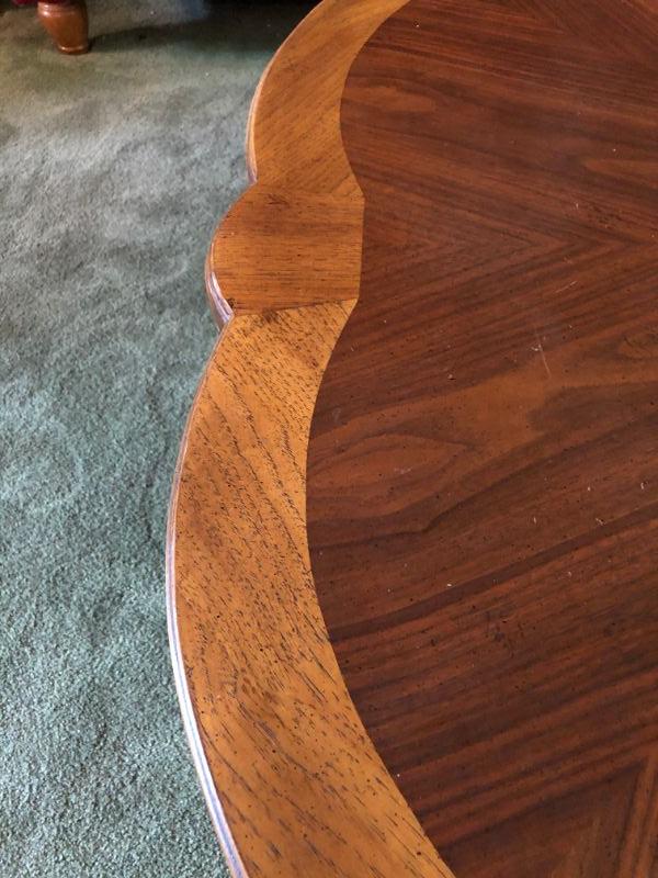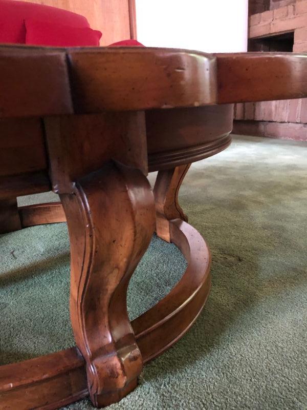 Vintage, ornate shape, wooden coffee table, multi color wood. 16in tall X 43in circumference