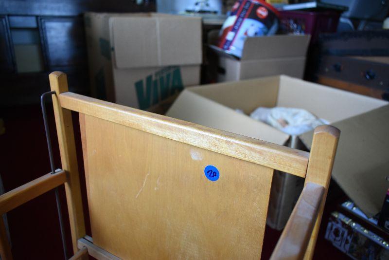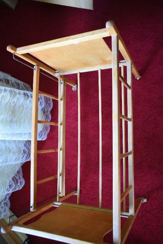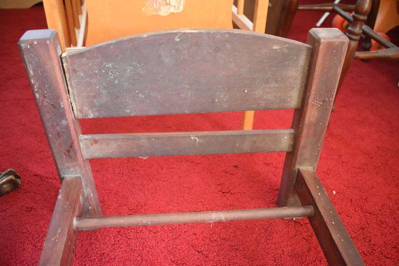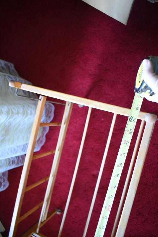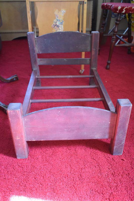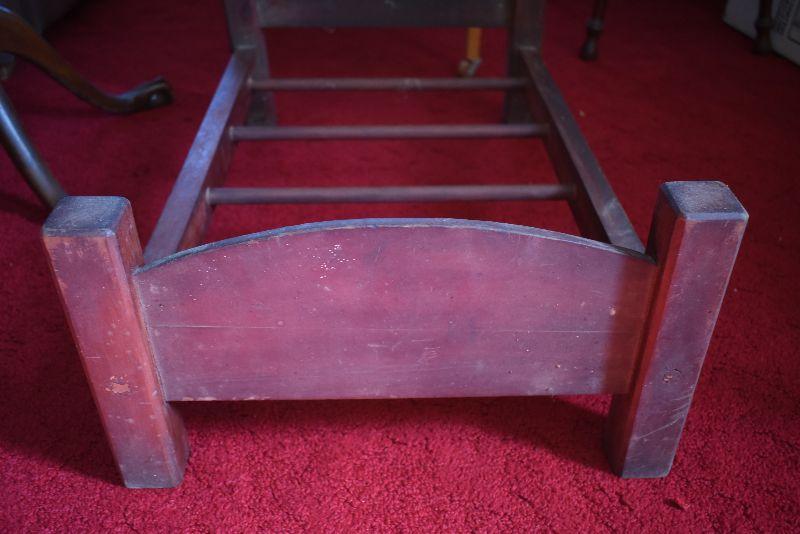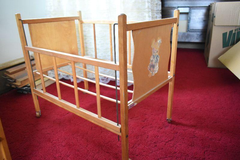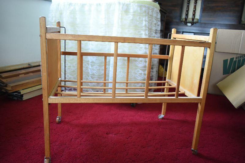 Wooden crib on wheels and a wooden bed that needs repair. Bring help to move from second floor.