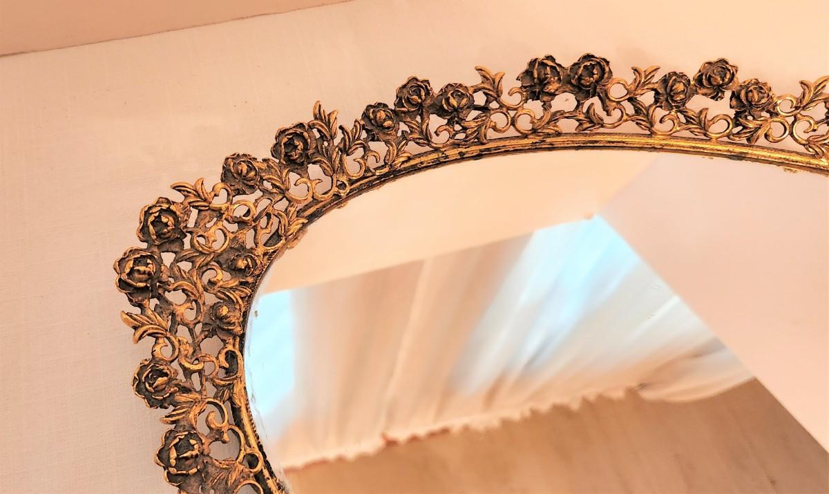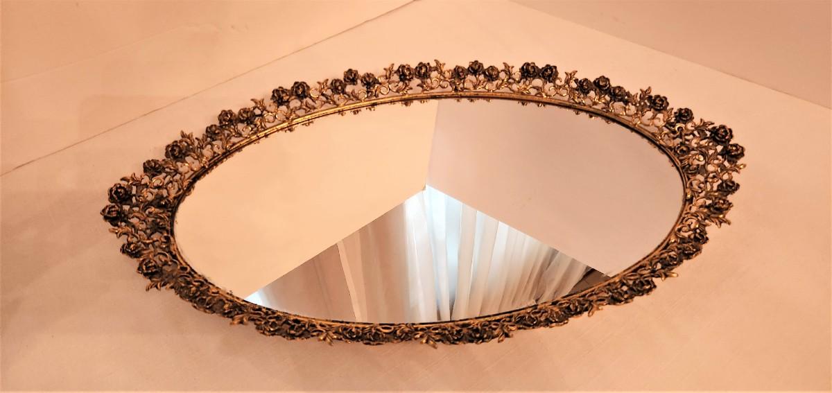 Very pretty - vintage mirrored oval vanity tray - gold tone rose motif. Excellent vintage condition, 21" x 12" across.