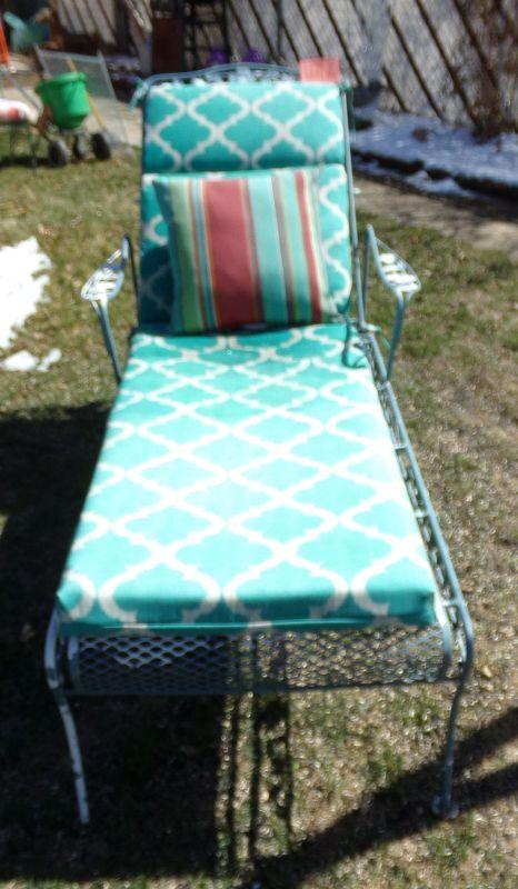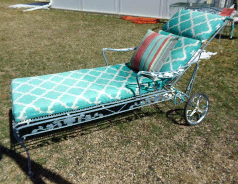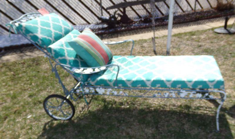 Lounge chair has 2 wheels to make it easy to move. The backrest is adjustable with several positions. In need of a new coat of paint.