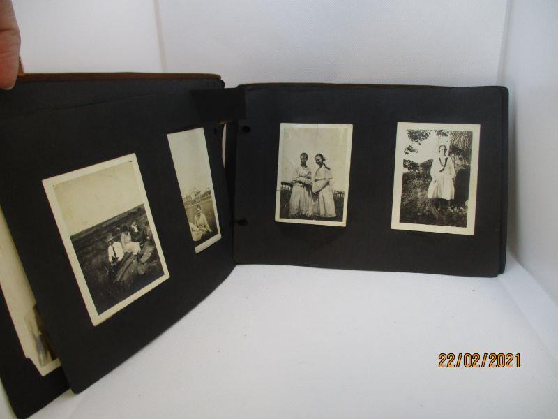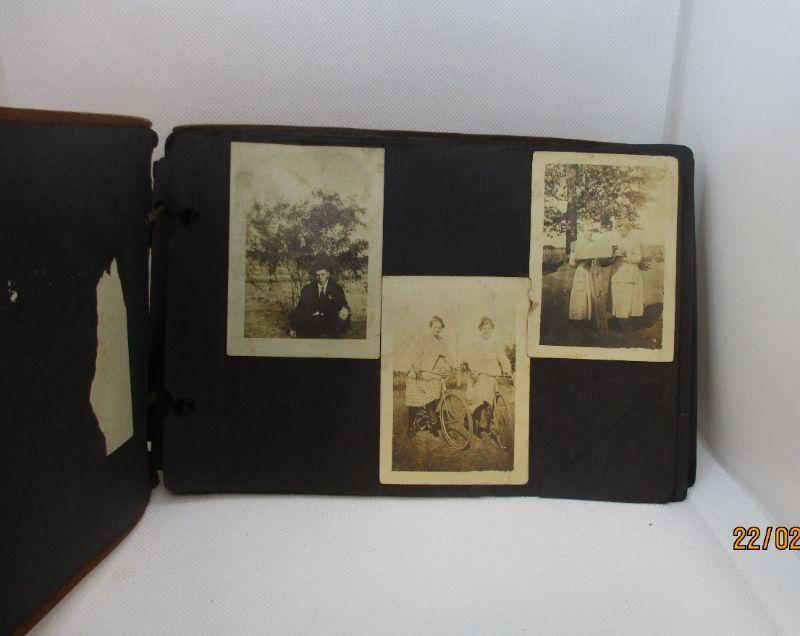 The cover of this book feels like suede/leather. It has over 20 black and white photographs that all appear to be from the 1920s-1930s era and on a farm/homestead. The book has some loose pages, and a couple of pages have the picture cut out, but it is in mostly good condition. There are also quite a few never used pages for you to add more vintage pictures to.